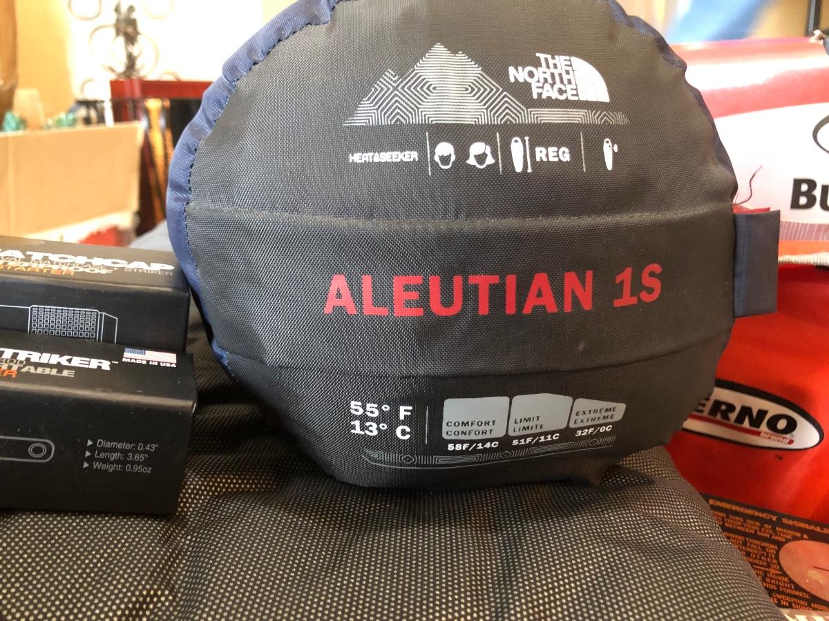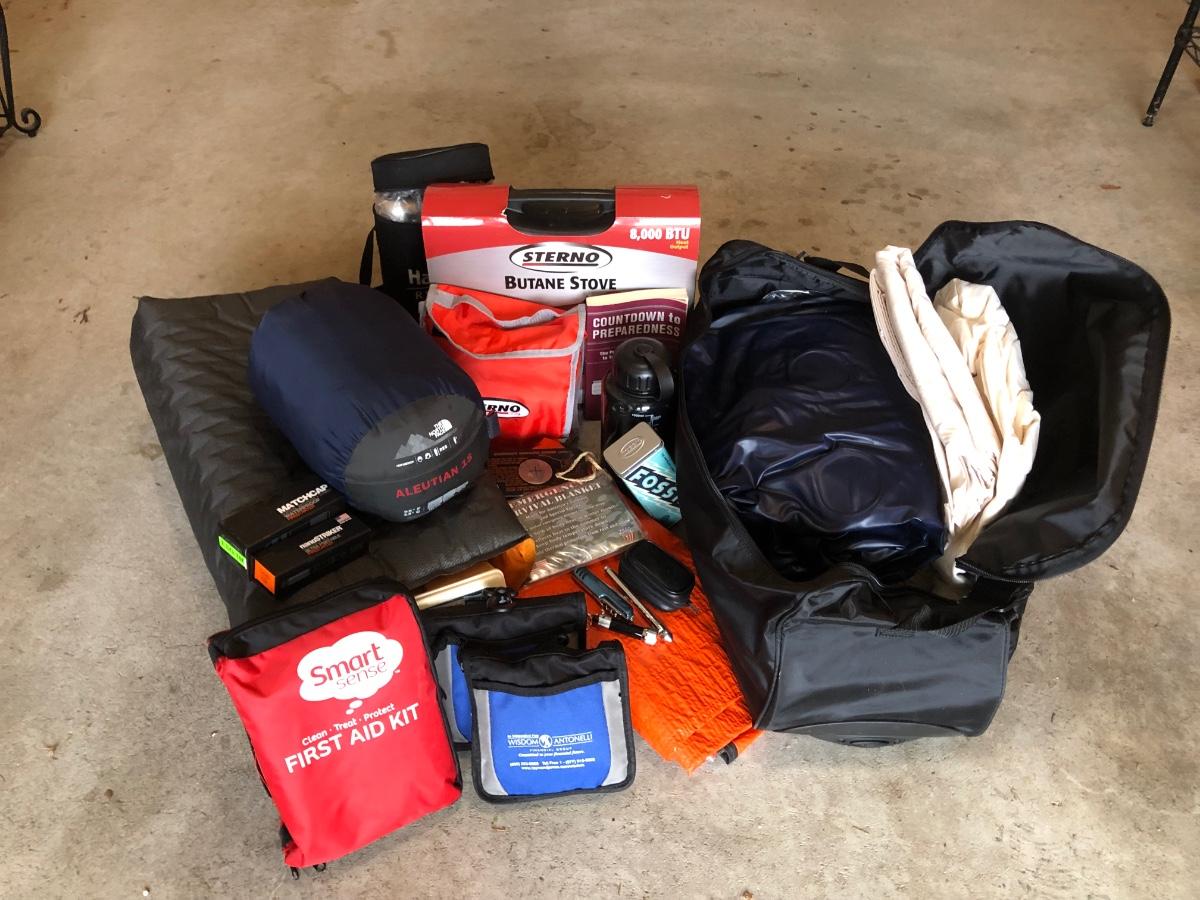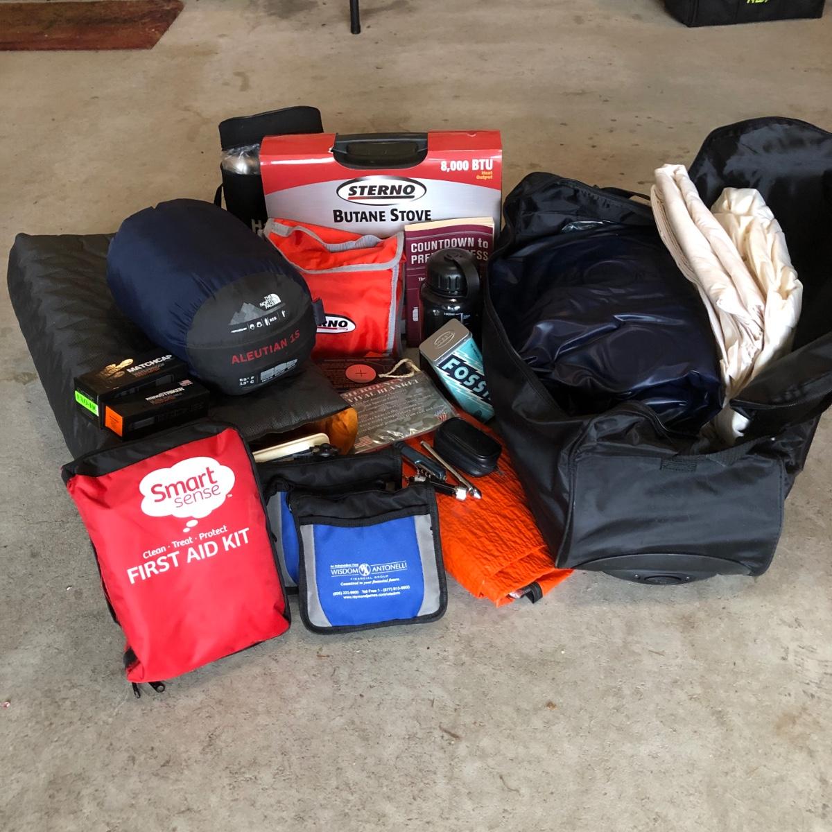 Includes a Swiss Gear air mattress with bag, a Thermarest blow up sleeping mat, a Sterno Butane Stove and replacement burners, a Northface sleeping bag, first aid kits, a mess kit and more!