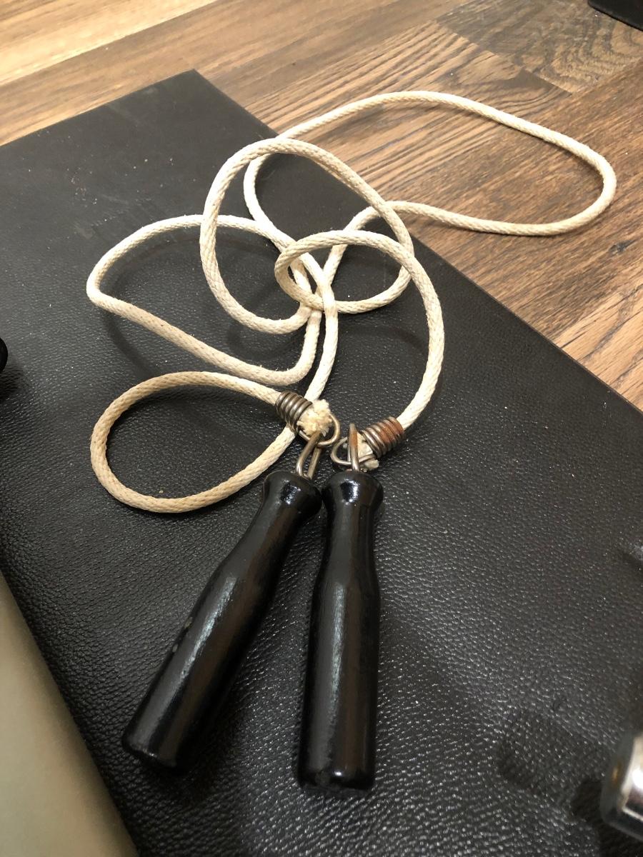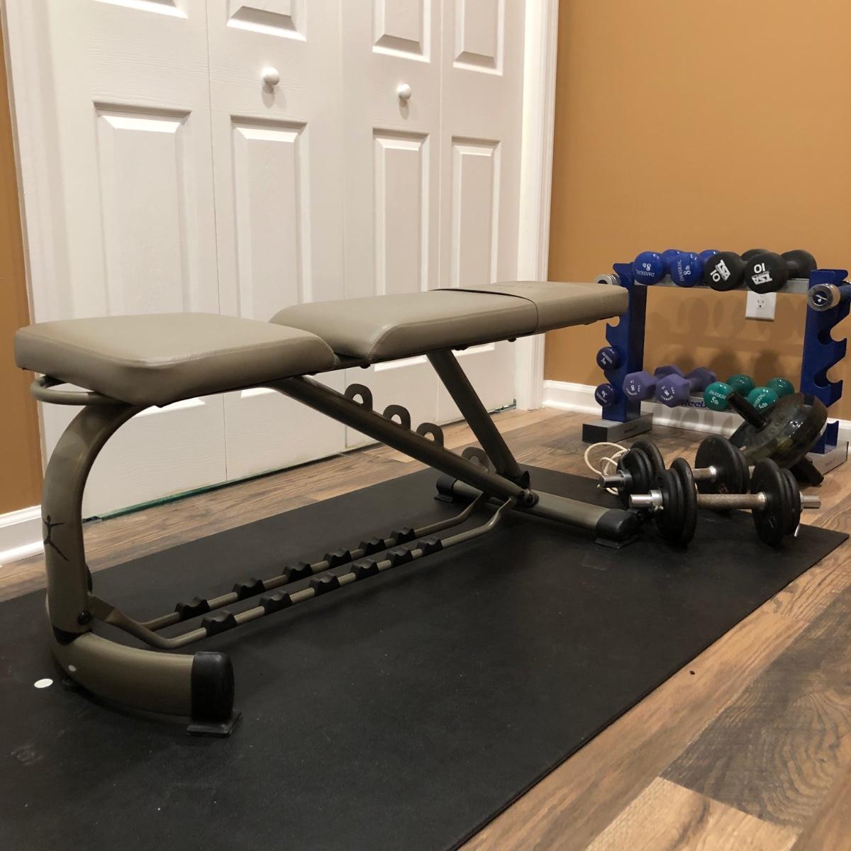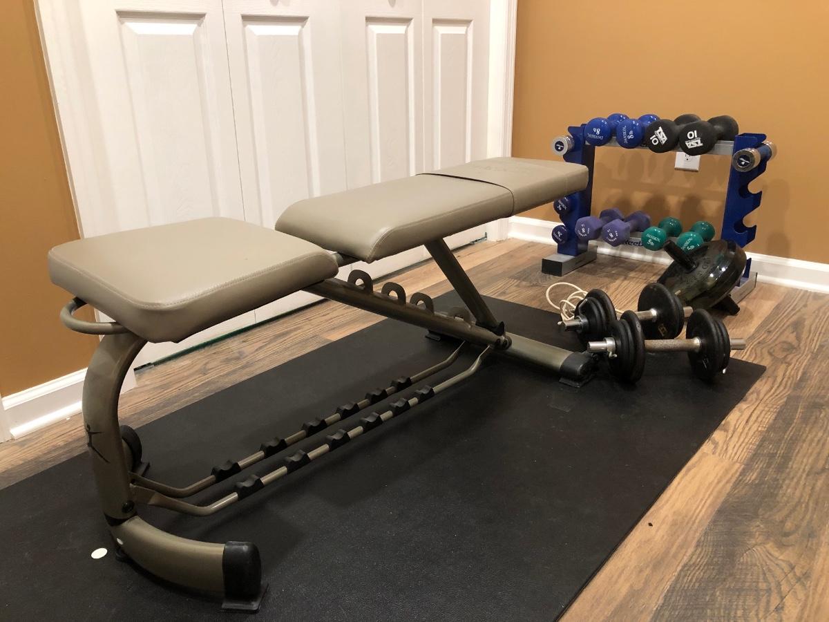 Includes weight bench and mat, weight rack with weights, a Gyro Grip roller, and a jump rope.