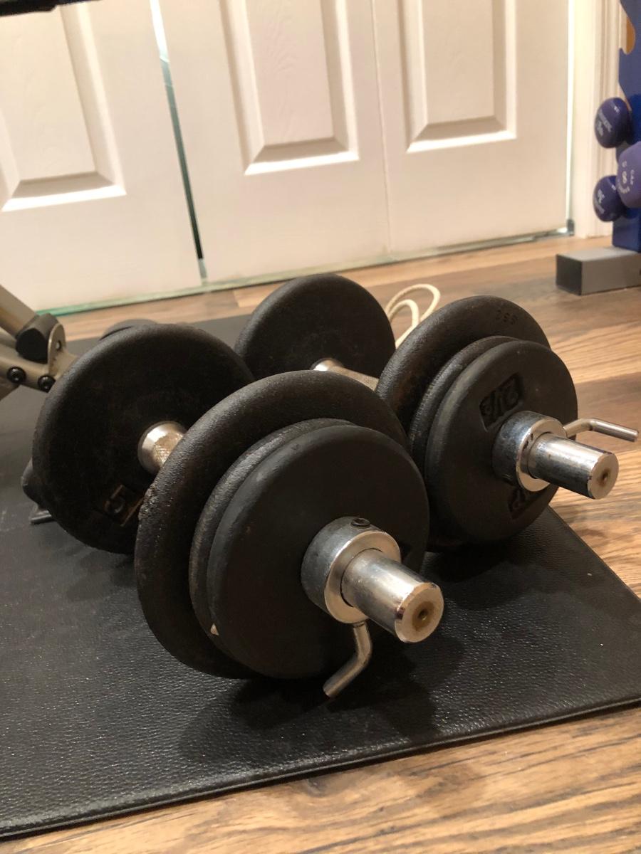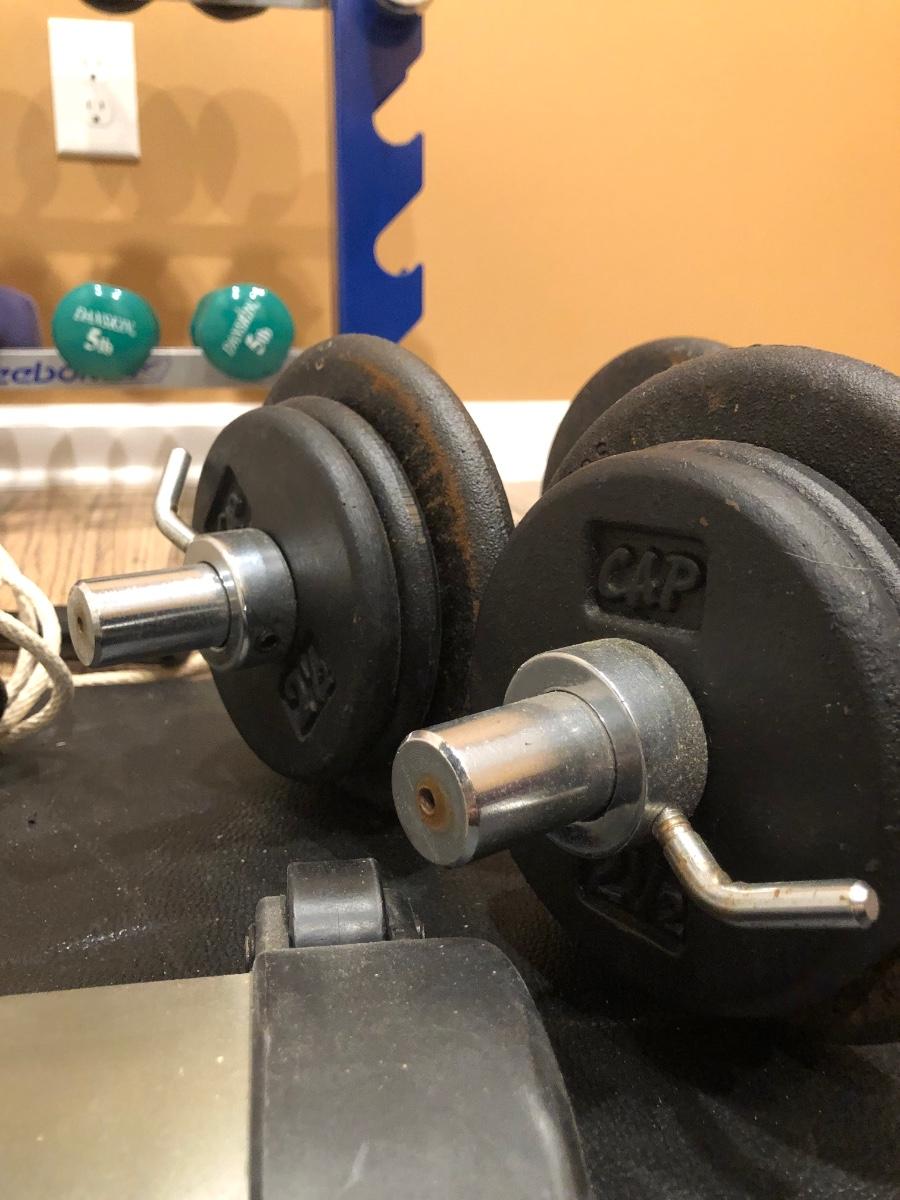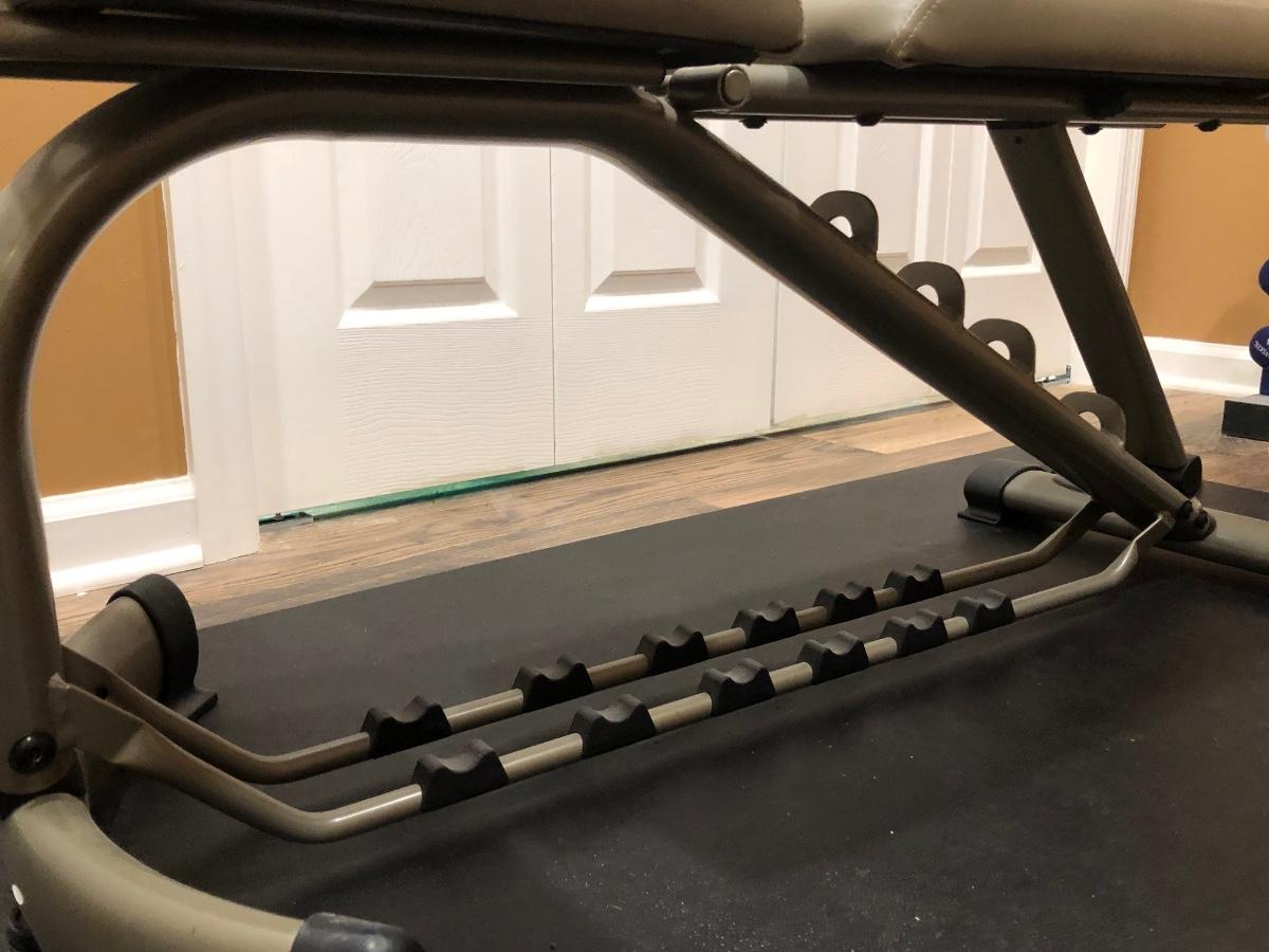 Includes weight bench and mat, weight rack with weights, a Gyro Grip roller, and a jump rope.