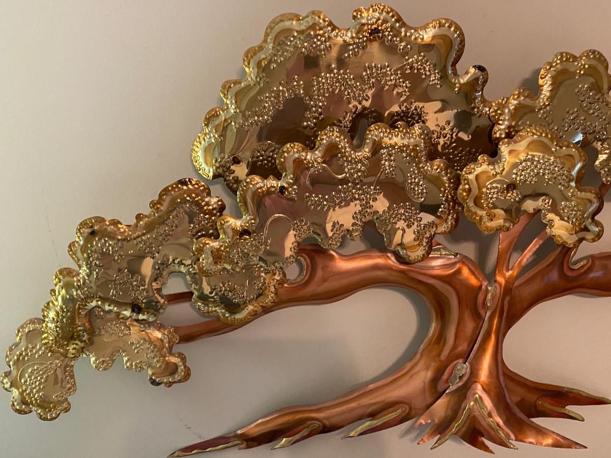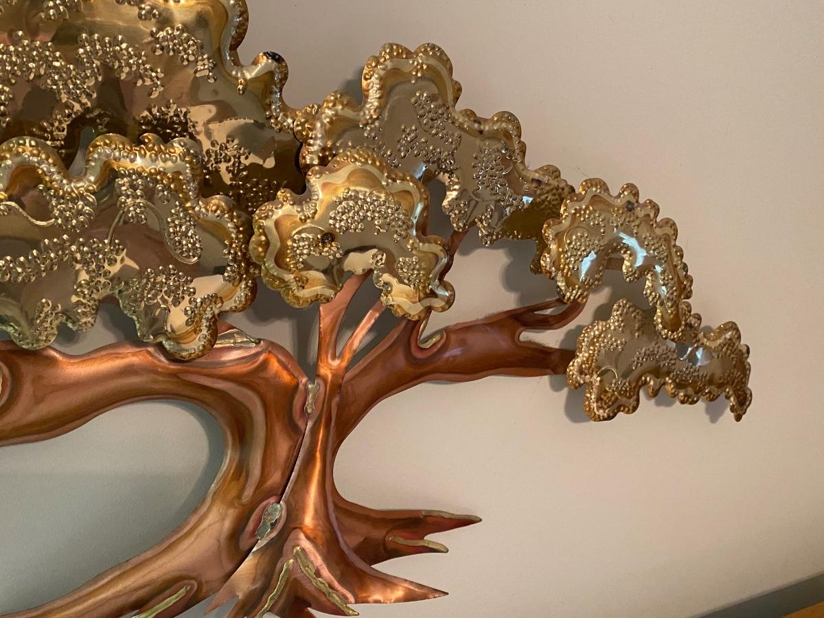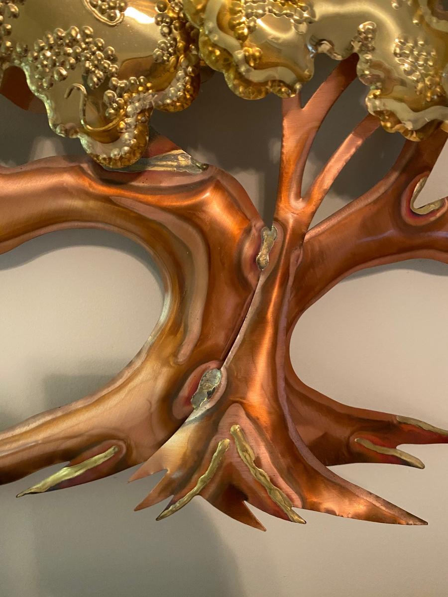 Metal tree is 40”x19”. Multi colored copper and gold tones.
