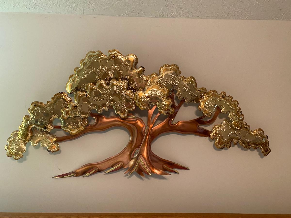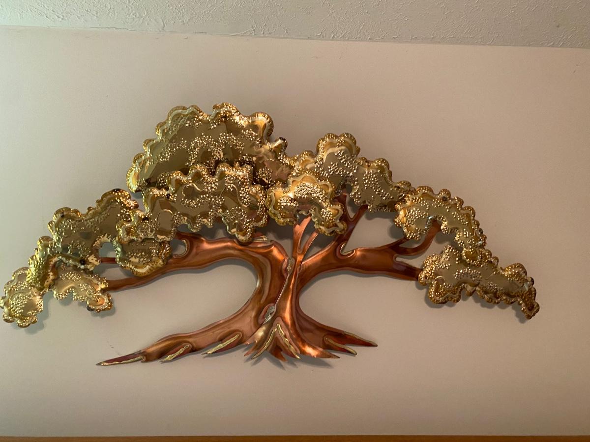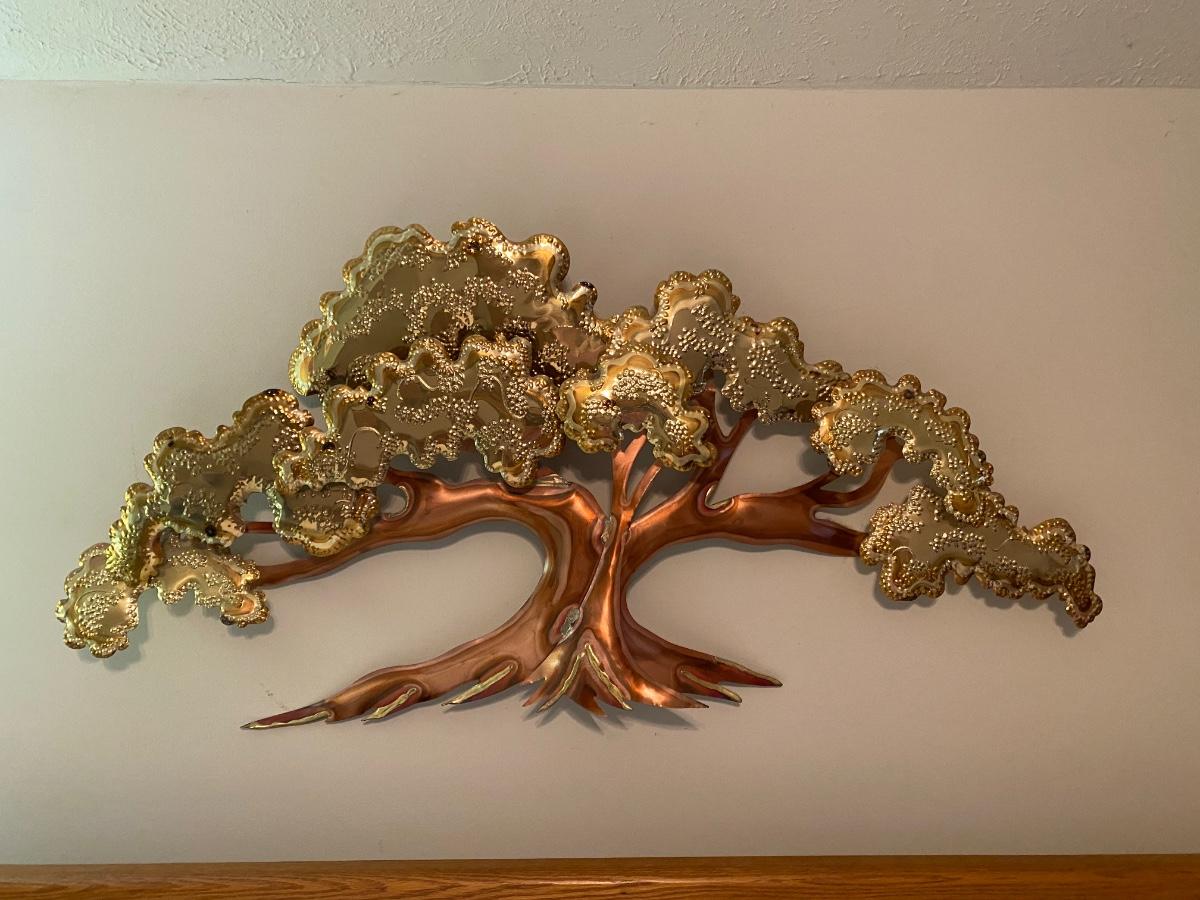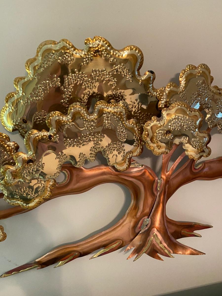 Metal tree is 40”x19”. Multi colored copper and gold tones.