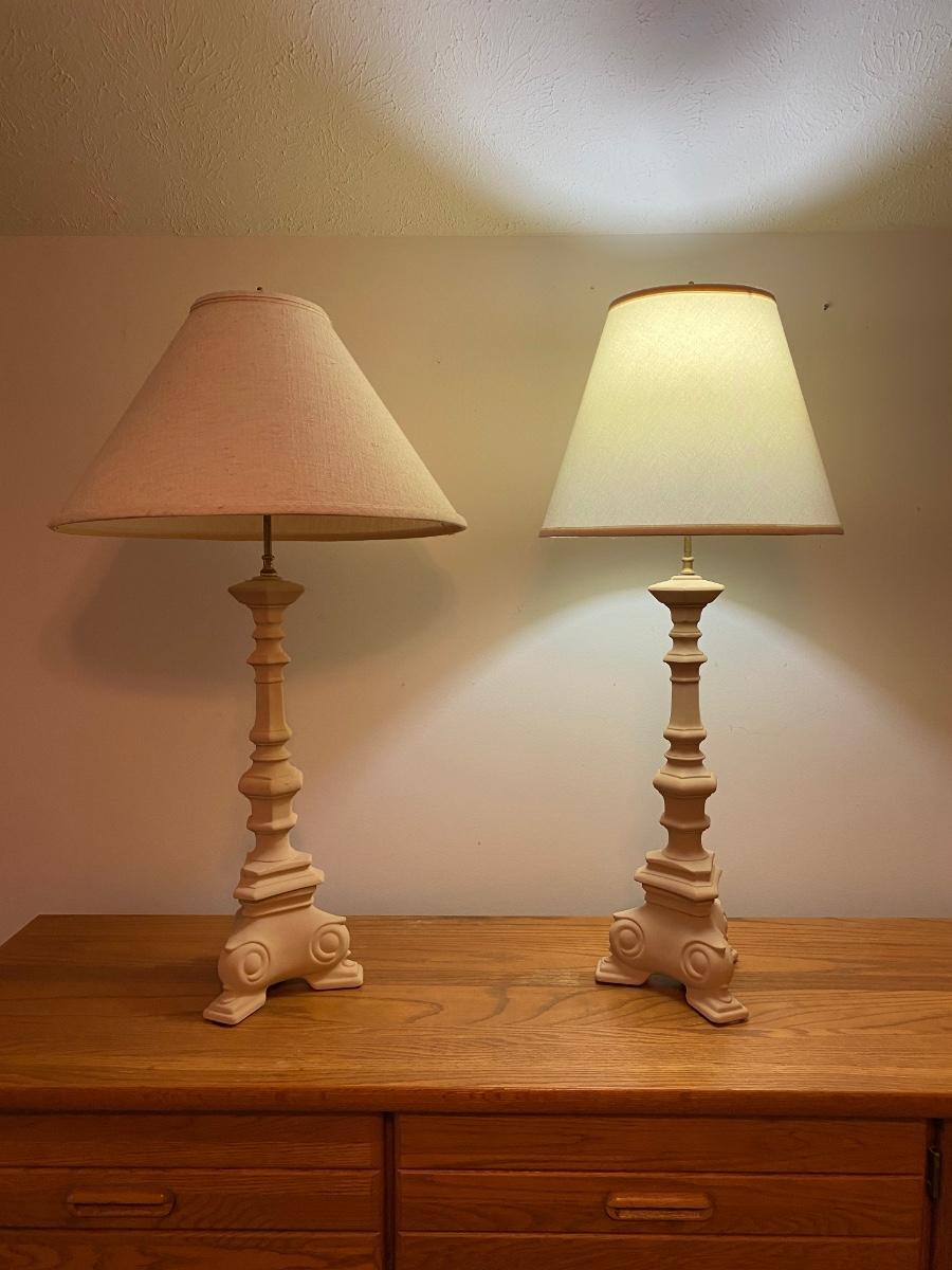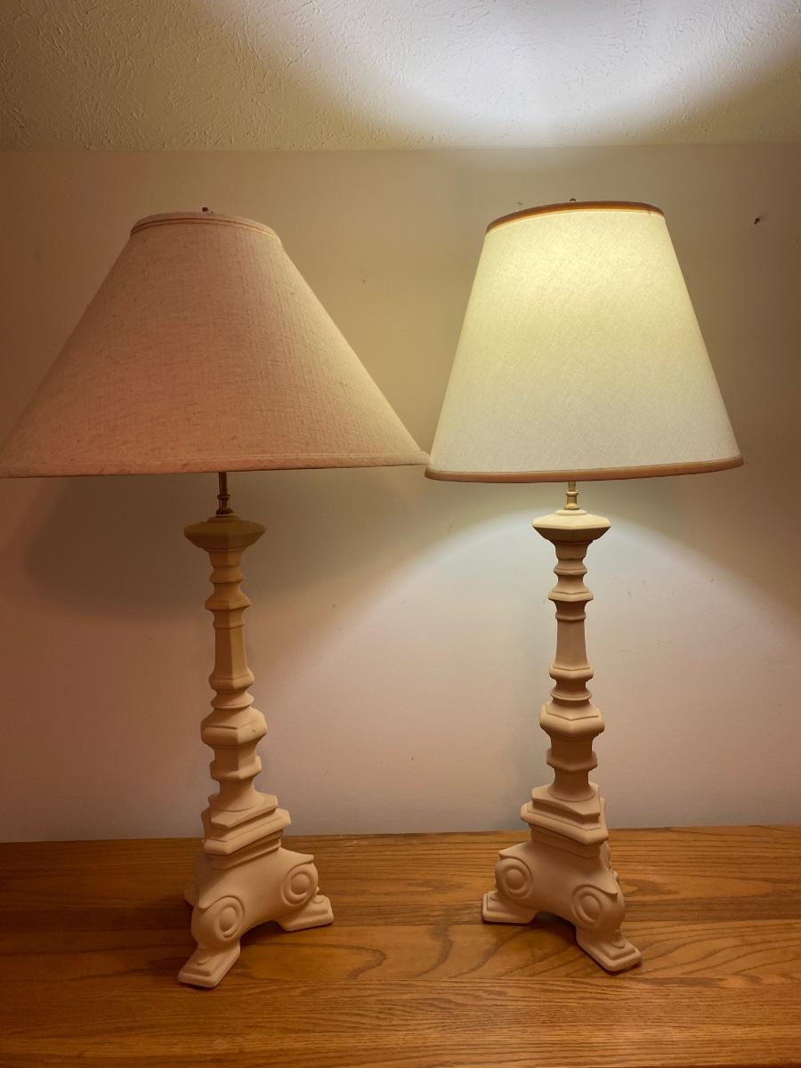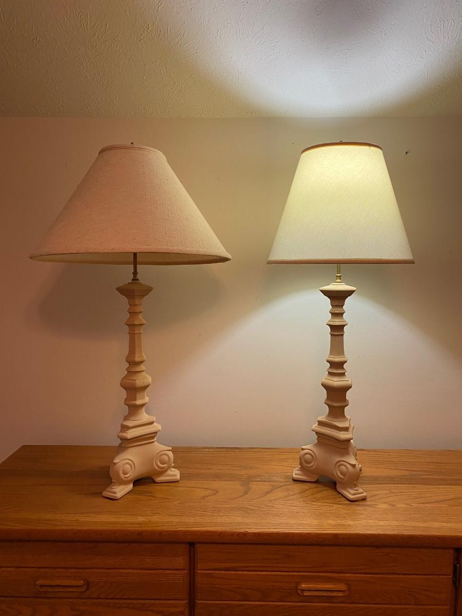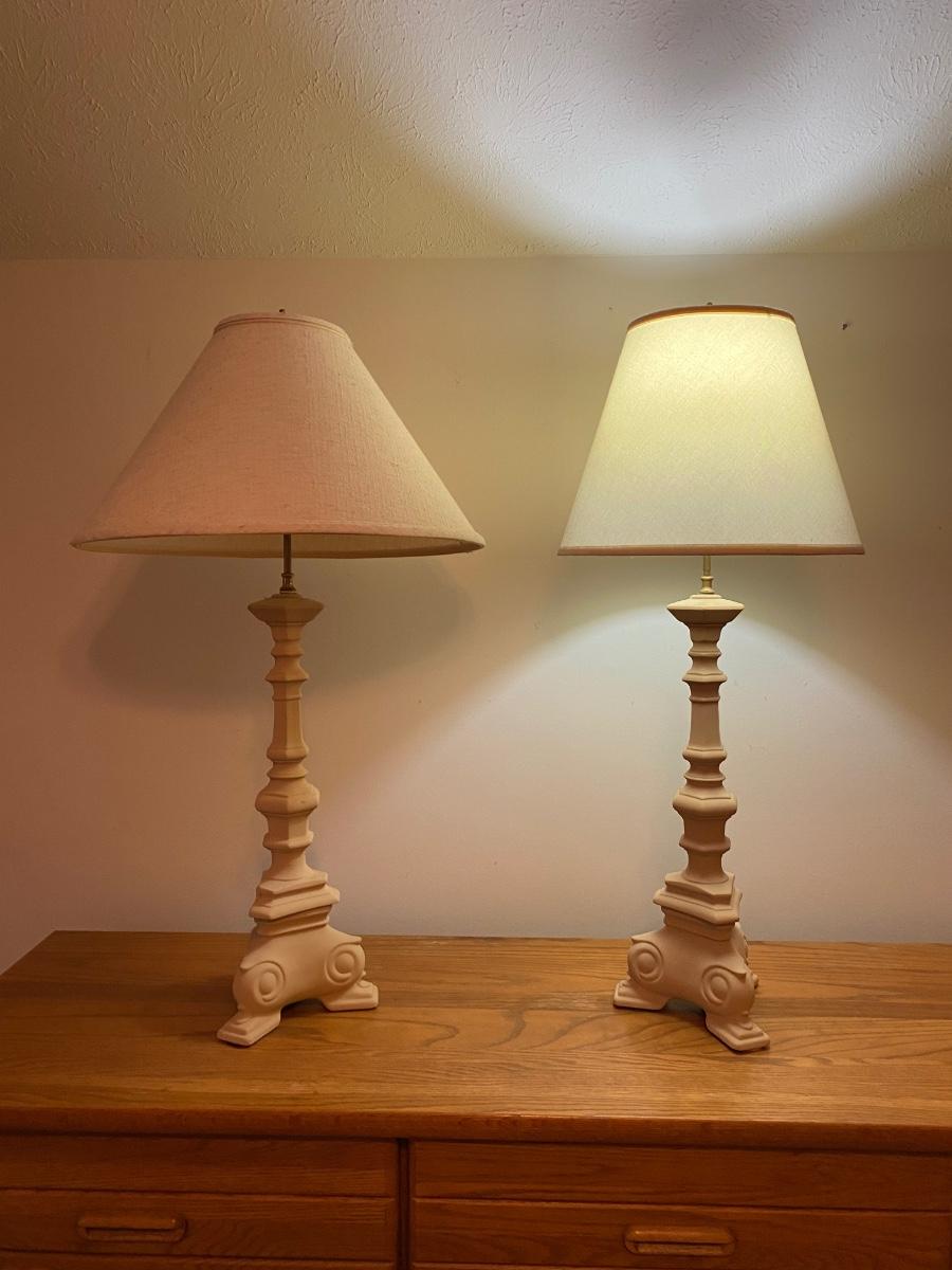 Pair of matching lamps 35” in height. Lamps have unmatched lamp shades. Please see all pictures as they are the best representation of the items. The pictures show condition, measurements if taken, and what is included in the lot. Due to the large amount that we photograph and the time frame, we are not always able to take measurements. All items unless noted, are pre-owned and have been used. If you purchased furniture, you must bring help. We do not allow one person to carry large furniture out on their own. Bring help, tools and a truck for the safety of our client’s homes, and your personal safety. Any damages that result to the property including walls, and floors due to moving of the furniture will be charged to the buyer. Company policy. Thank you.