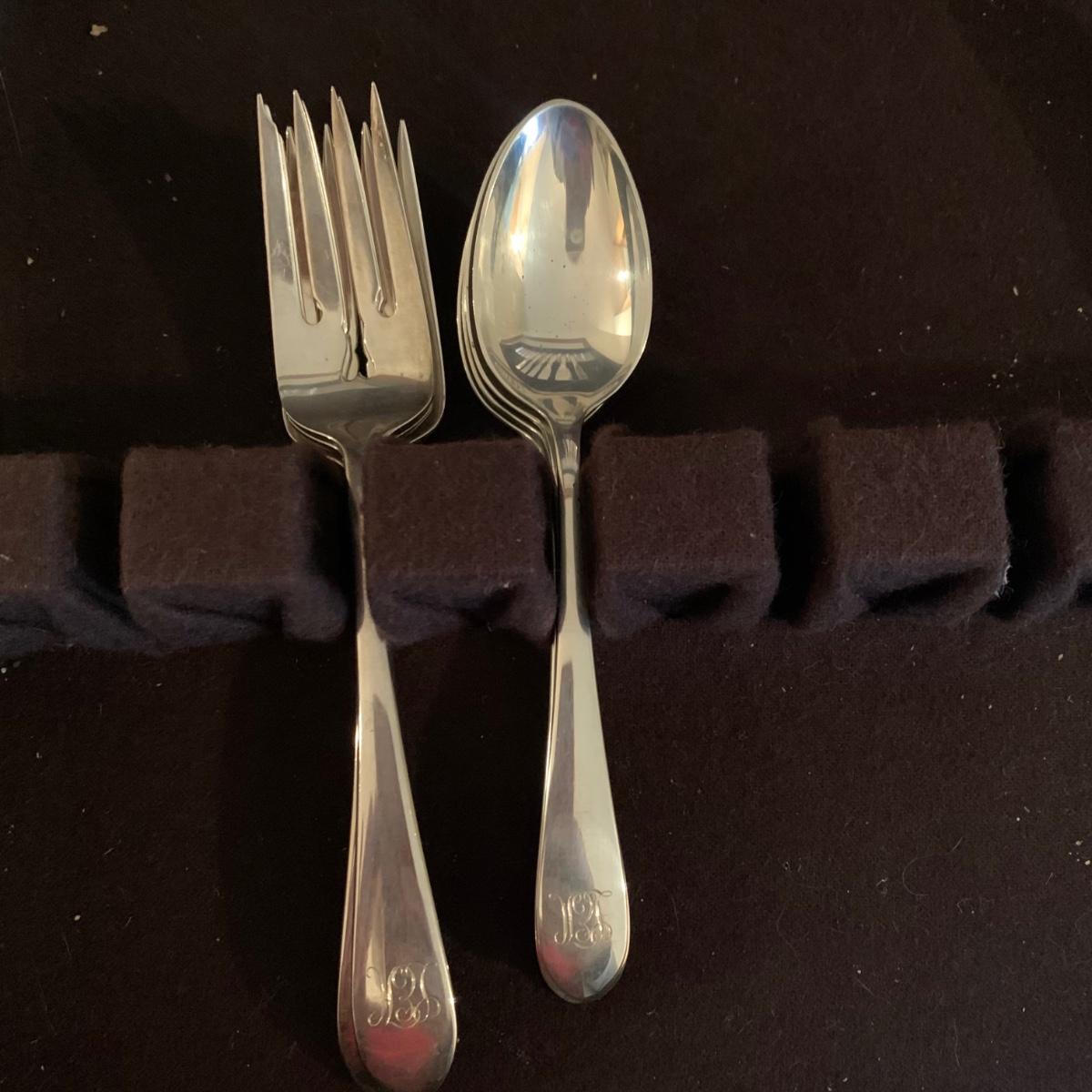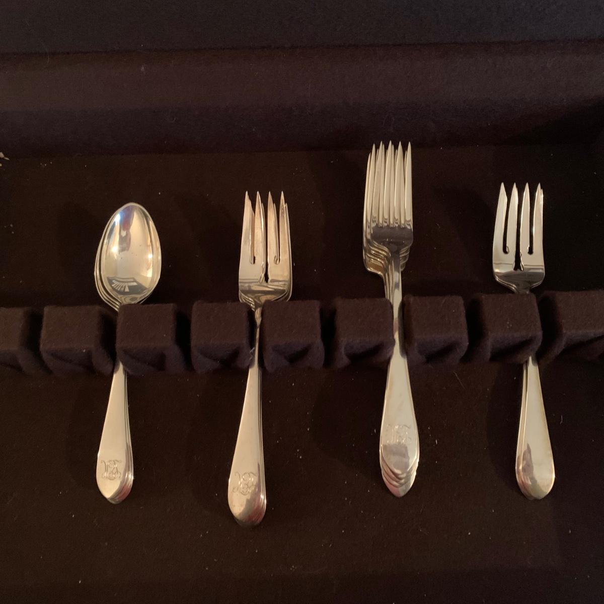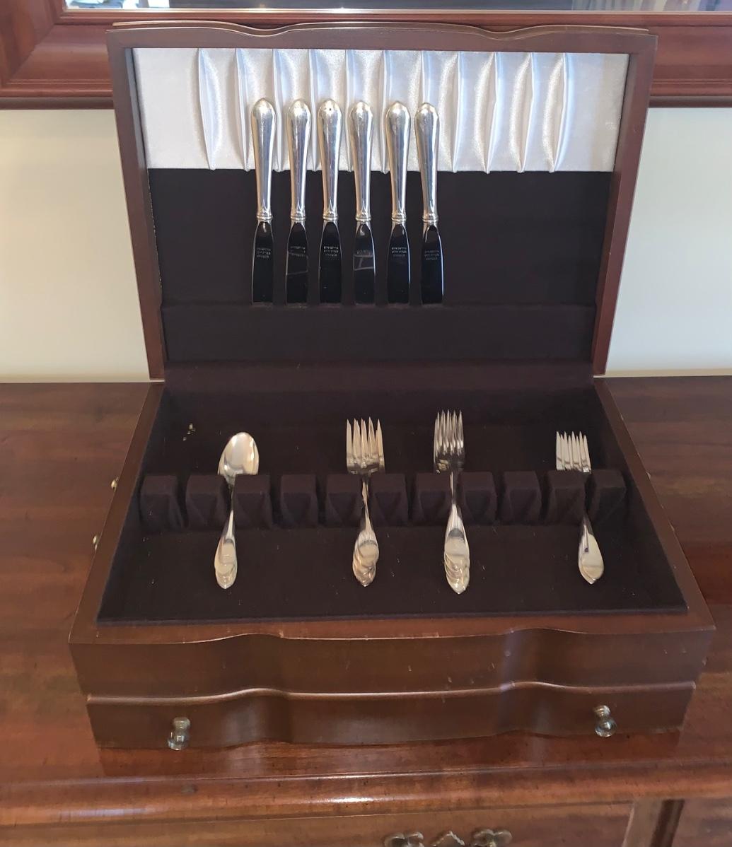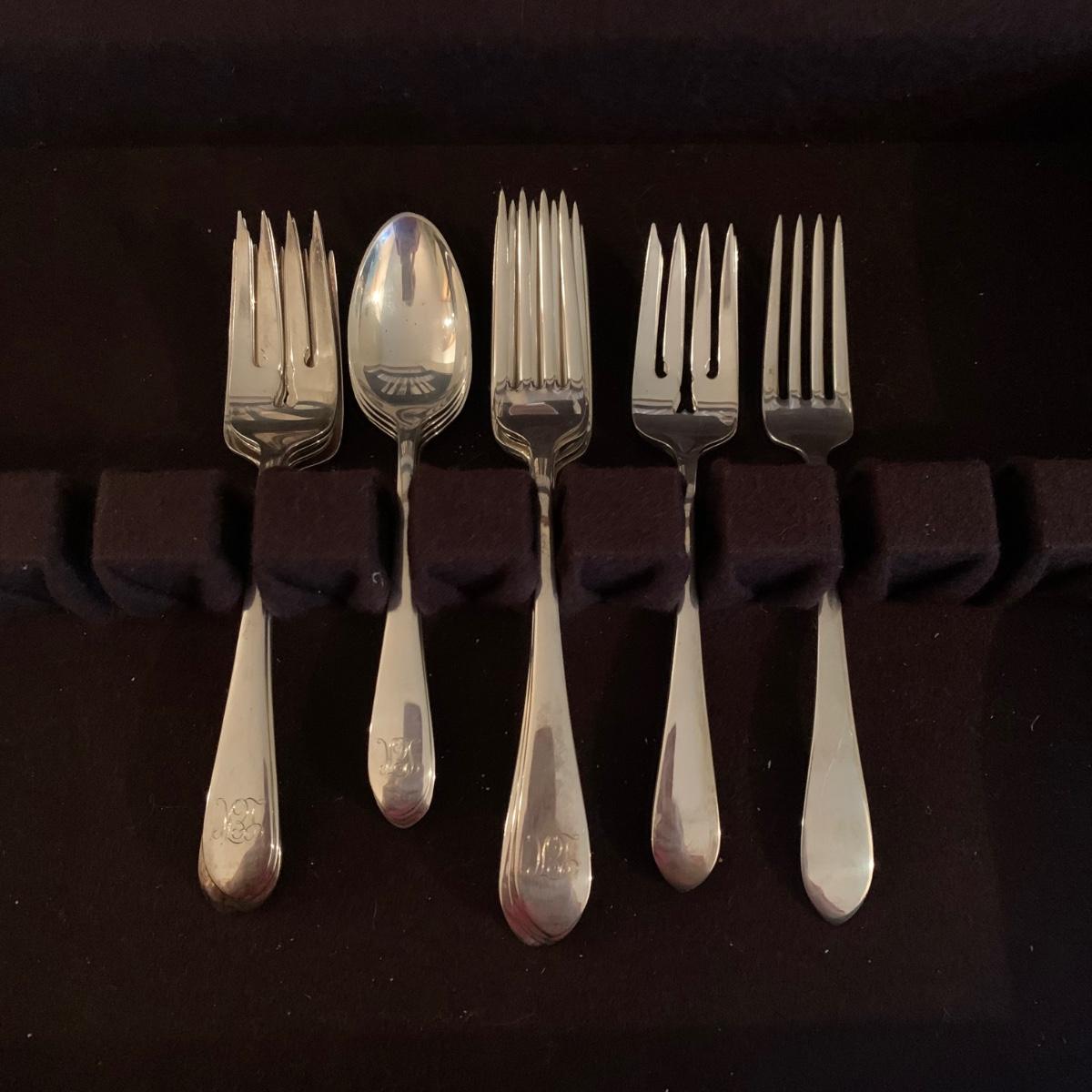 22 pieces in all of Gorham Sterling Silver. 19 engraved pieces, 3 pieces not engraved, dinner knives are not weighed. Flatware box has a engraved plate on the top (not pictured)