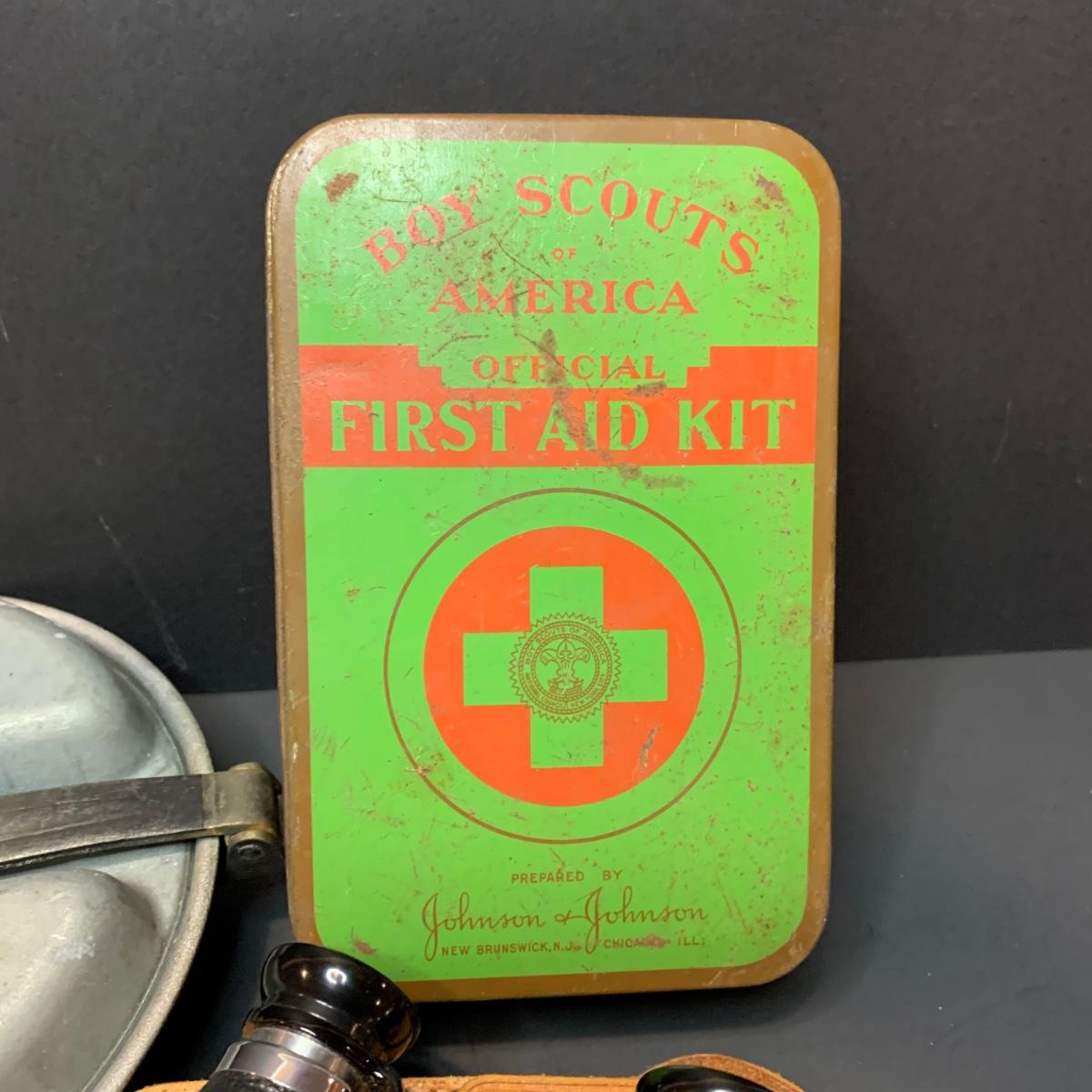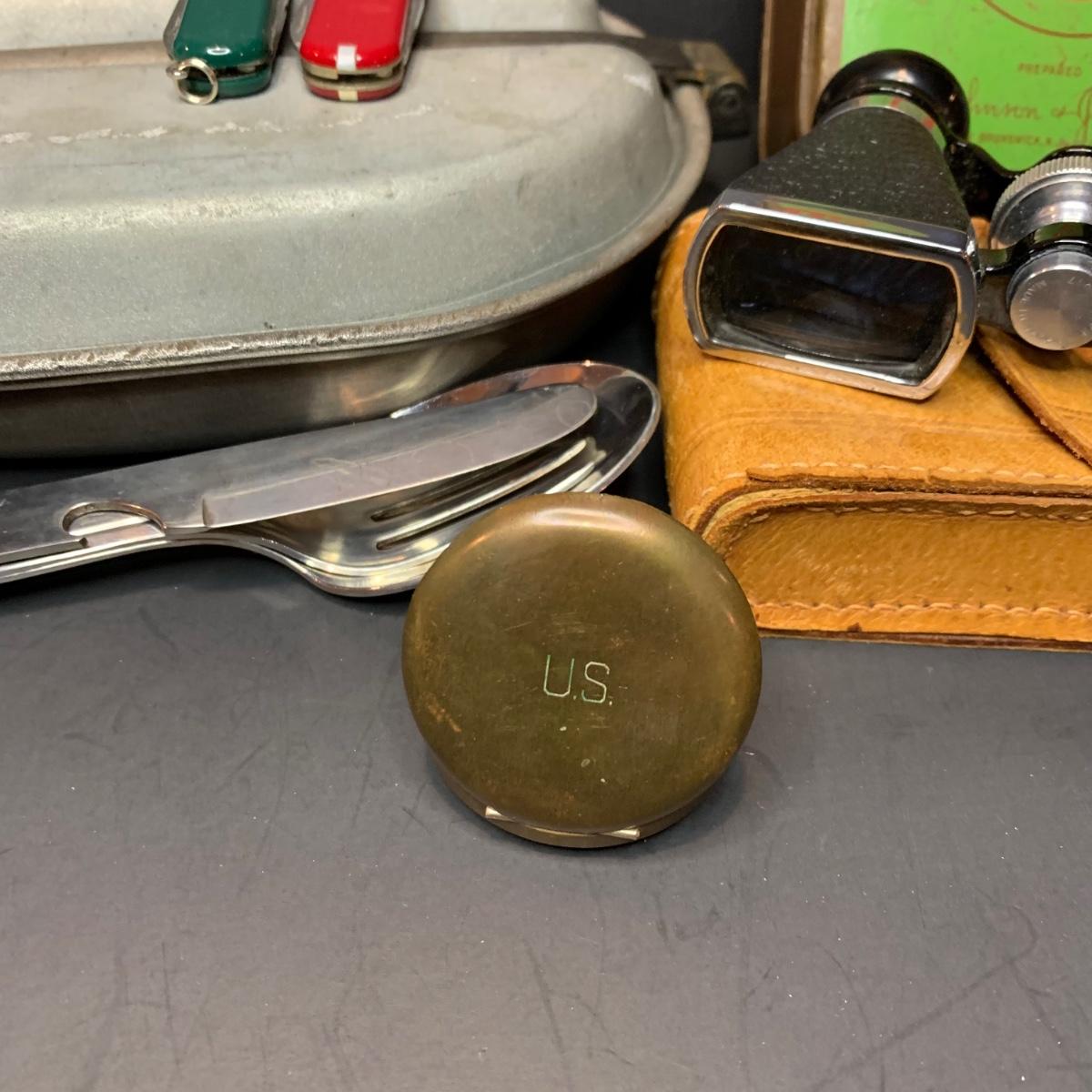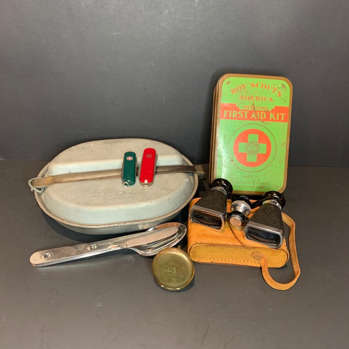 LOT 222R: Vintage Finds: US Brass Compass, Vintage Mess Kit, Binoculars in Case, Boy Scout First Aid Kit & More