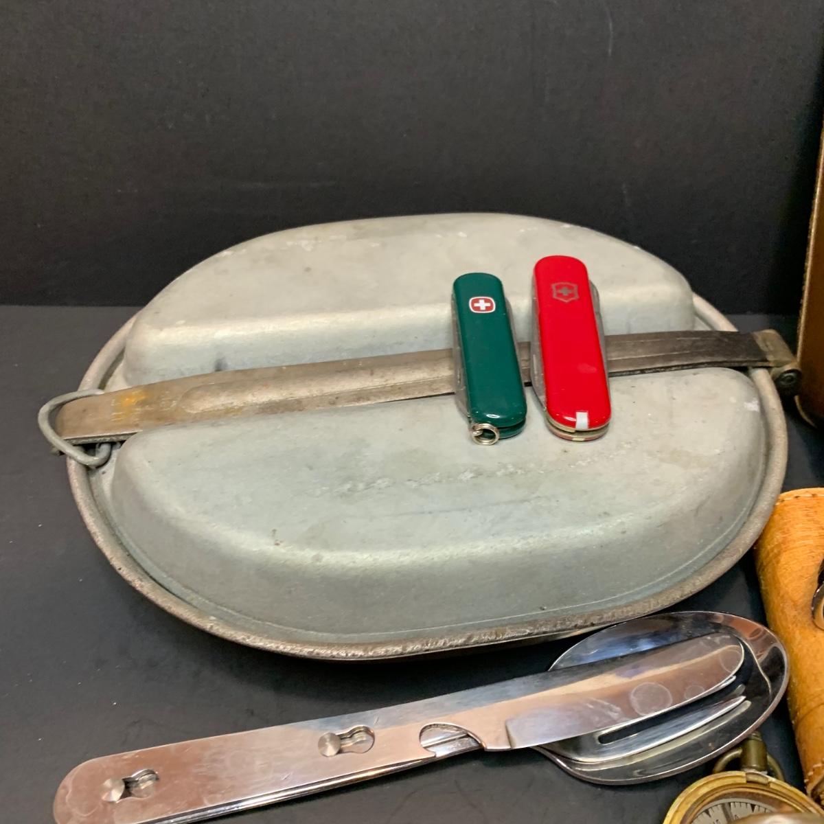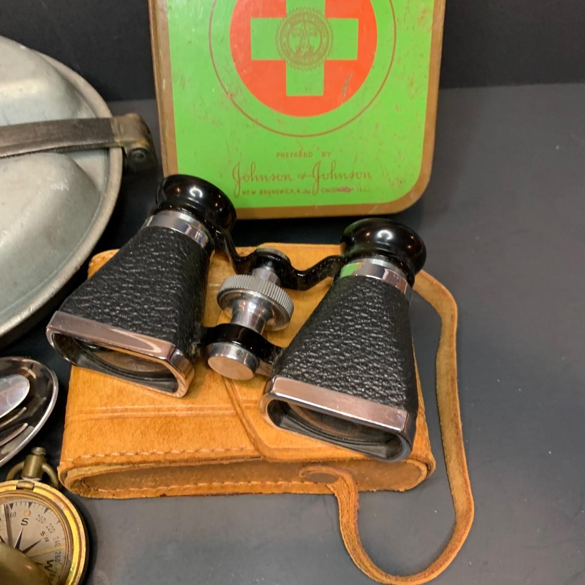 LOT 222R: Vintage Finds:  US Brass Compass, Vintage Mess Kit,  Binoculars in Case, Boy Scout First Aid Kit & More