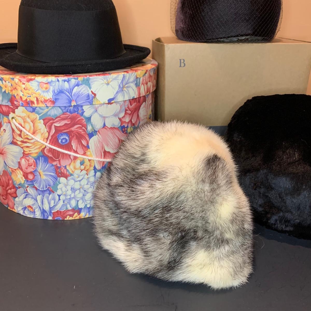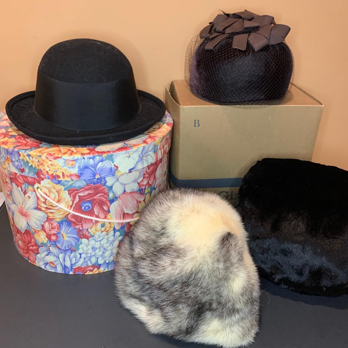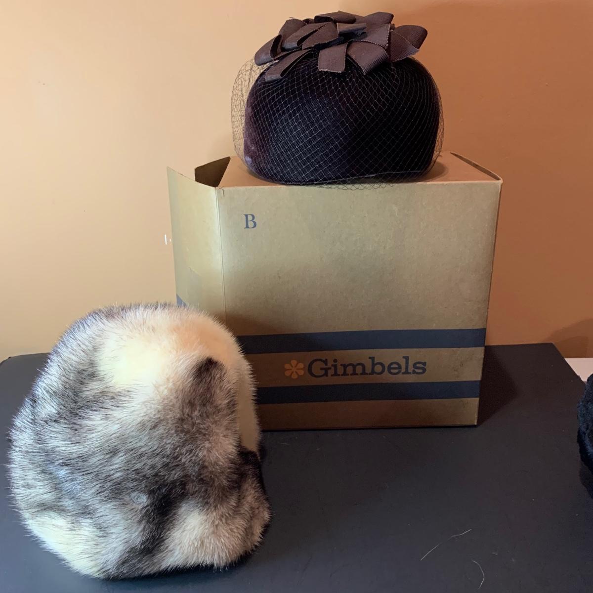 Collection includes three vintage women’s hats, a black fur muff, a vintage Gimbels hat box and a large floral hat box.