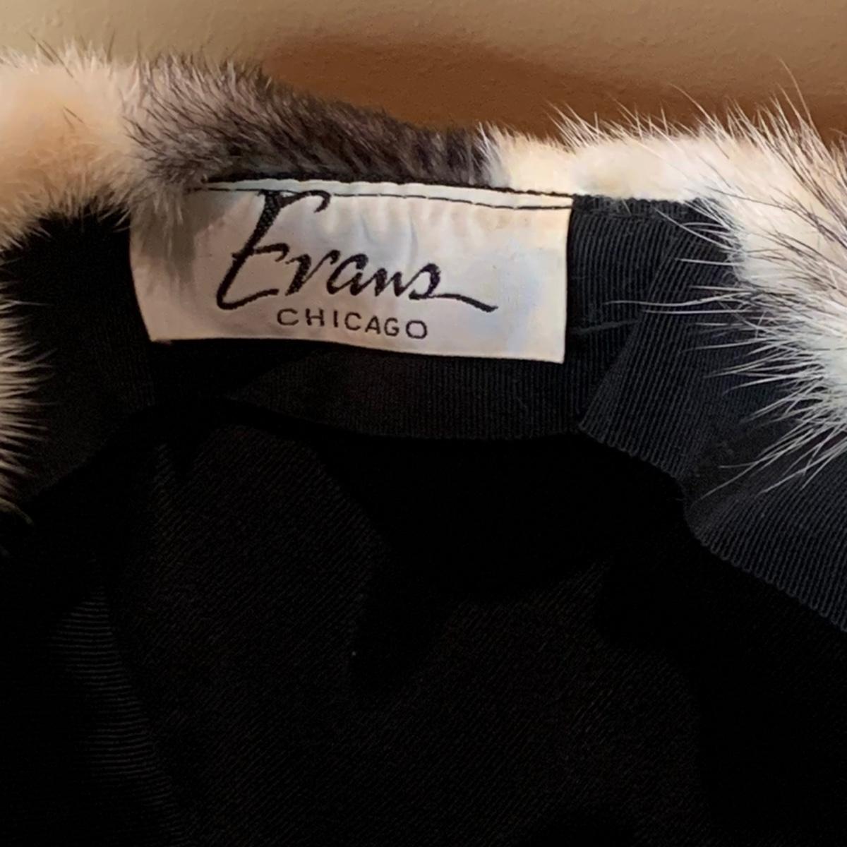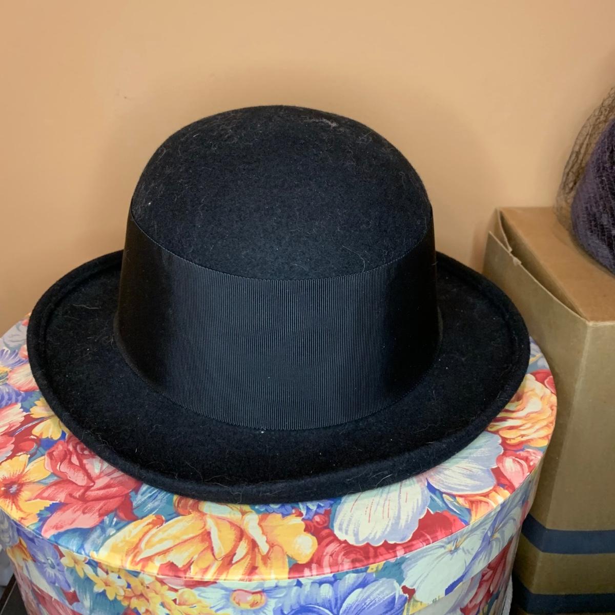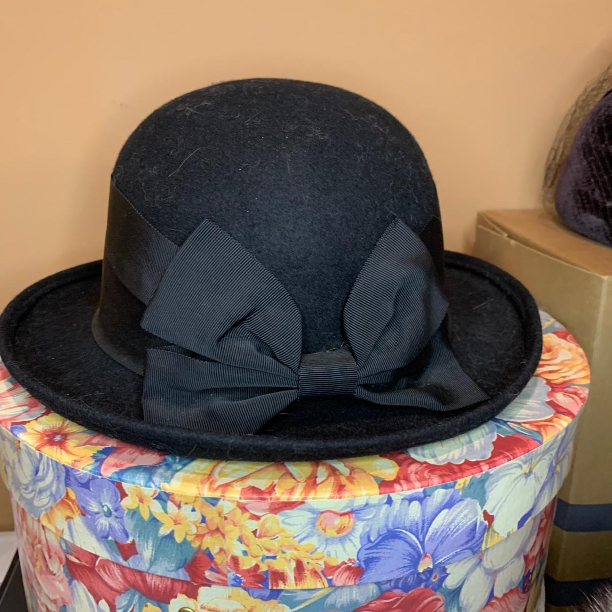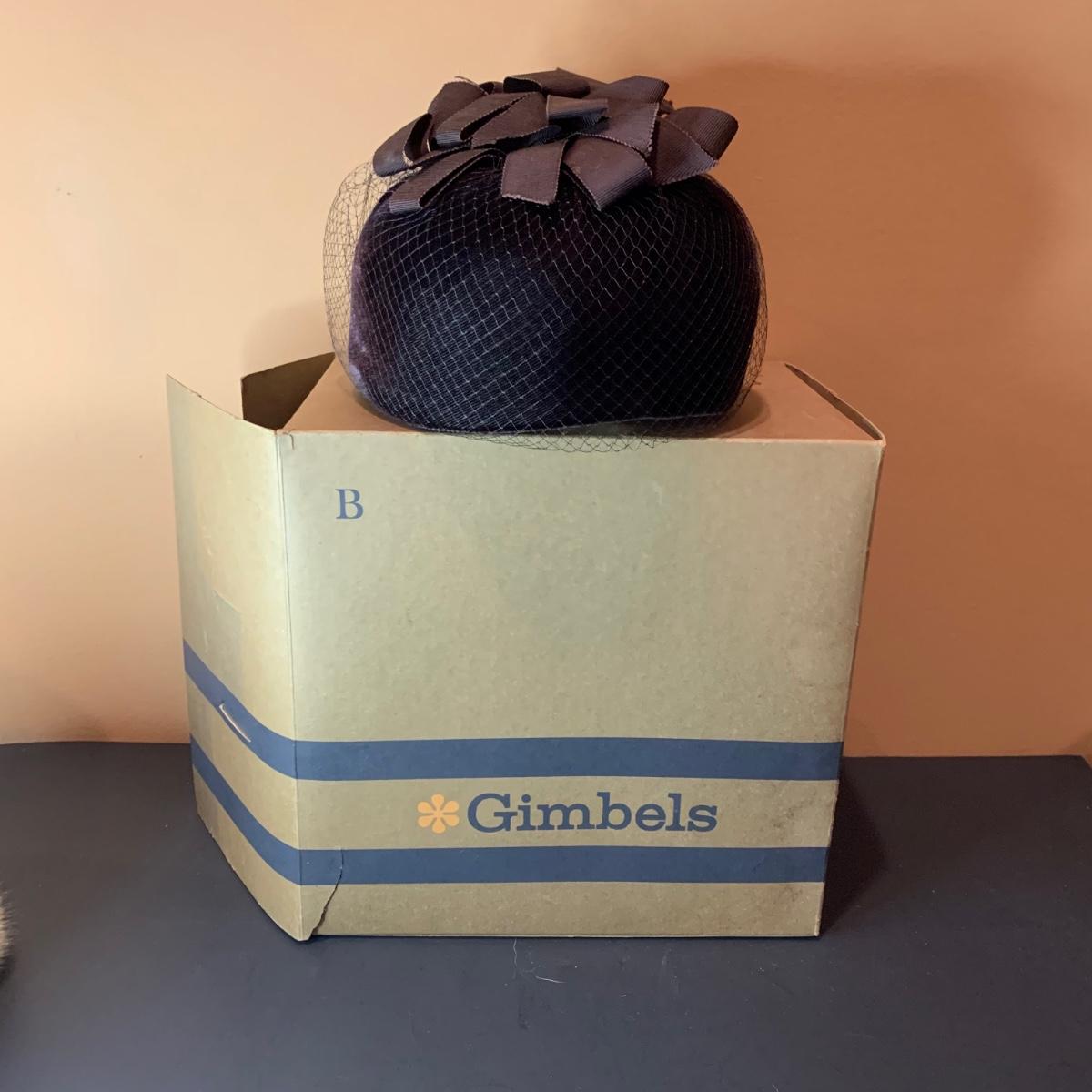 Collection includes three vintage women’s hats, a black fur muff, a vintage Gimbels hat box and a large floral hat box.