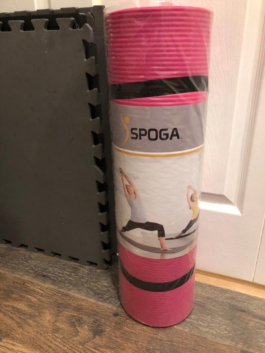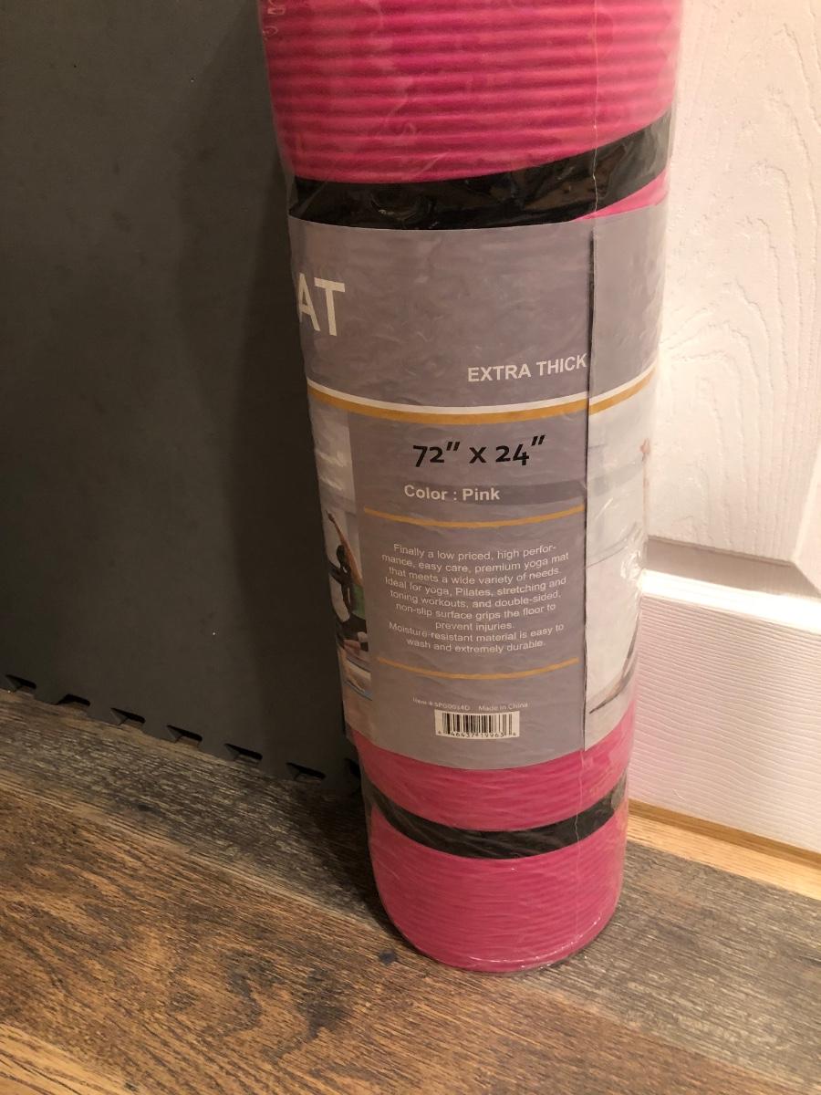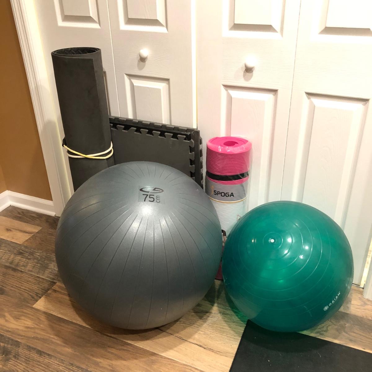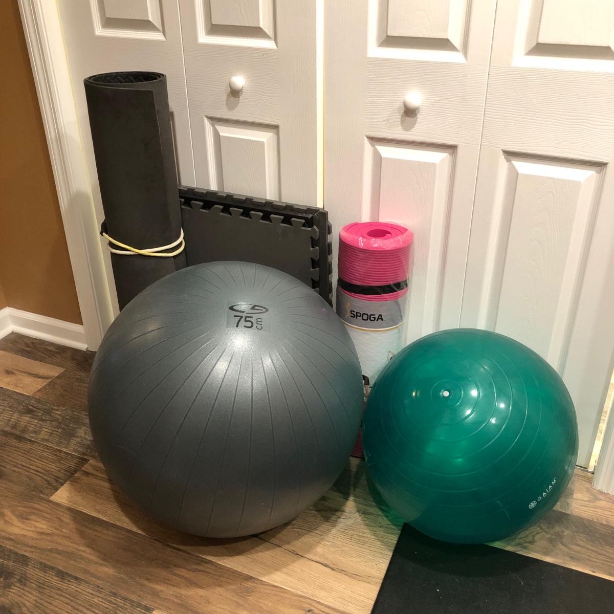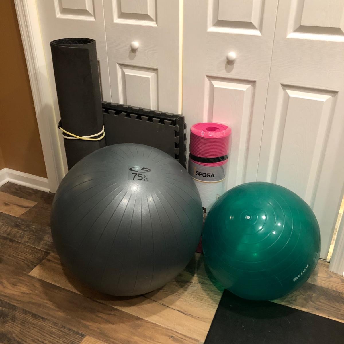 Includes six squares of mat foam, a rolled gym mat, two exercise balls and a pink extra thick yoga mat.