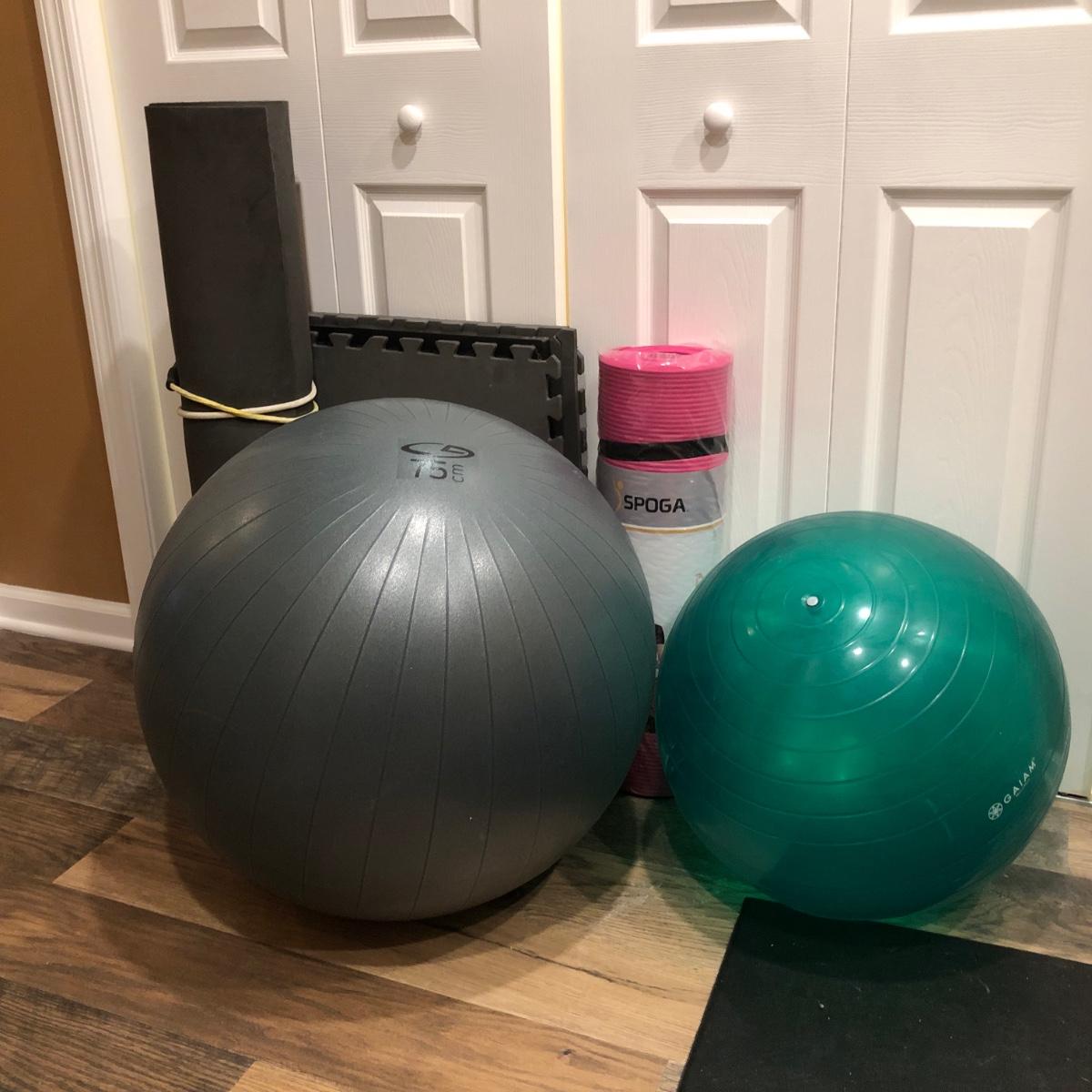 LOT244M: Exercise Balls, Pink Spoga Extra Thick Yoga Mat, & Foam Gym Mats