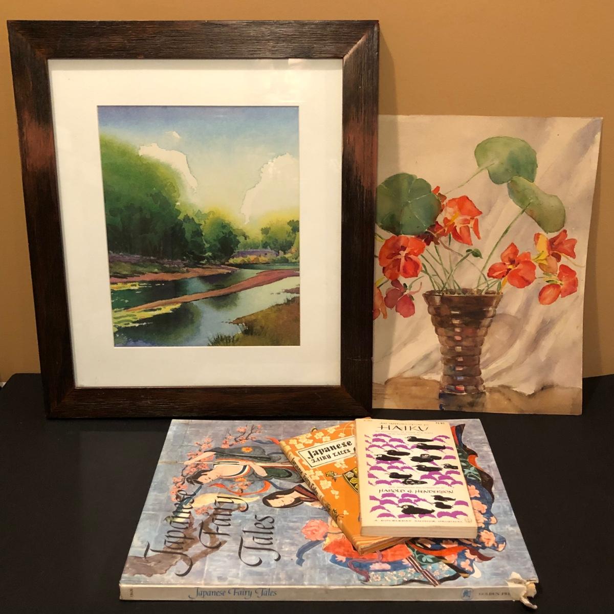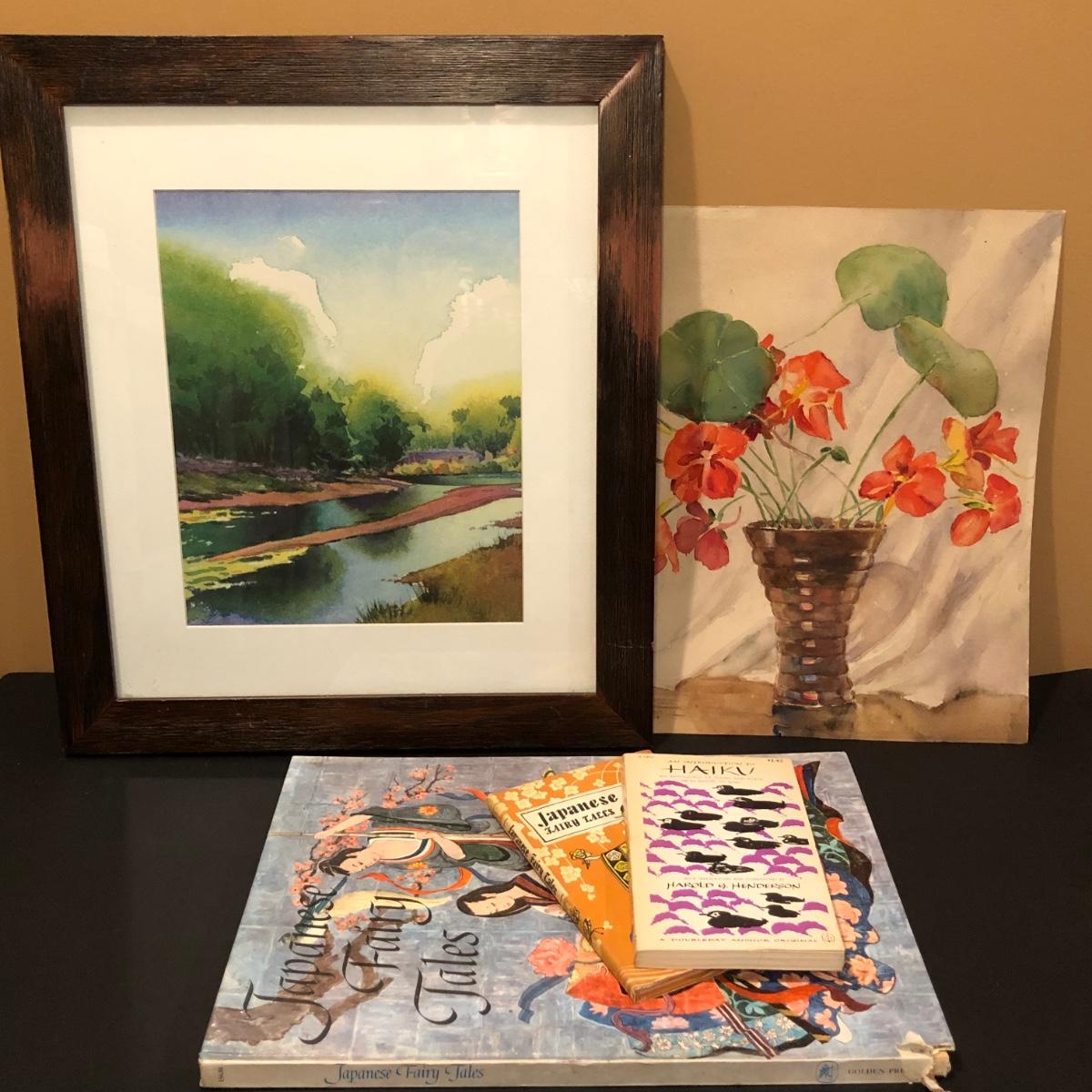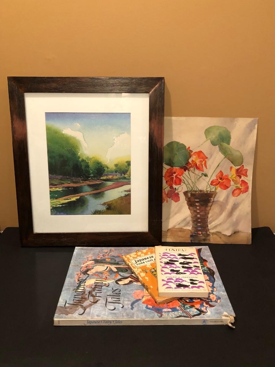 Includes framed Johne Richardson watercolor print, unframed hand painted watercolor piece, two books about Japanese fairy tales and a book about Haiku.