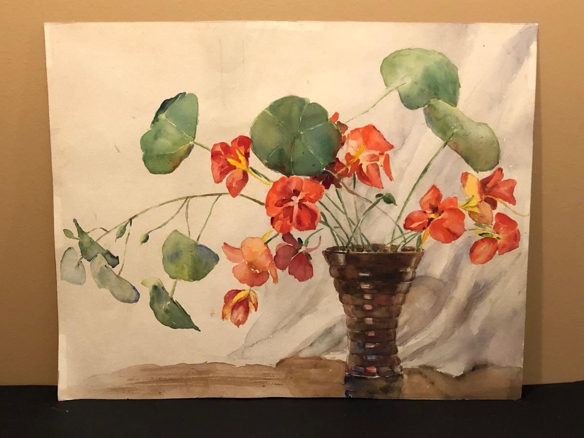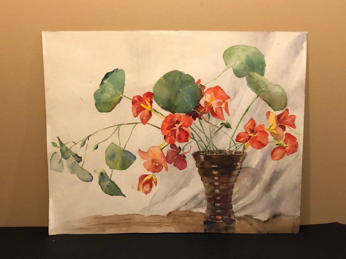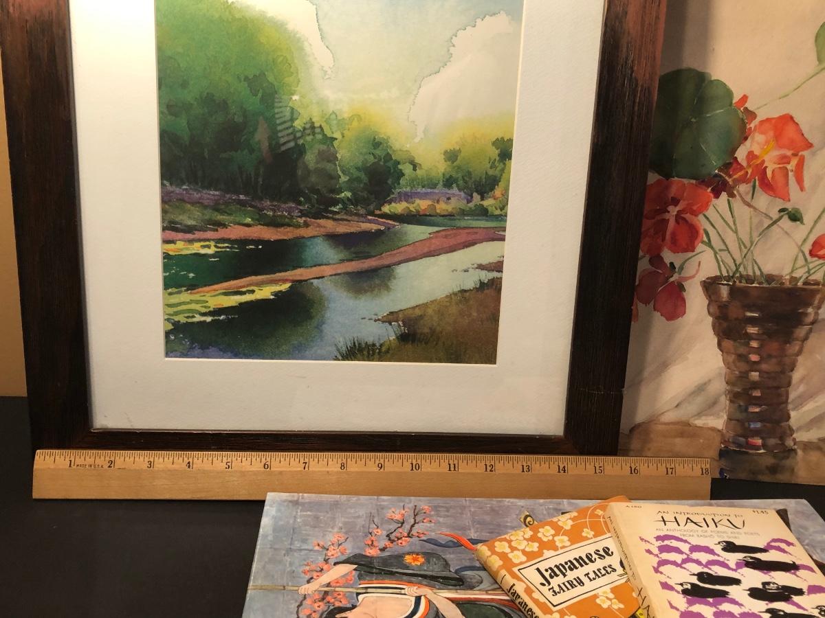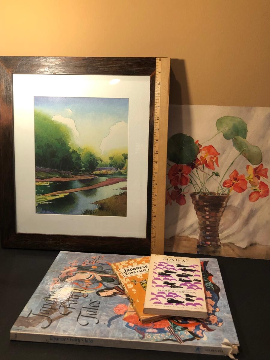 Includes framed Johne Richardson watercolor print, unframed hand painted watercolor piece, two books about Japanese fairy tales and a book about Haiku.