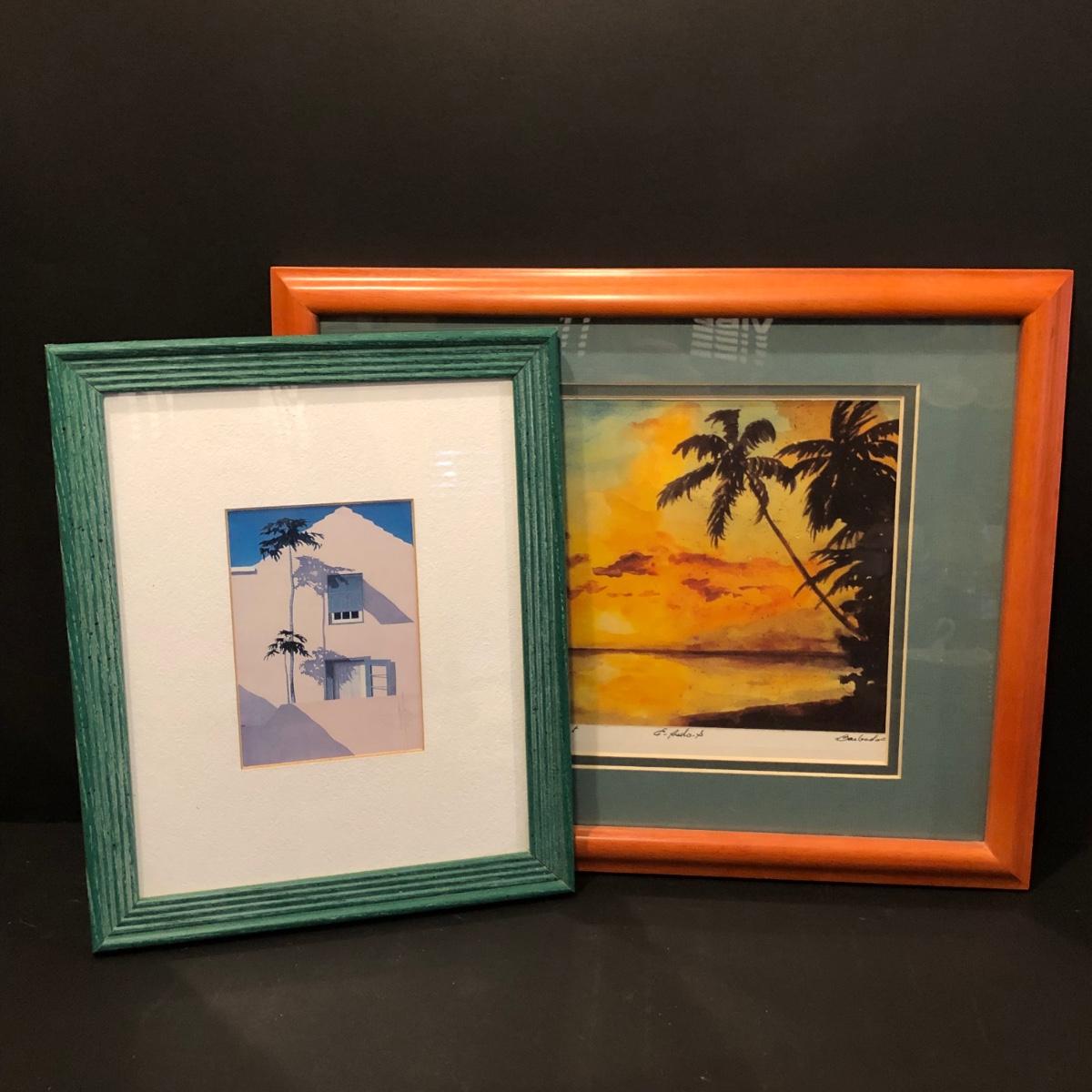 Includes a framed print from Bermuda artist Michael Swan and a framed, signed watercolor of Barbados by the artist.