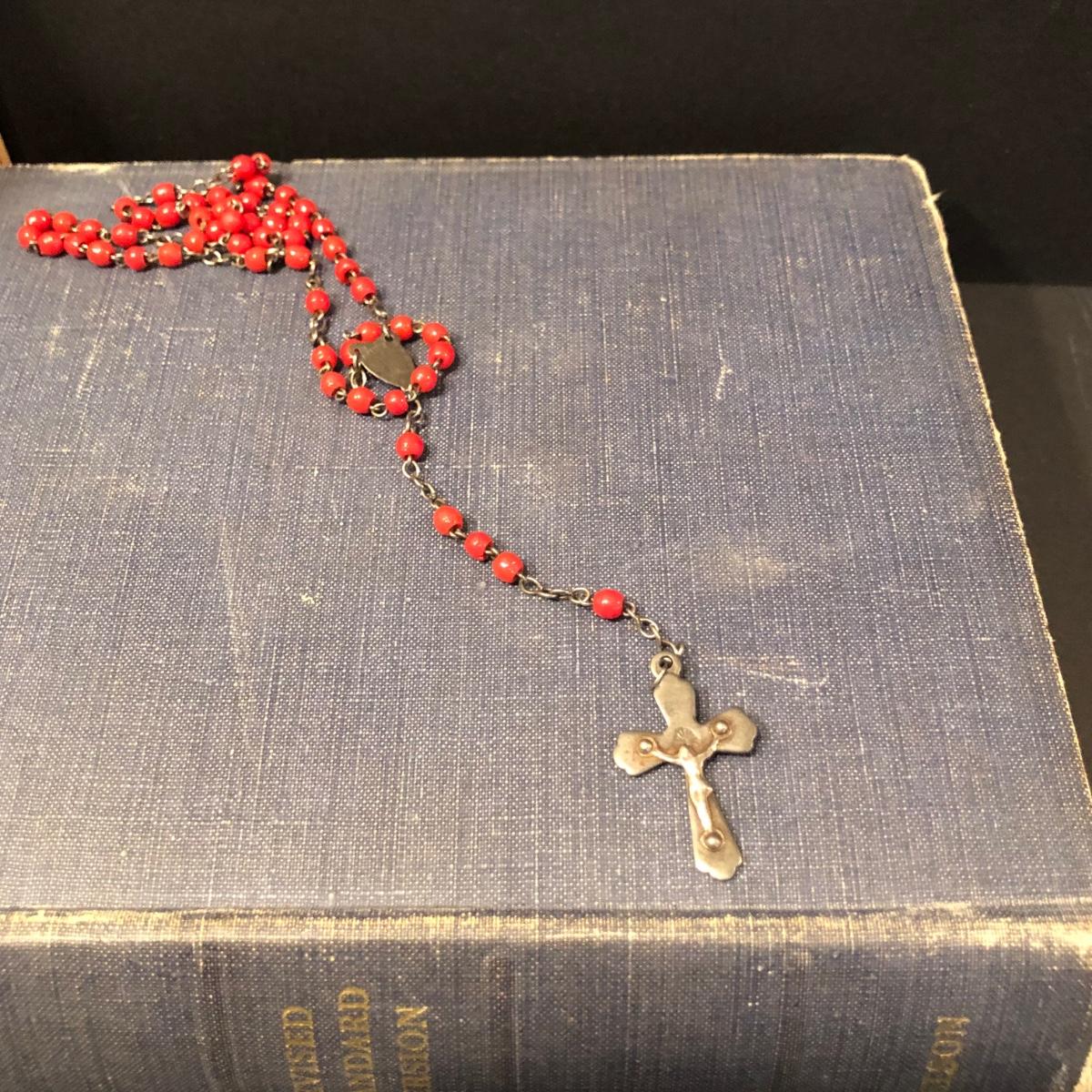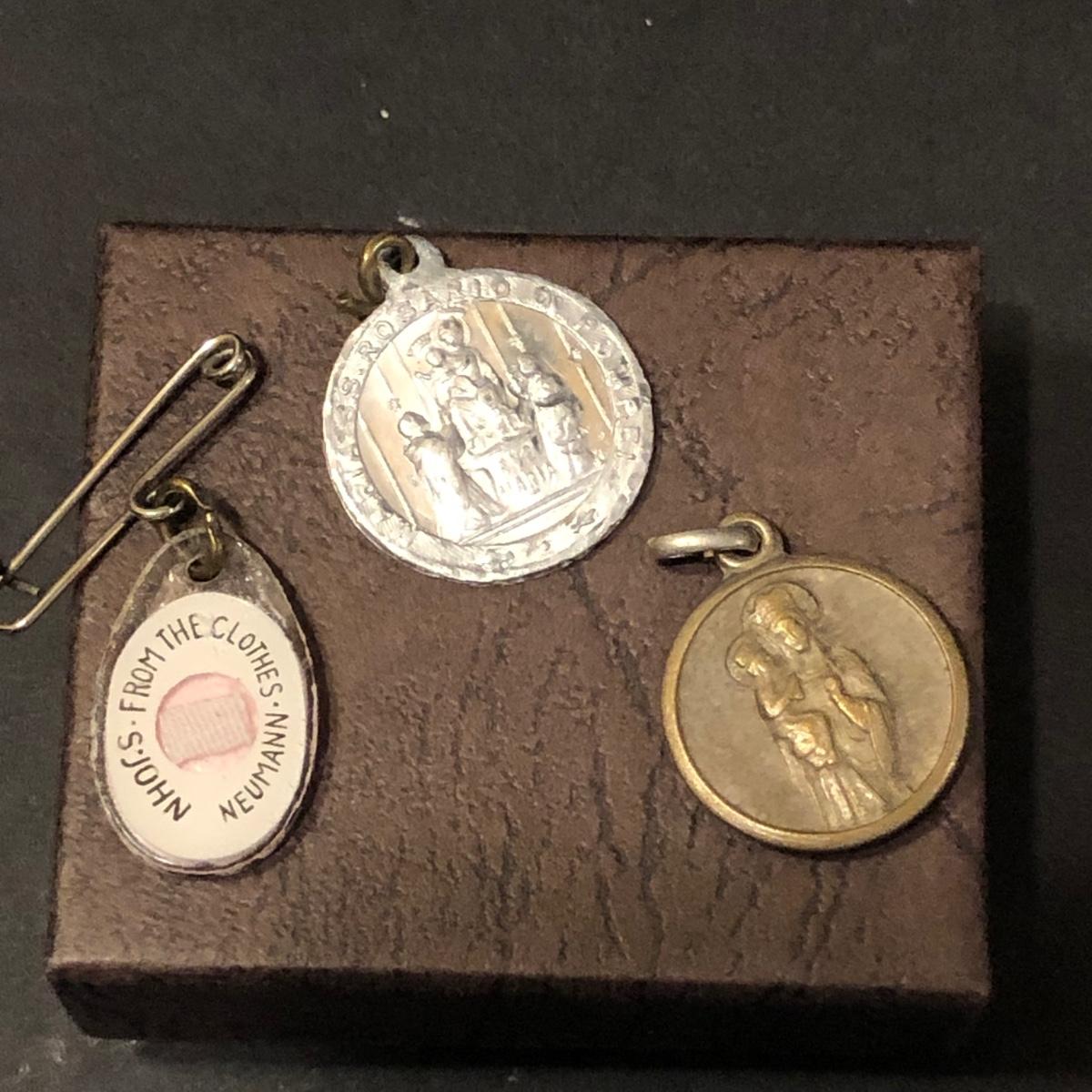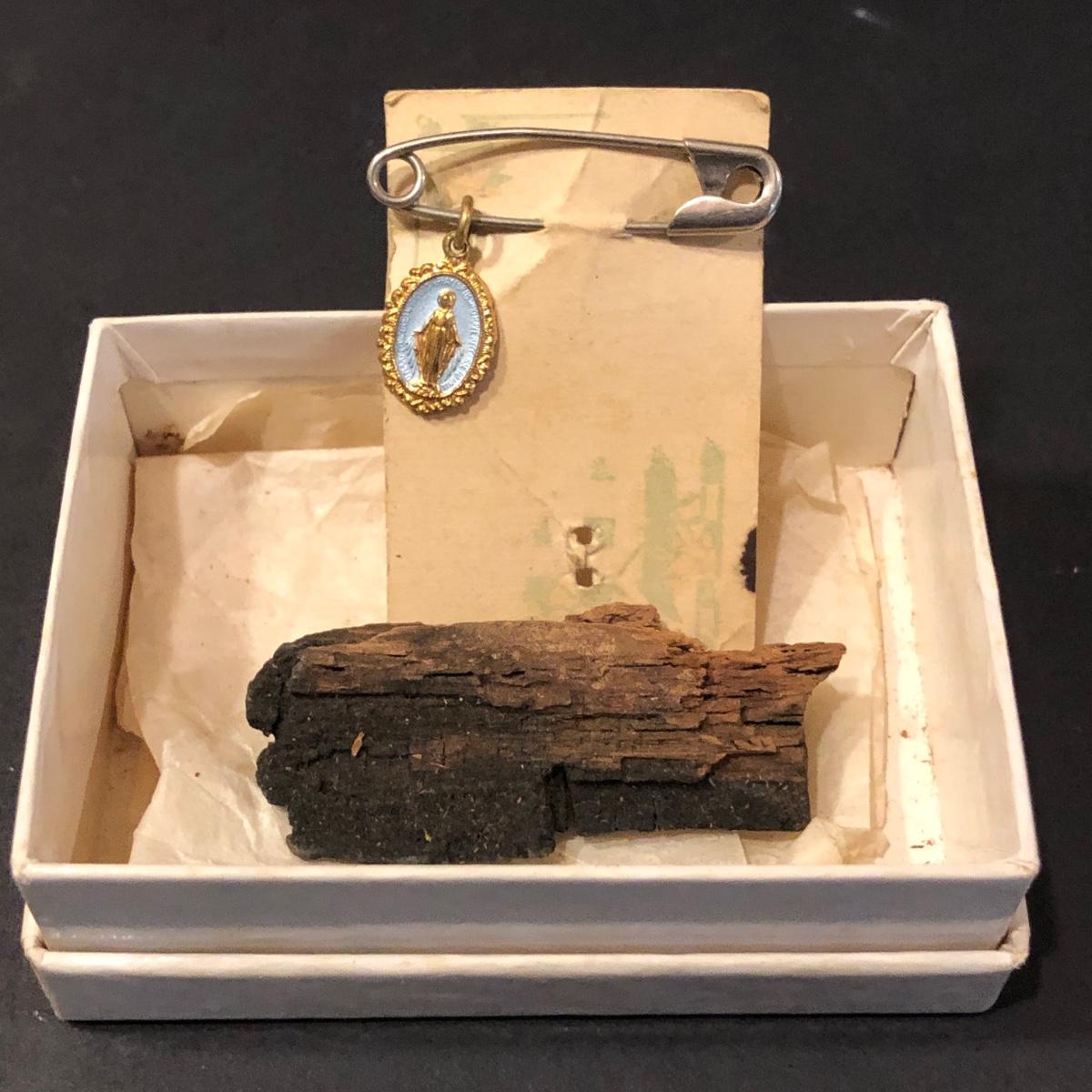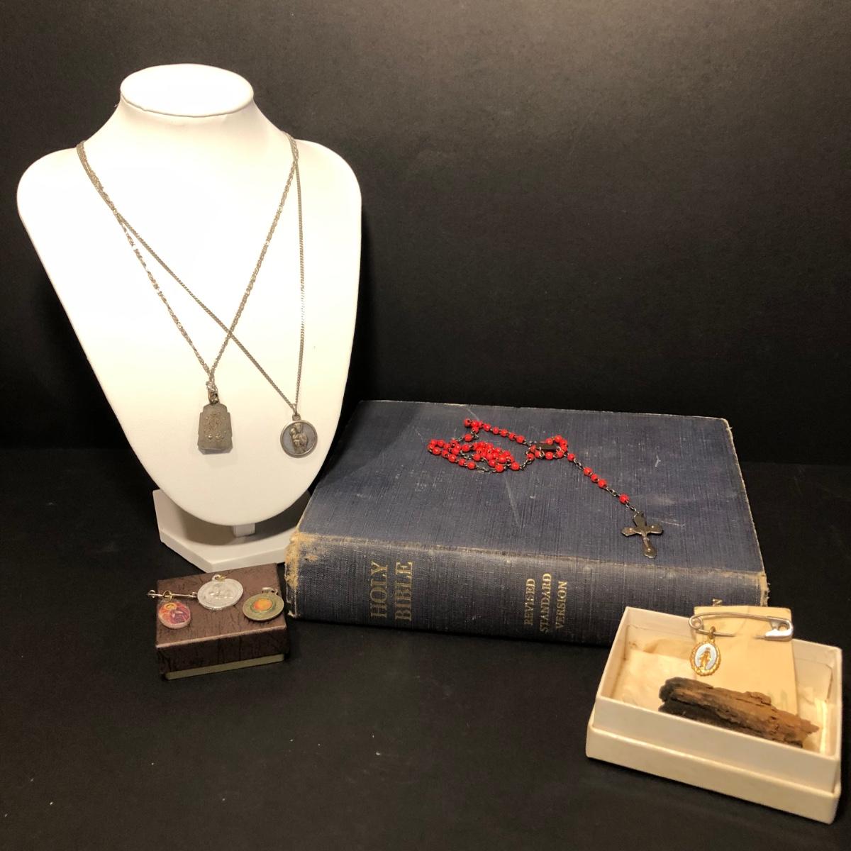 Includes a used Bible, red rosary, four charms with saints and religious iconography, a small piece of burnt wood and two necklaces.