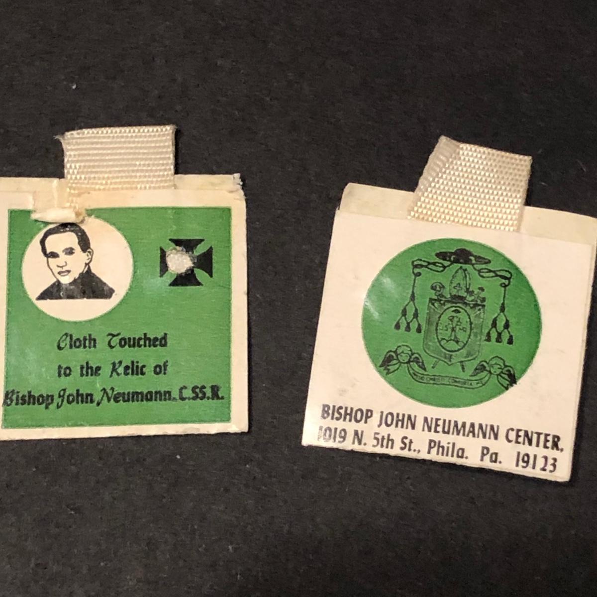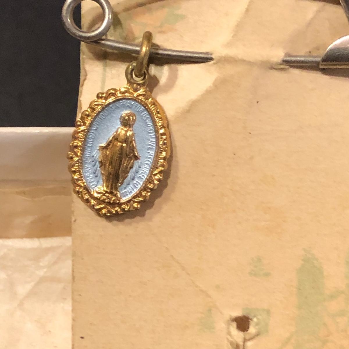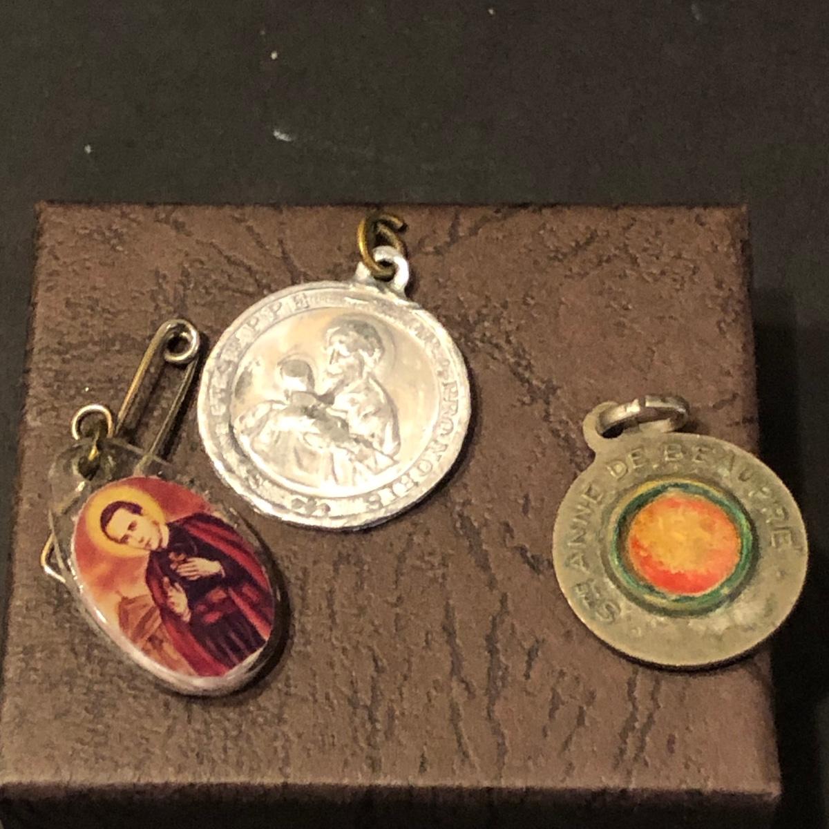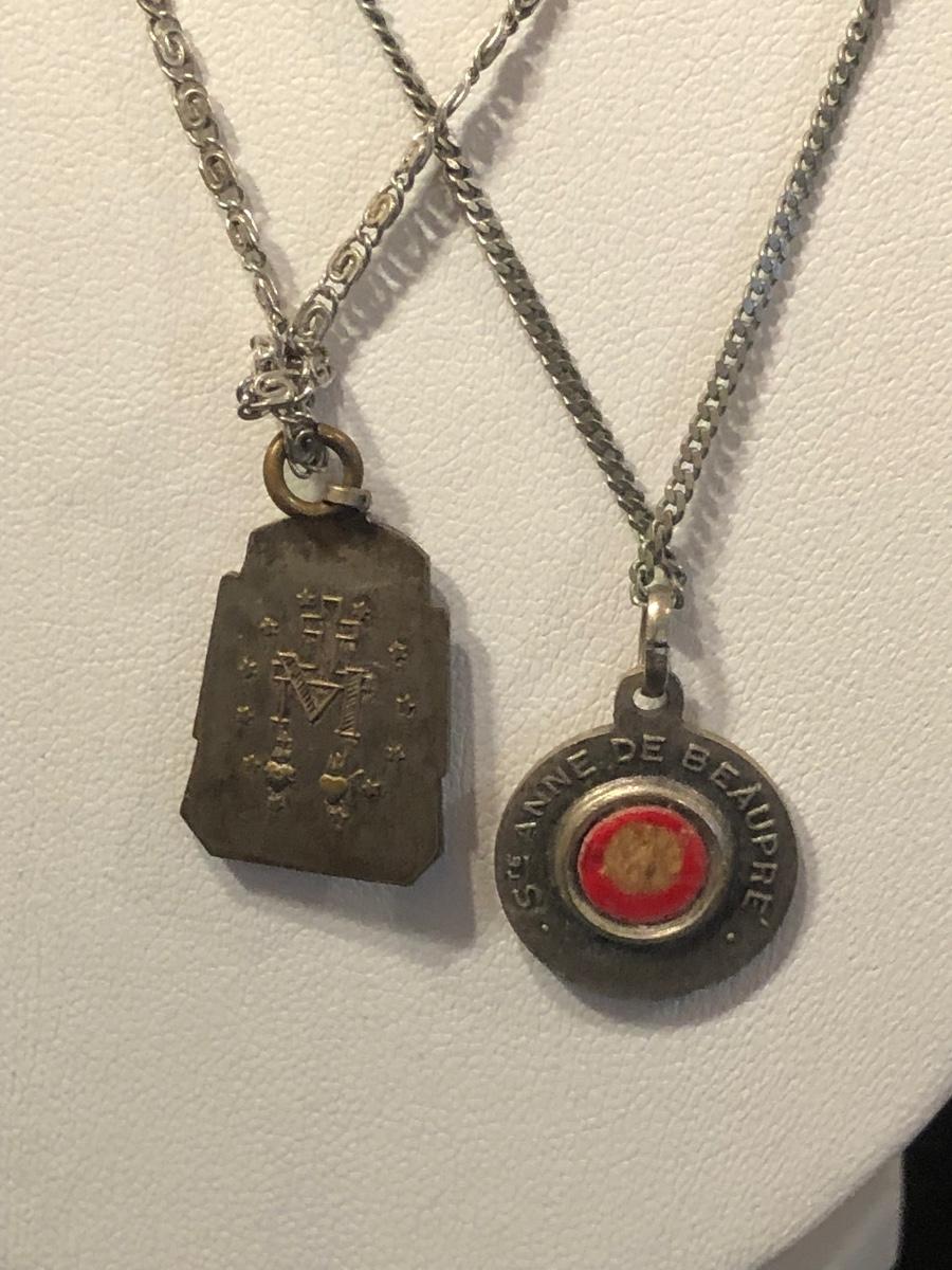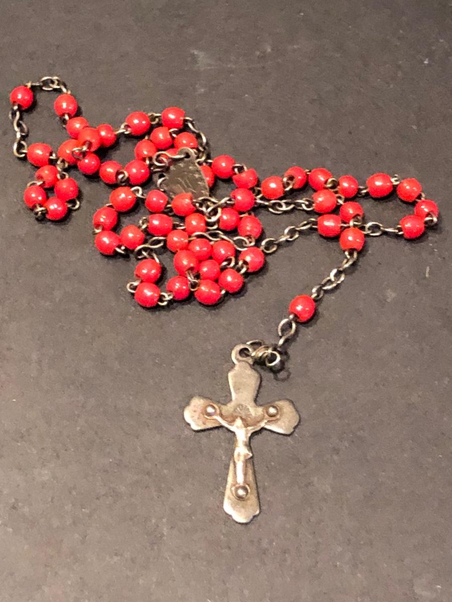 Includes a used Bible, red rosary, four charms with saints and religious iconography, a small piece of burnt wood and two necklaces.