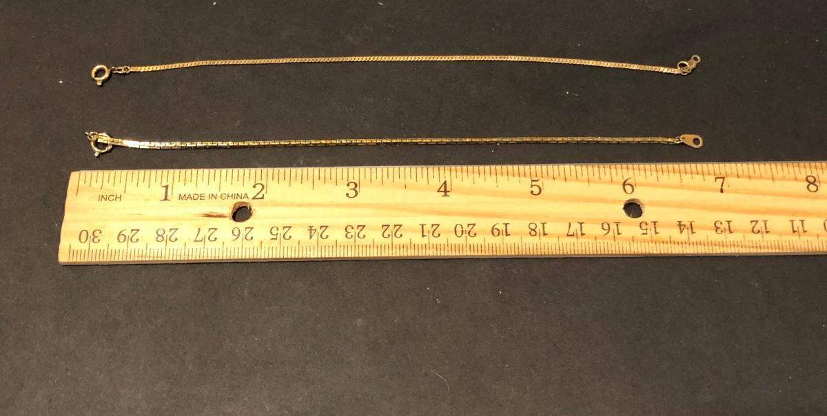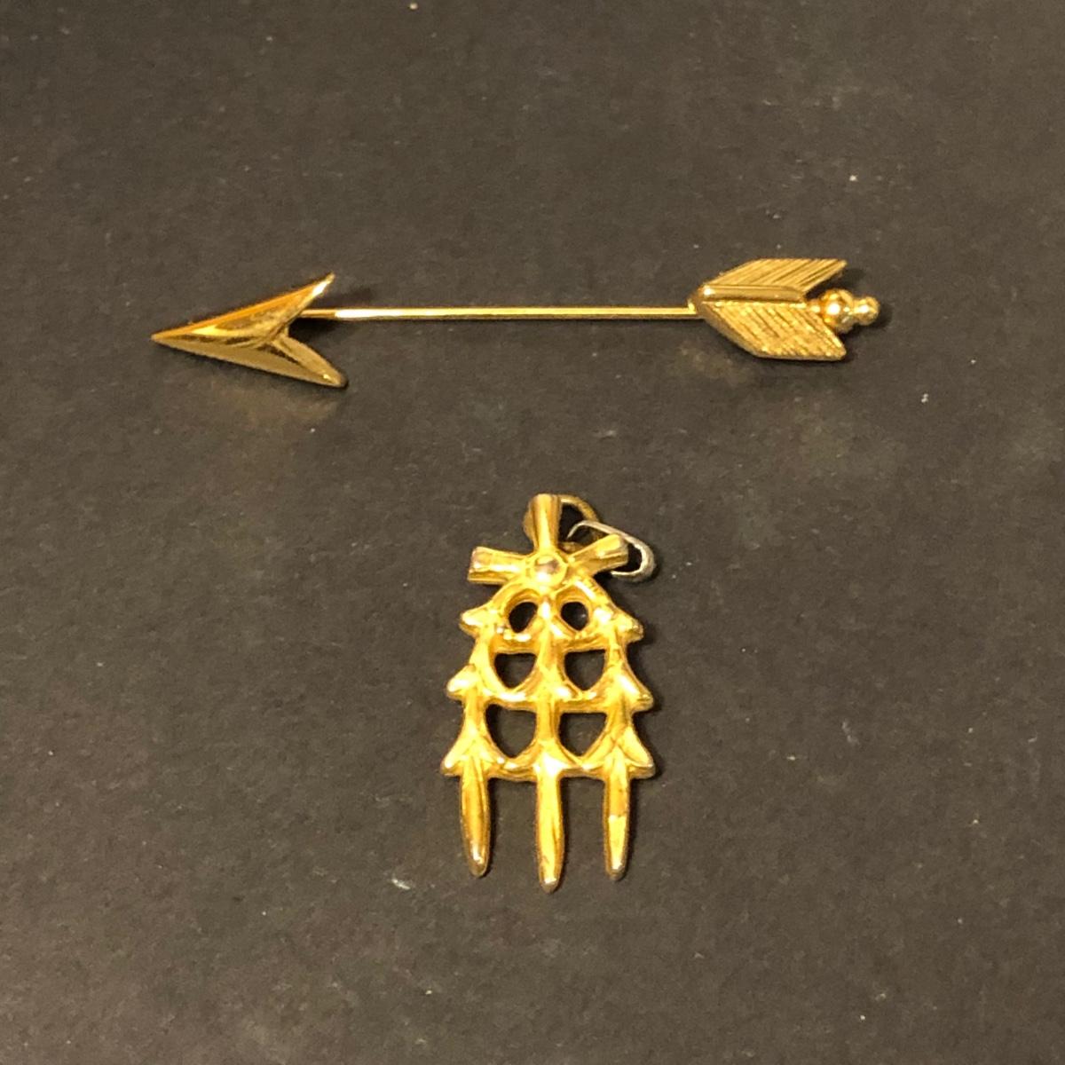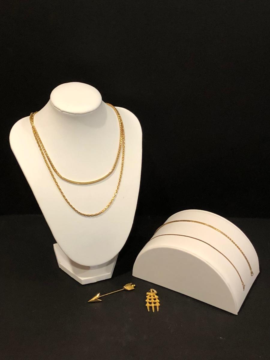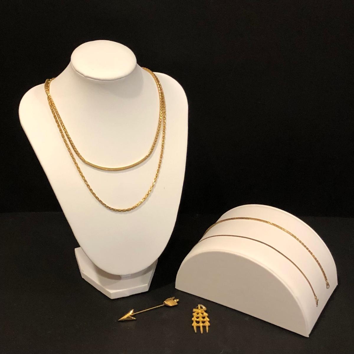Includes two necklaces, two bracelets, a stick pin and a charm.