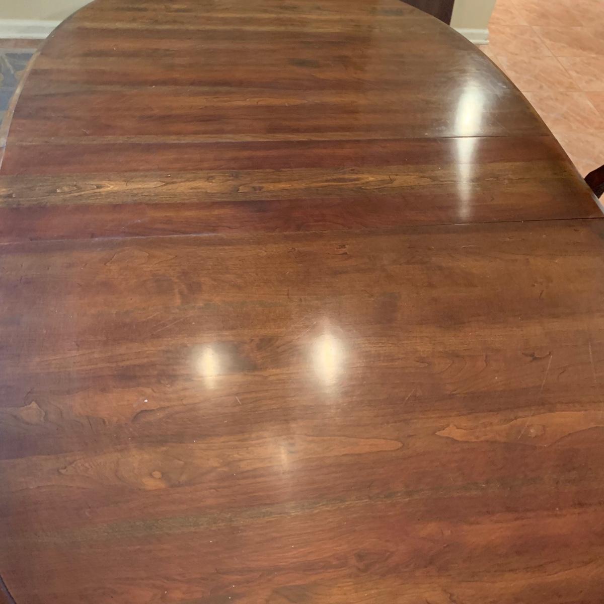 52 x 37 oval dinning table with additional 10" extension. Chairs pads show some signs of wear.