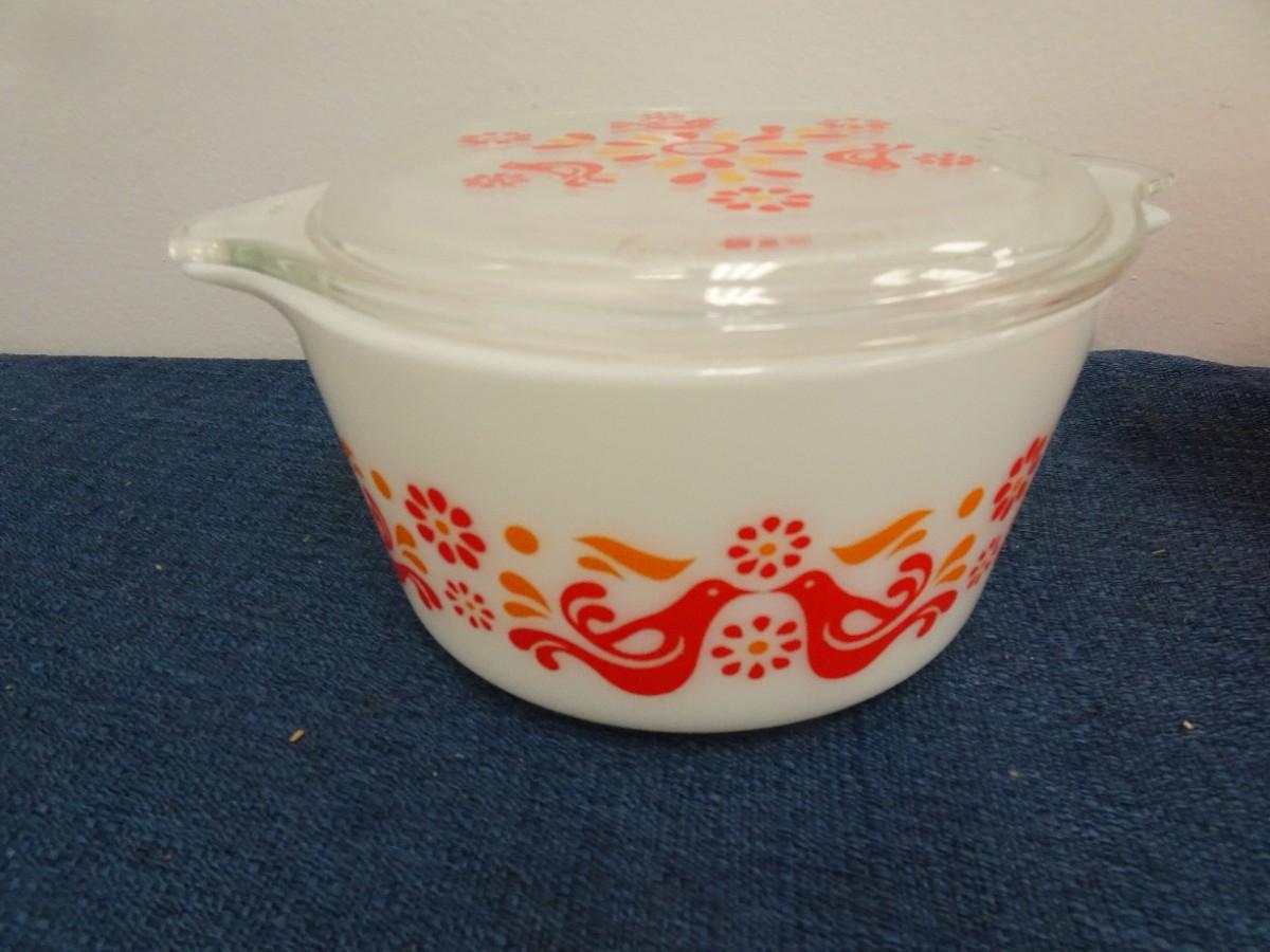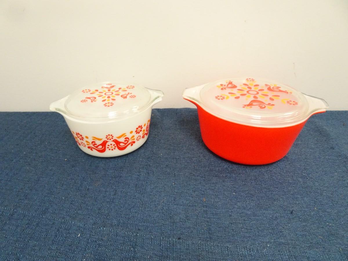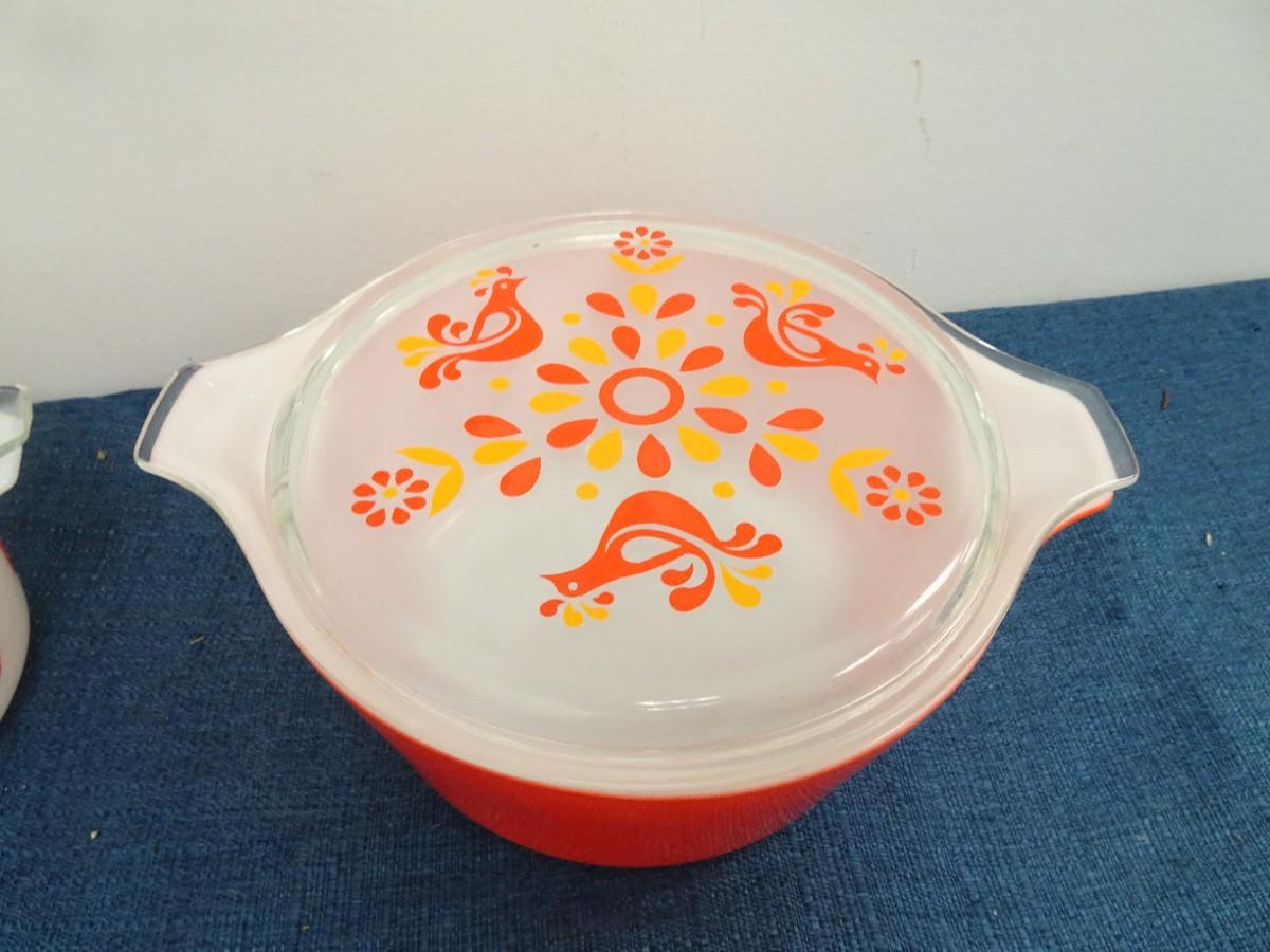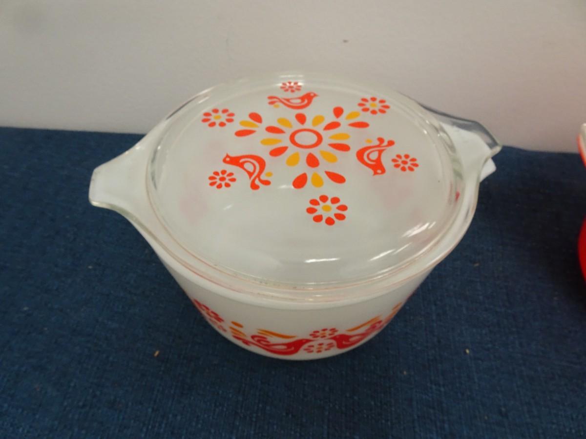 LOT 831 VINTAGE PYREX DISHES WITH RED ORANGE FRIENDSHIP BIRD PATTERN