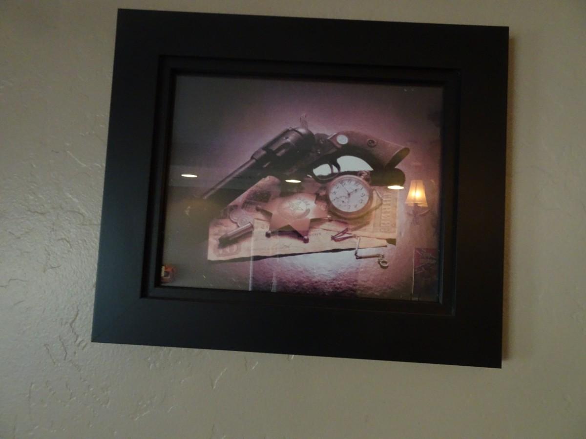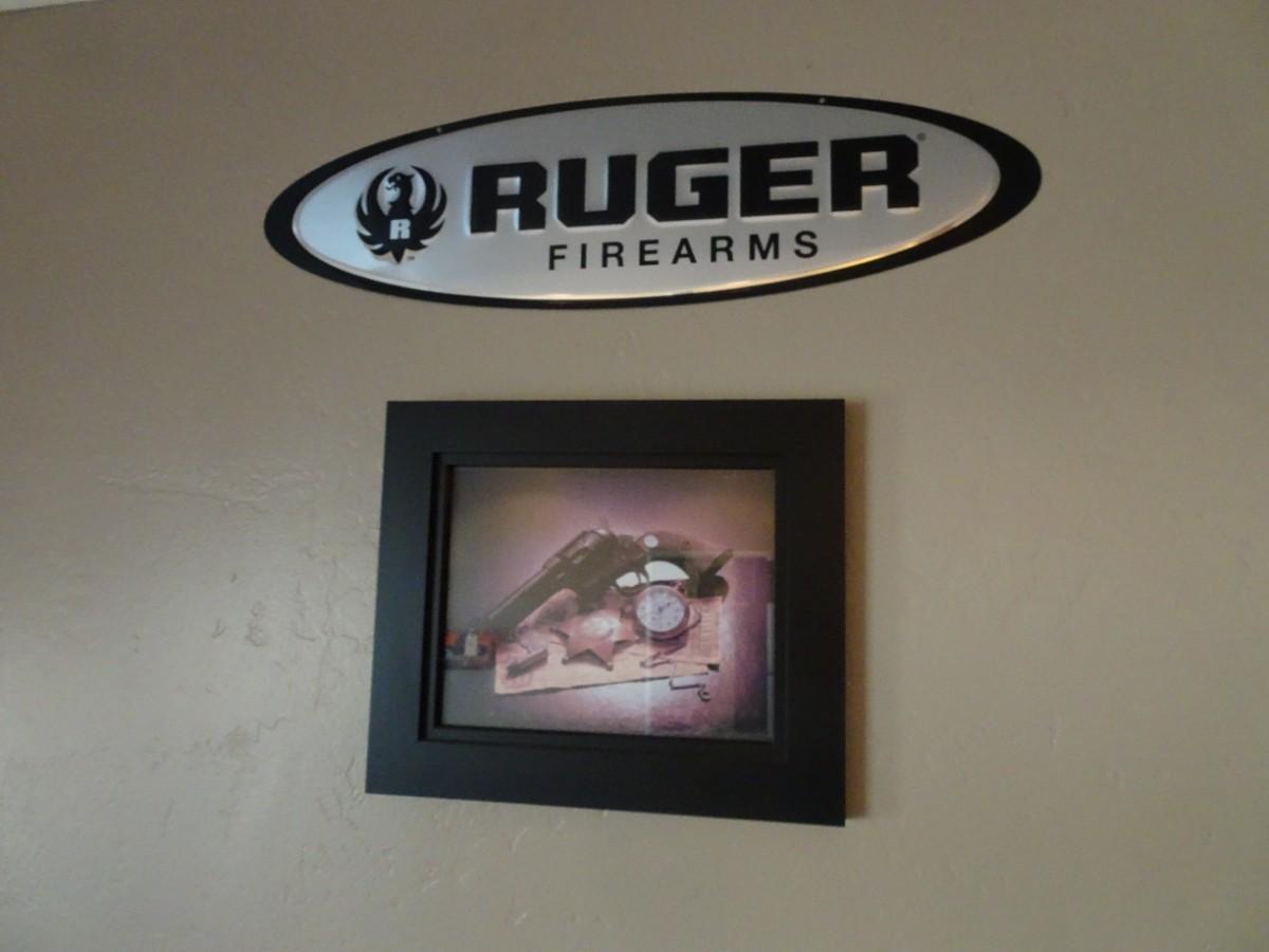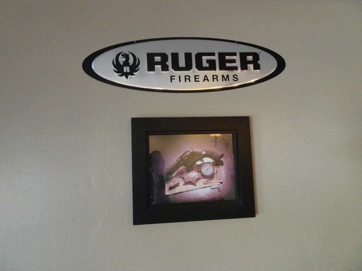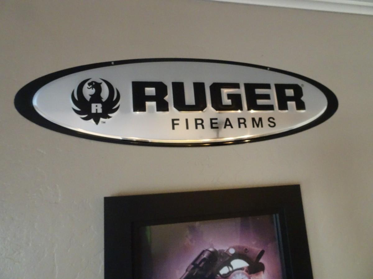 LOT 831. METAL RUGER GUN SIGN AND GUN PHOTO