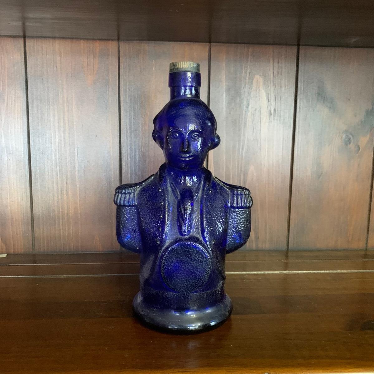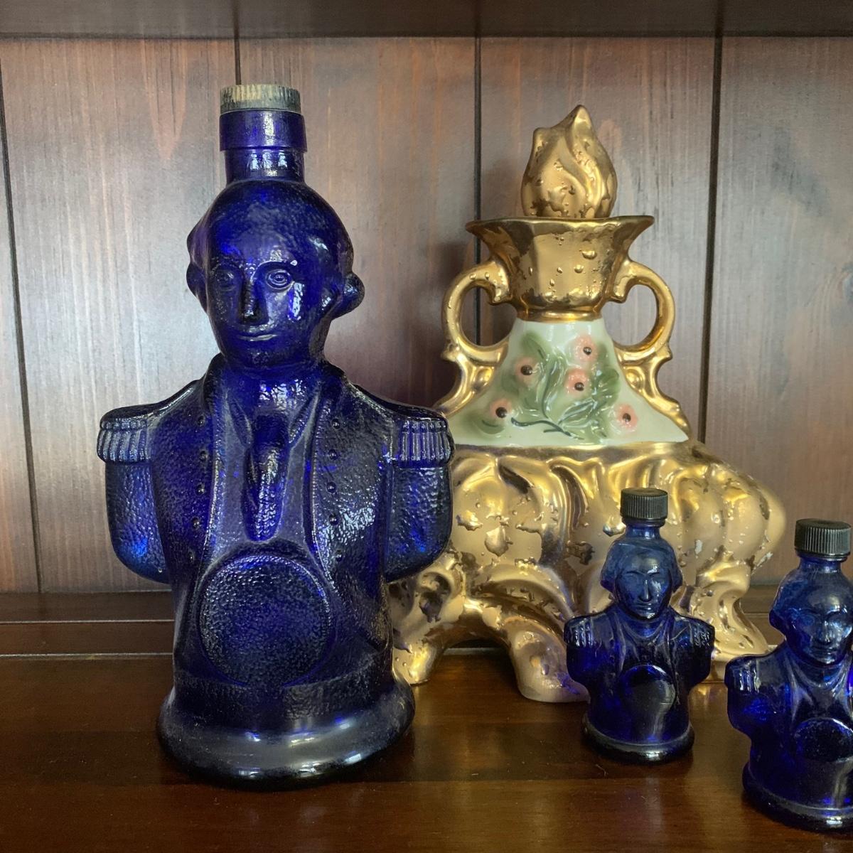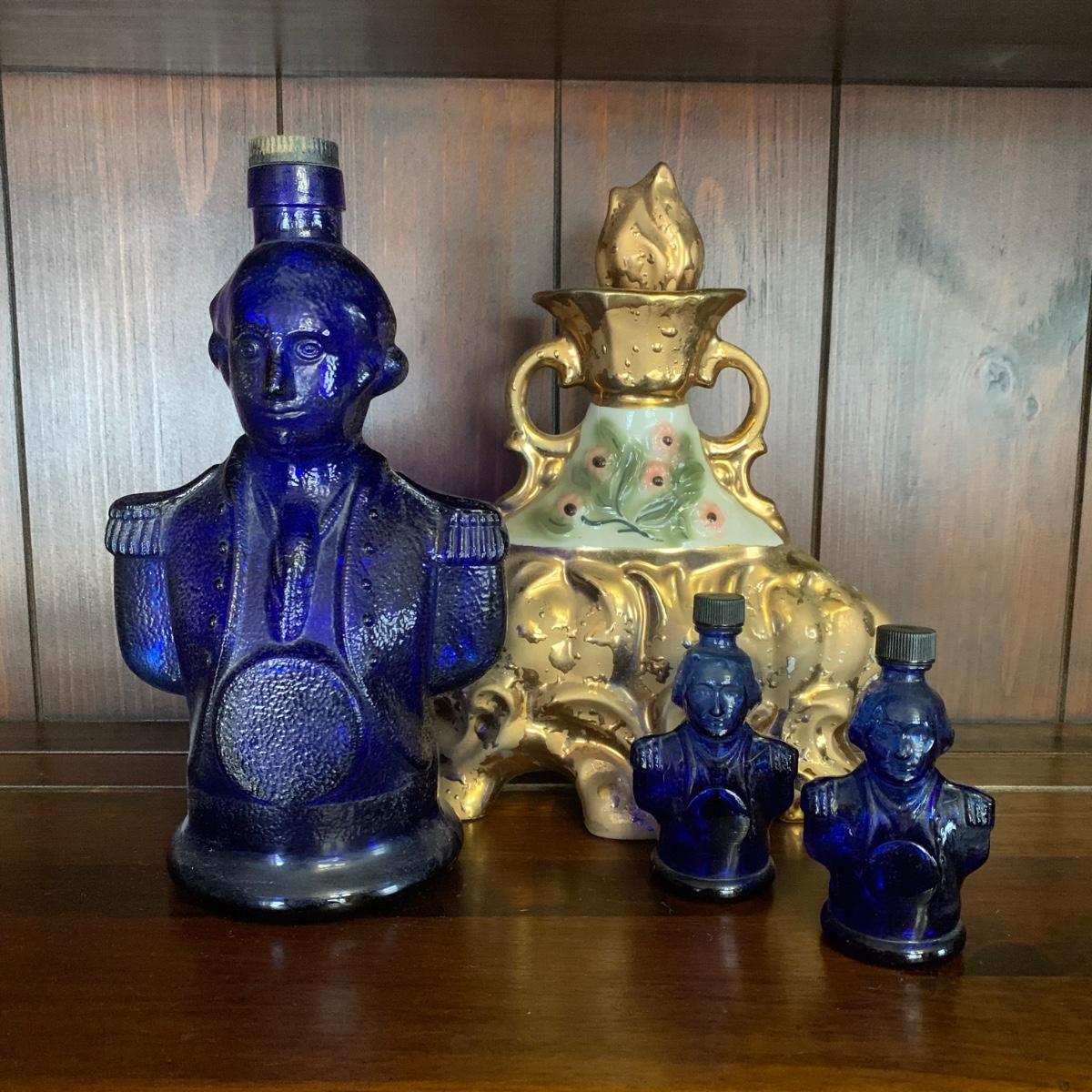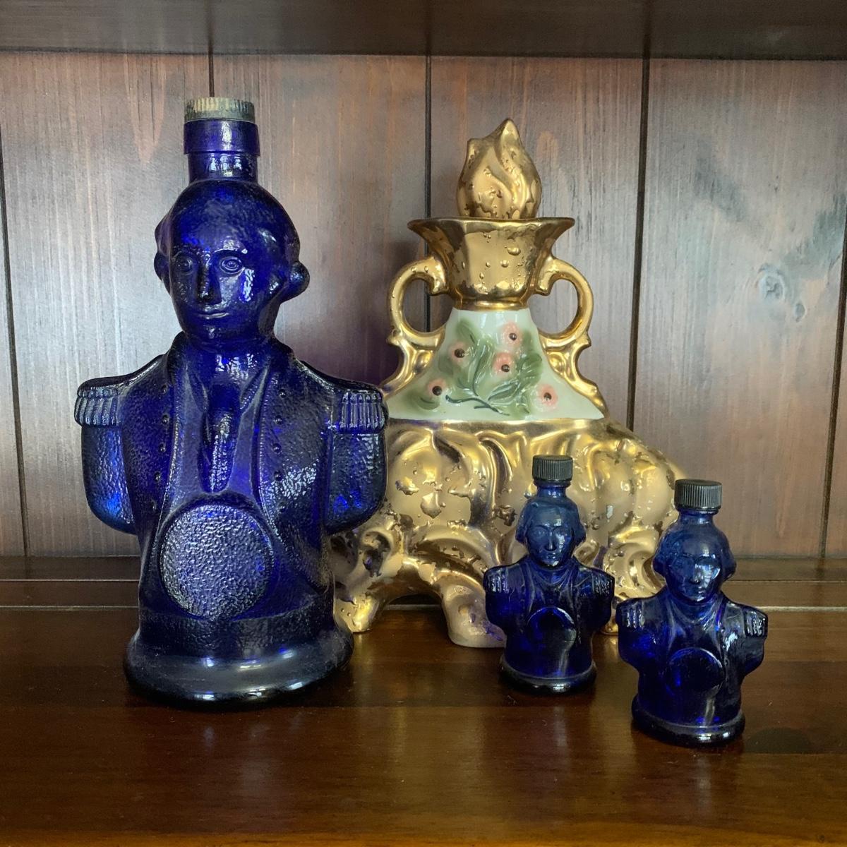 LOT 13R: Cobalt Blue George Washington Decanter w/ Miniatures, Jim Beam Weeping Gold Decanter