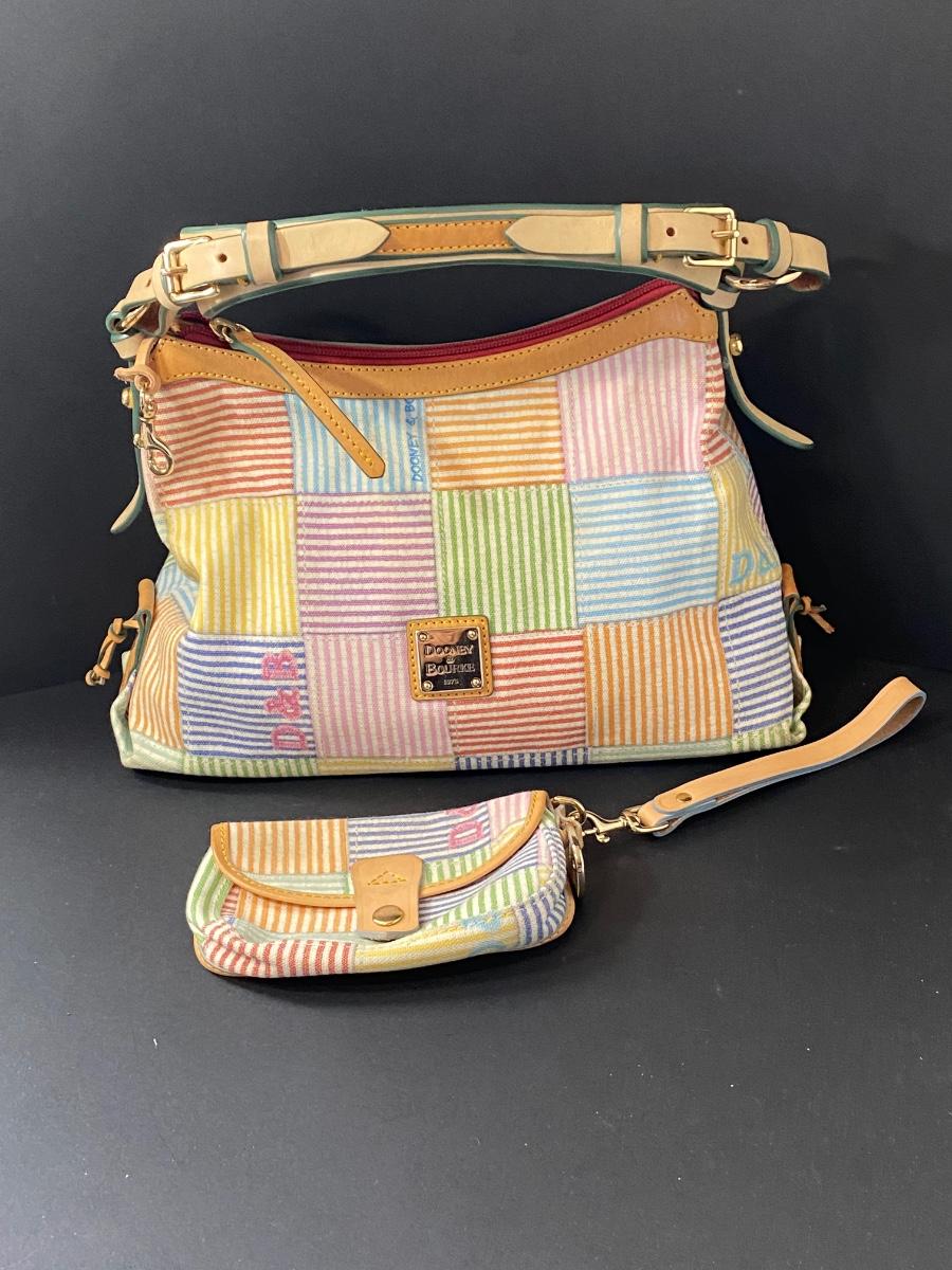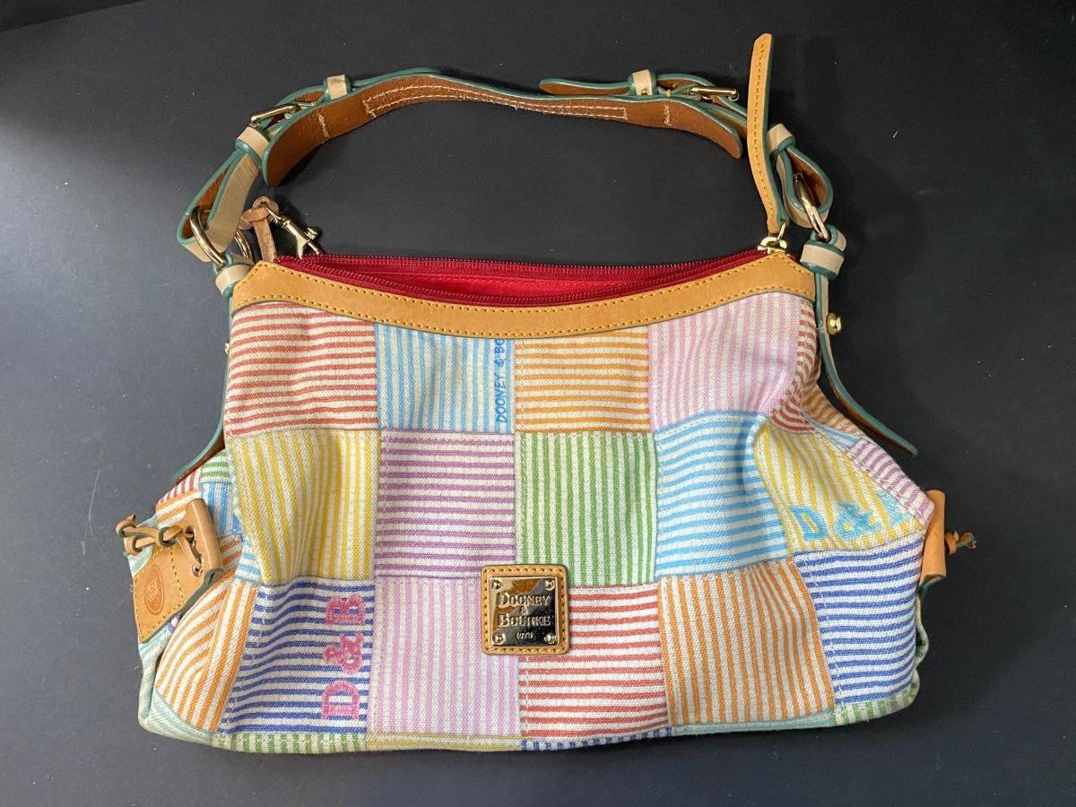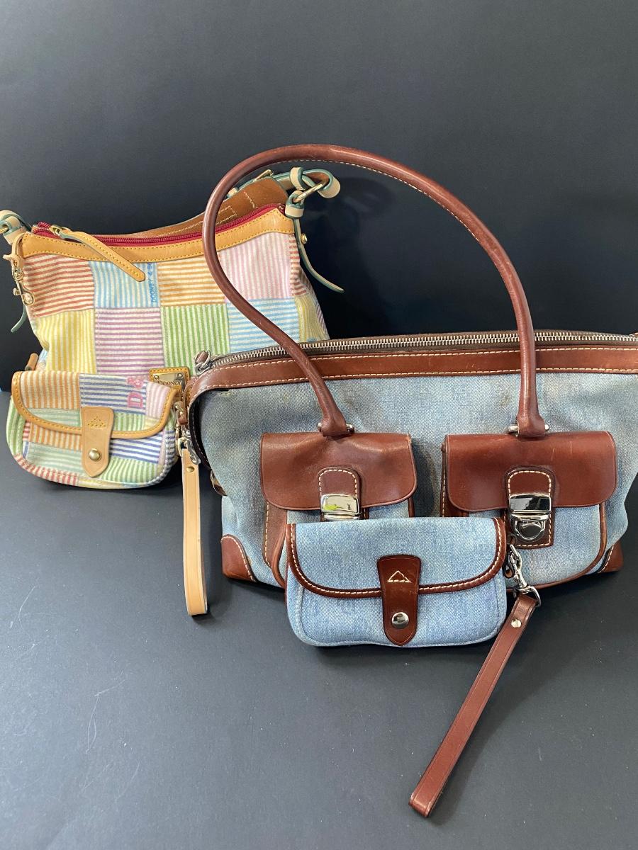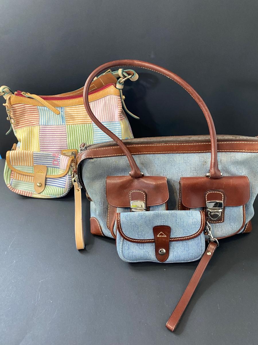 Denim and leather Dooney & Bourke Handbag. Includes matching wristlet. Pastel patchwork handbag also includes matching wristlet. Bags are in good, used condition. Please see all pictures as they are the best representation of the items. The pictures show condition, measurements if taken, and what is included in the lot. Due to the large amount that we photograph and the time frame, we are not always able to take measurements. All items unless noted, are pre-owned and have been used. If you purchased furniture, you must bring help. We do not allow one person to carry large furniture out on their own. Bring help, tools and a truck for the safety of our client’s homes, and your personal safety. Any damages that result to the property including walls, and floors due to moving of the furniture will be charged to the buyer. Company policy. Thank you.