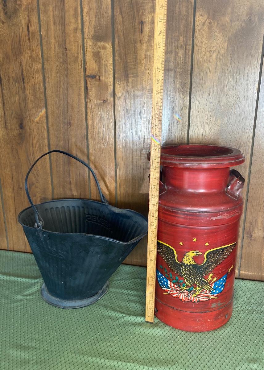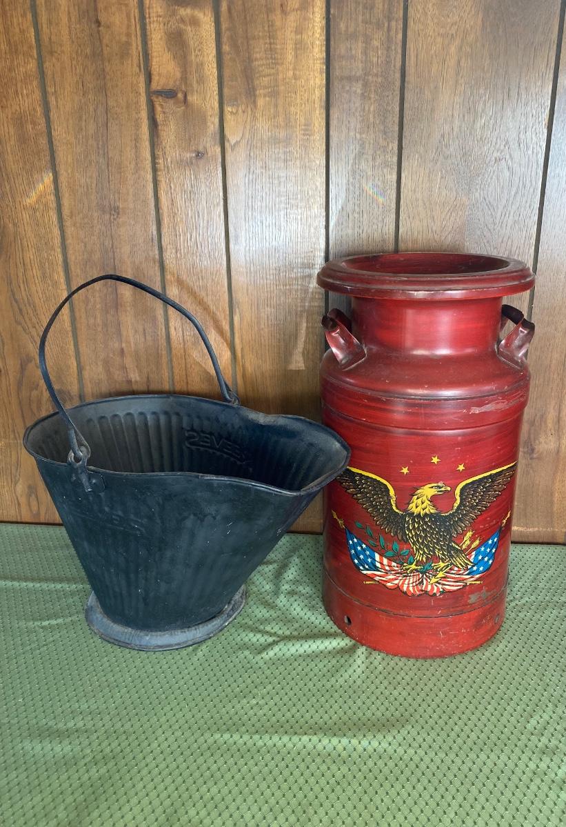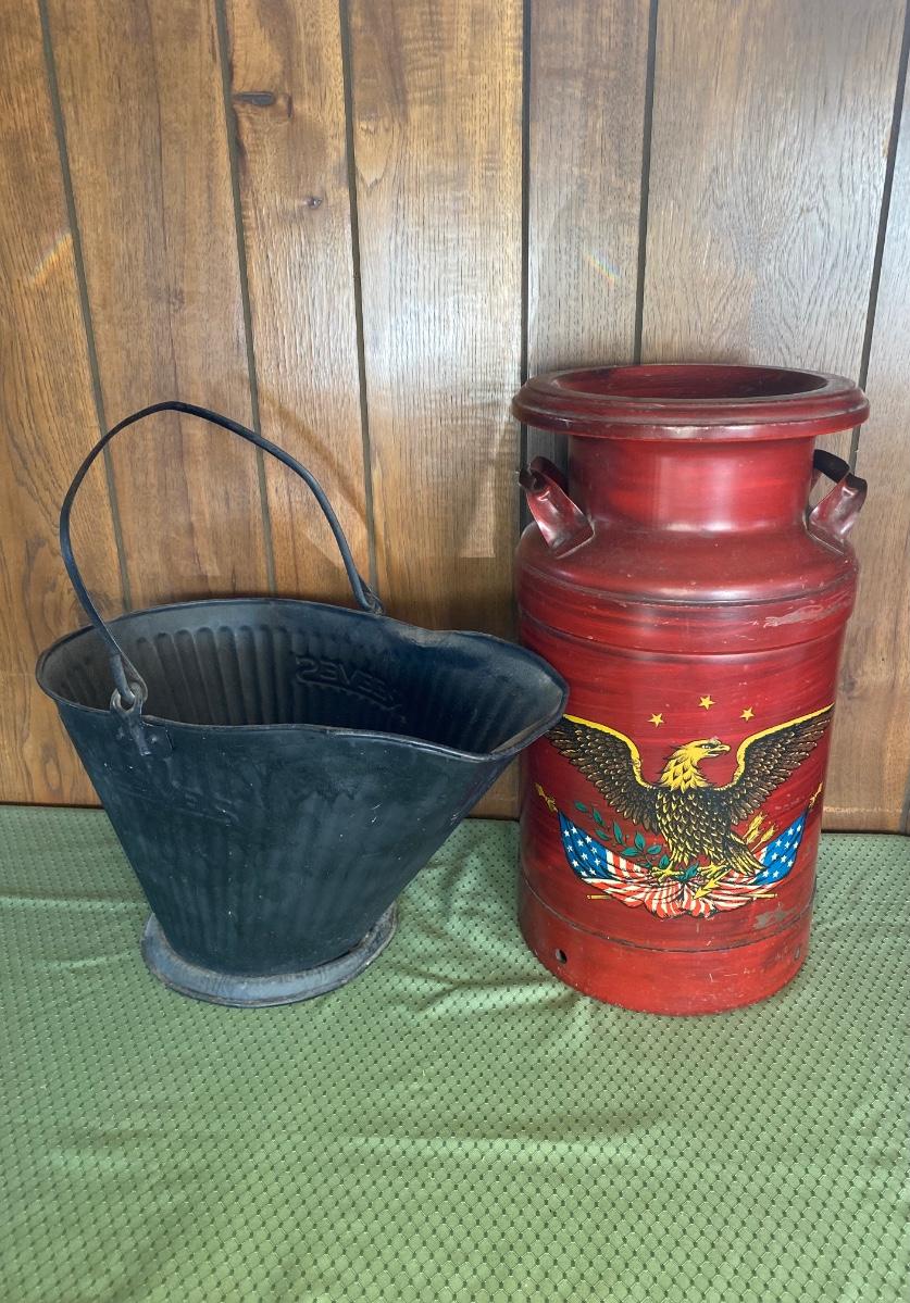 LOT 72: Vintage Painted Milk Can w/ Eagle Decal & Reeves Ash/Coal Bucket