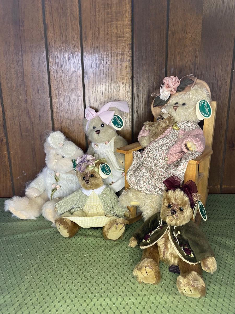 Five fancy bears from the Bearington Collection. Lot includes a wooden bear chair. Please see all pictures as they are the best representation of the items. The pictures show condition, measurements if taken, and what is included in the lot. Due to the large amount that we photograph and the time frame, we are not always able to take measurements. All items unless noted, are pre-owned and have been used. If you purchased furniture, you must bring help. We do not allow one person to carry large furniture out on their own. Bring help, tools and a truck for the safety of our client’s homes, and your personal safety. Any damages that result to the property including walls, and floors due to moving of the furniture will be charged to the buyer. Company policy. Thank you.