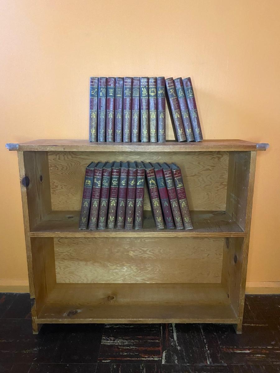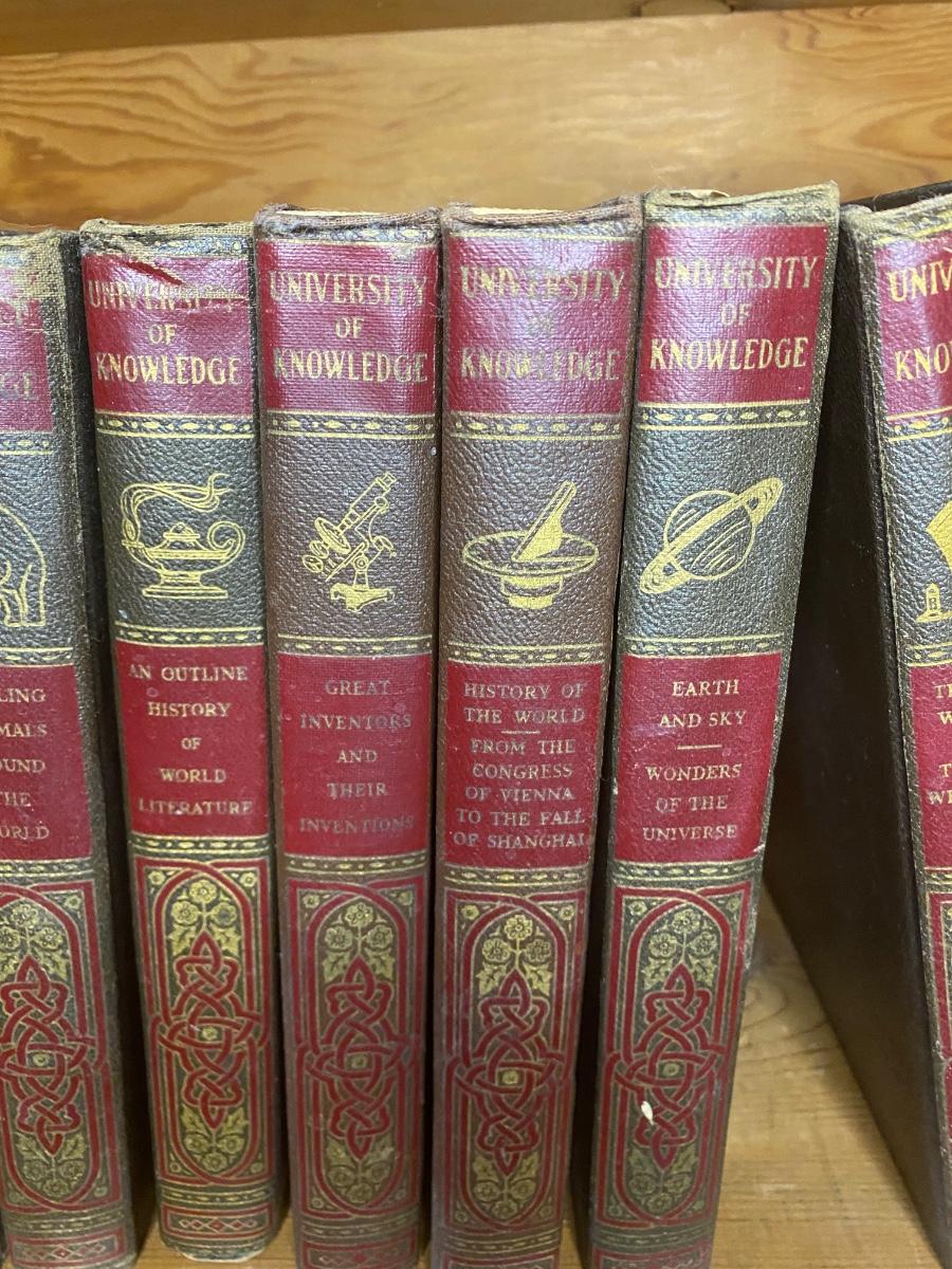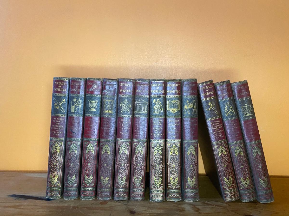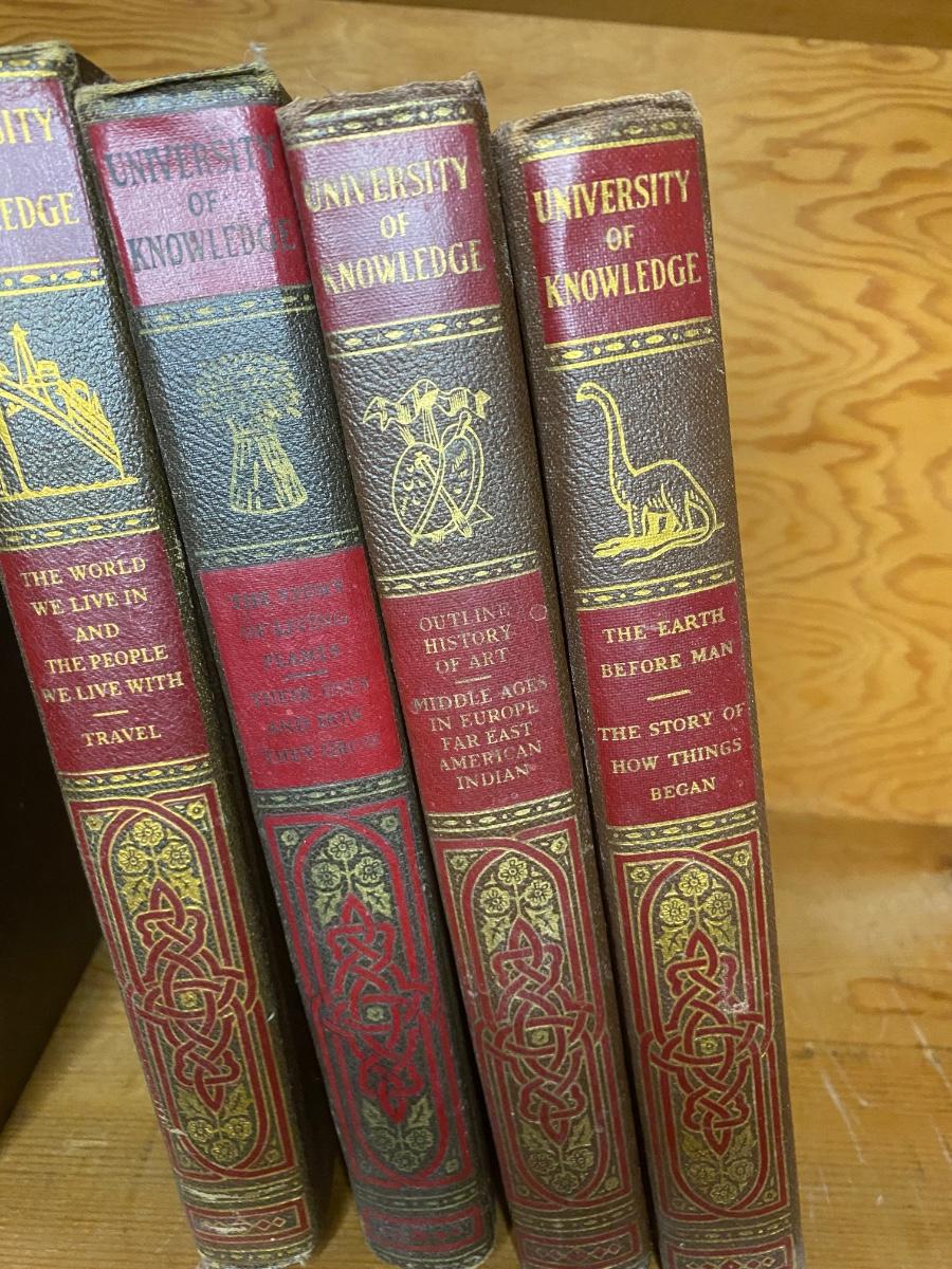 LOT 90C: Wood Bookcase and University of Knowledge Encyclopedias