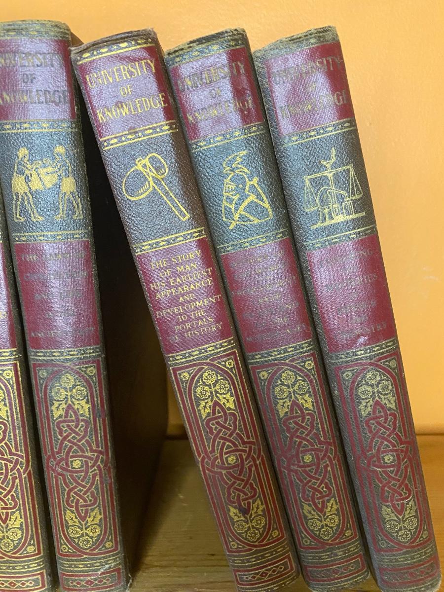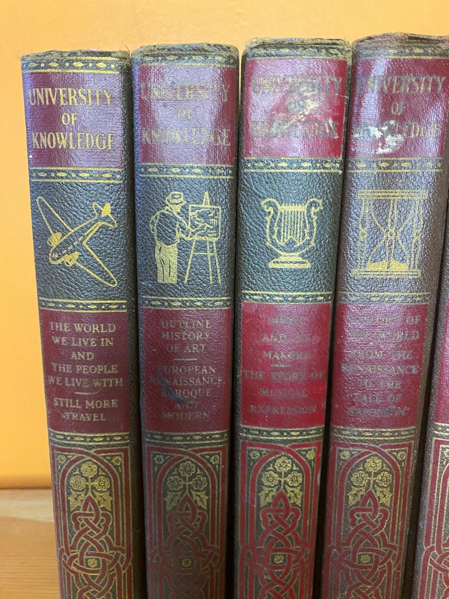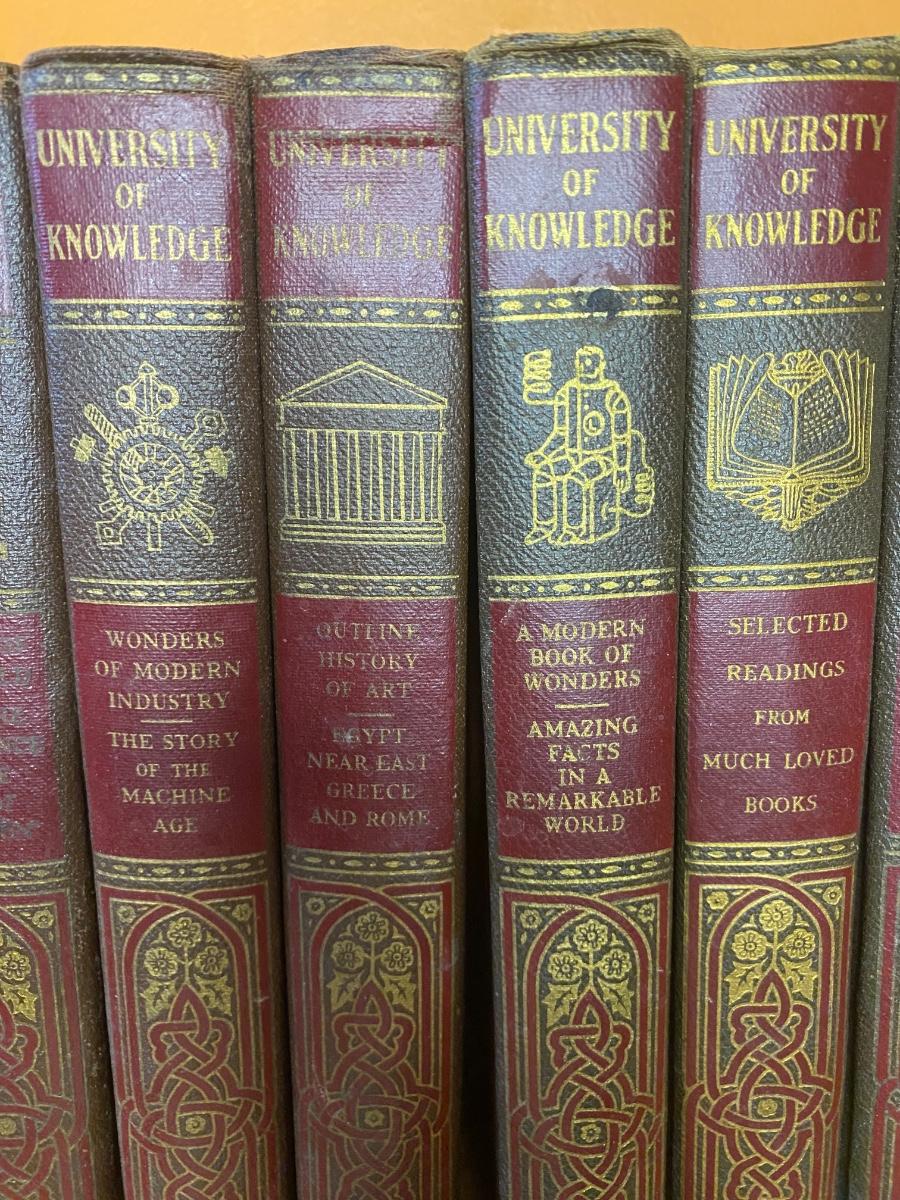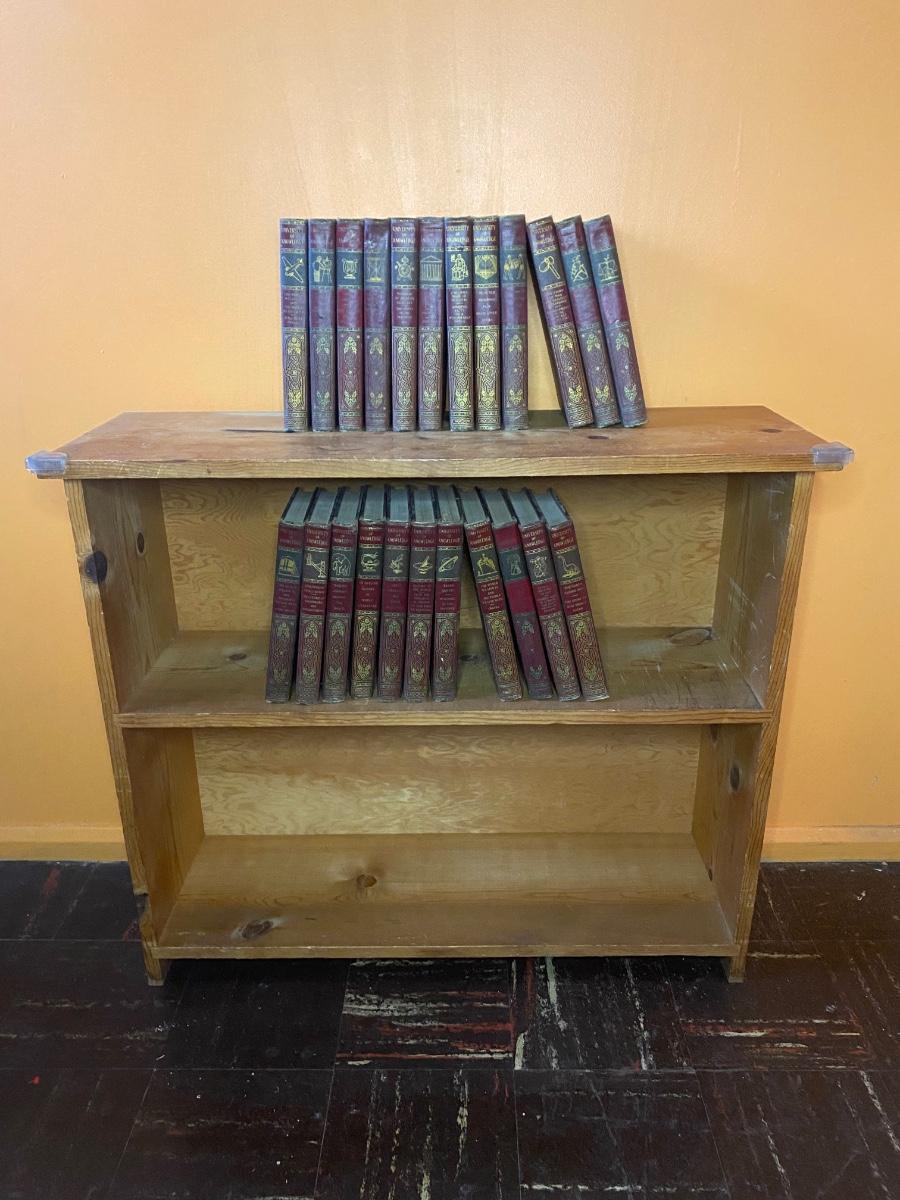 LOT 90C: Wood Bookcase and University of Knowledge Encyclopedias