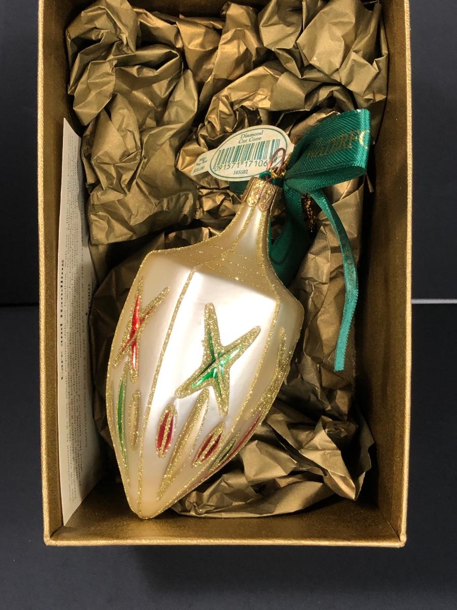 Set of 2 Peacock Grande 3" Balls, handmade in Germany. Gingerbread Girl Cookie, handmade in Czech Republic. Diamond Cut Cone from the Nostalgia Collection, handmade in Czech Republic.