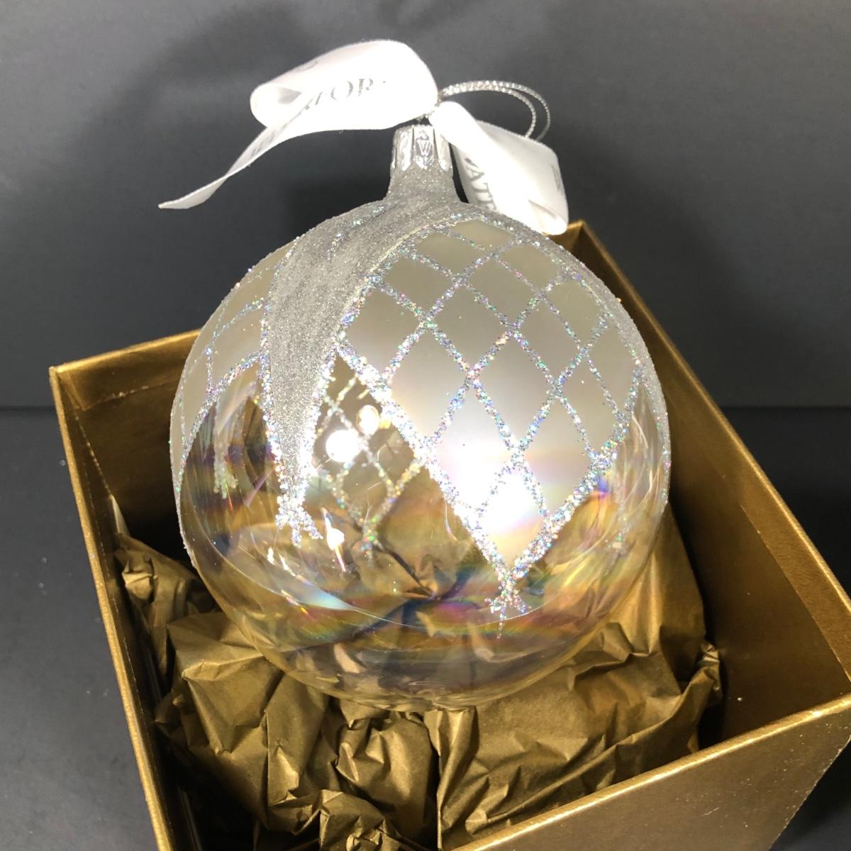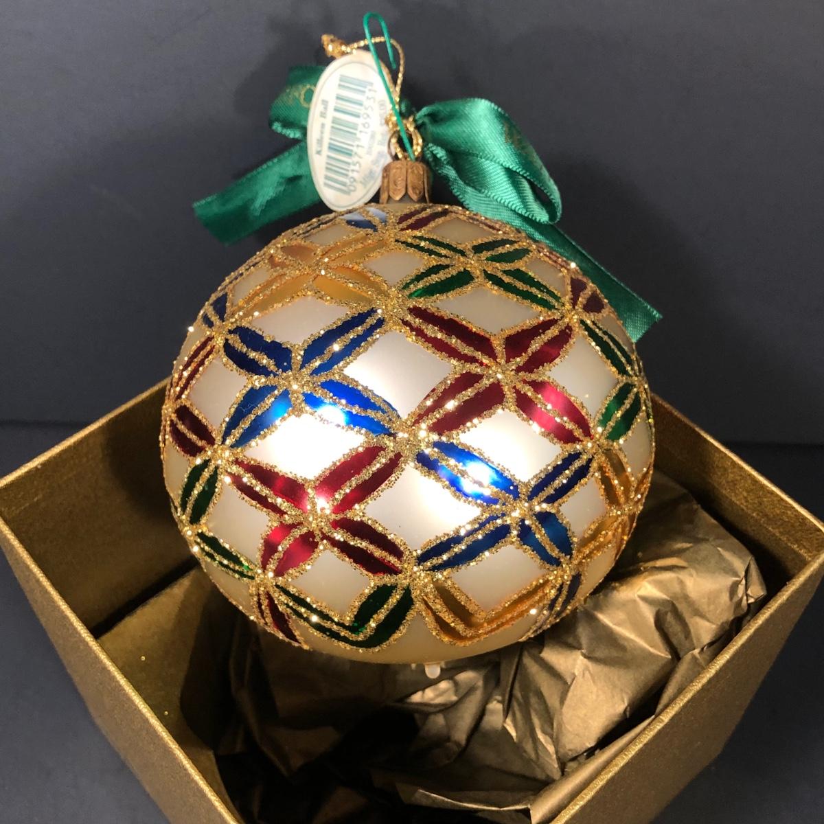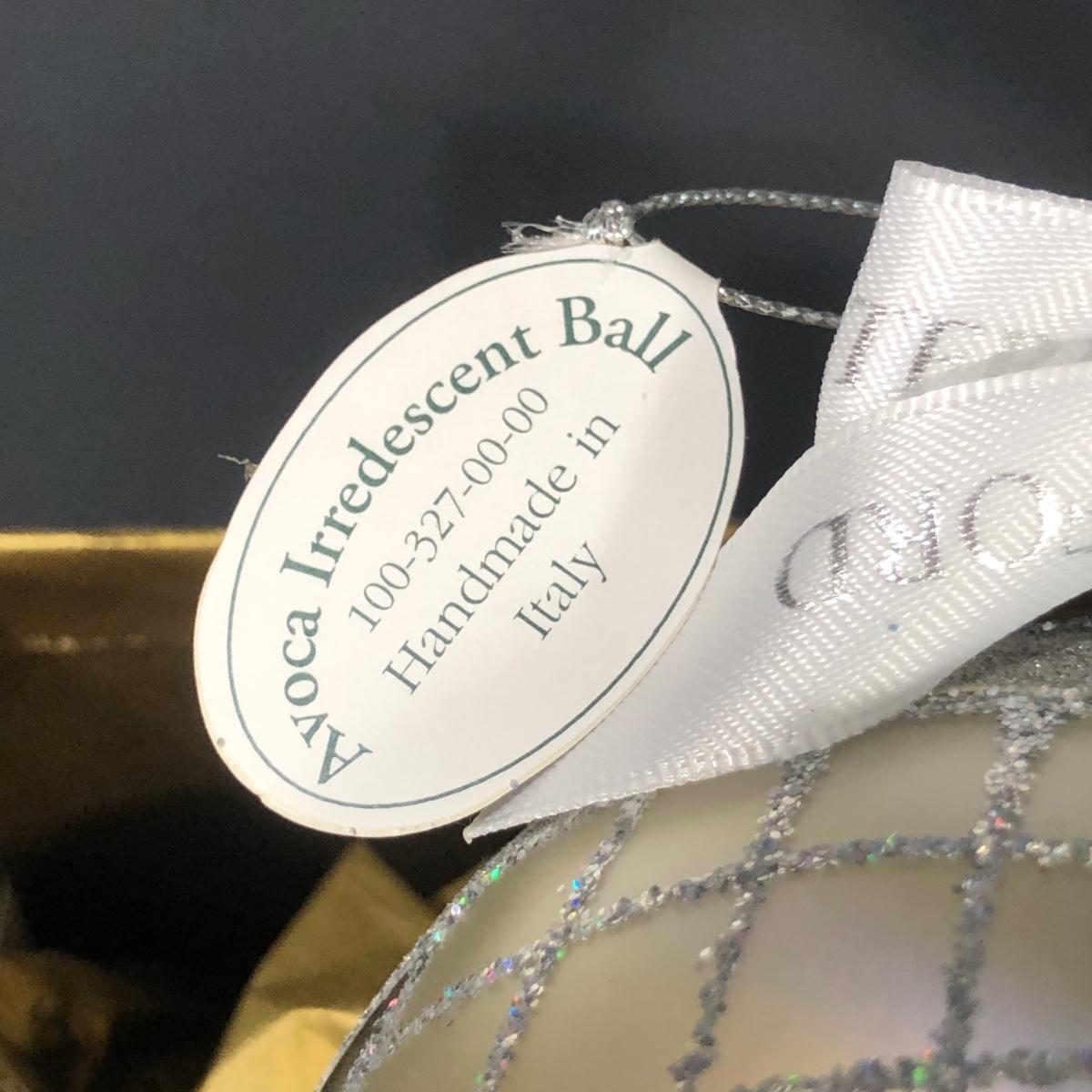 Santa's Workshop, handmade in Poland. Killeen Ball from the Nostalgic Collection, handmade in Poland. Avoca Irredescent [sic] Ball from the Winter Wonderland Collection, handmade in Italy.