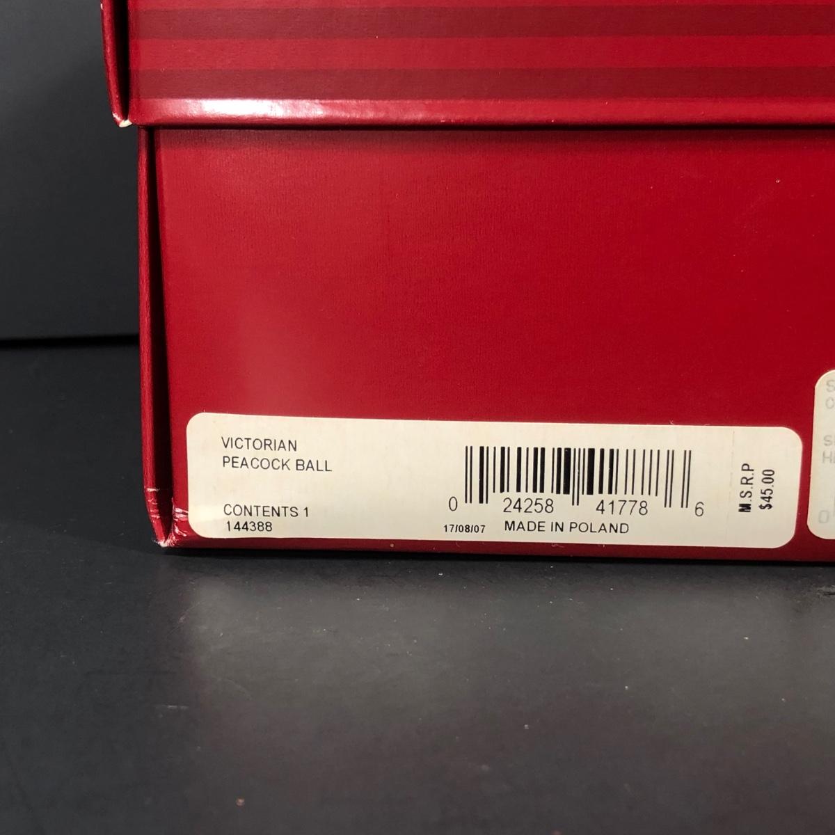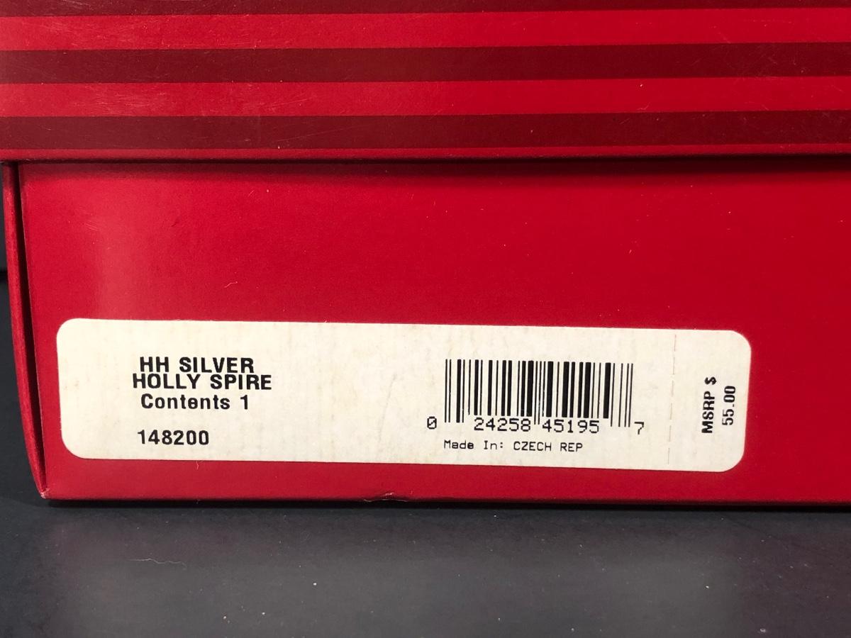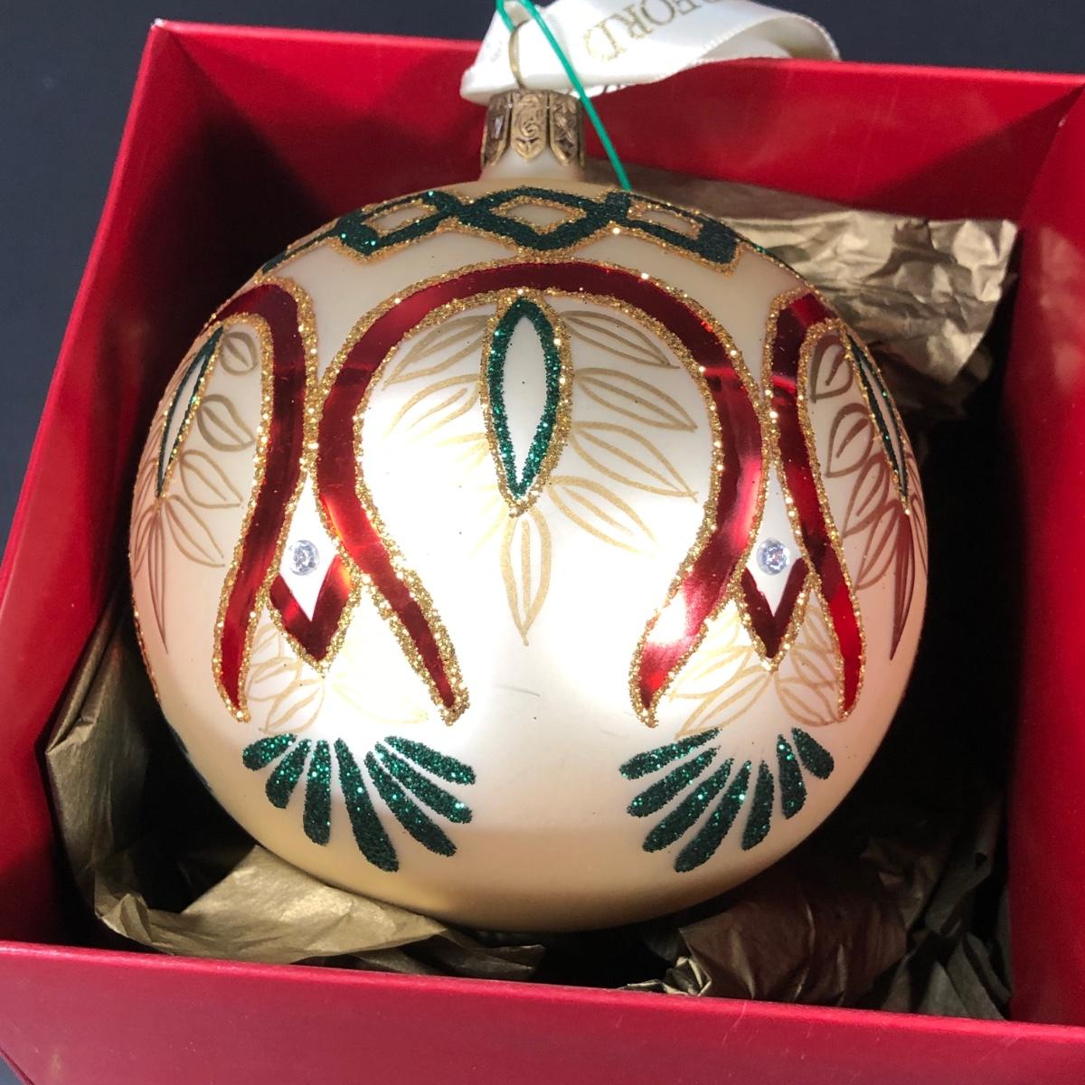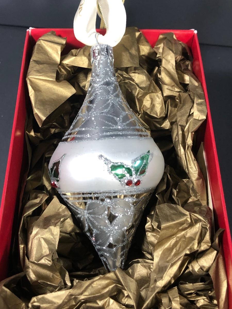 Victorian Peacock Ball, handmade in Poland. Holiday Festive Holly Ball, handmade in Poland. Silver Holly Spire, handmade in Czech Republic.