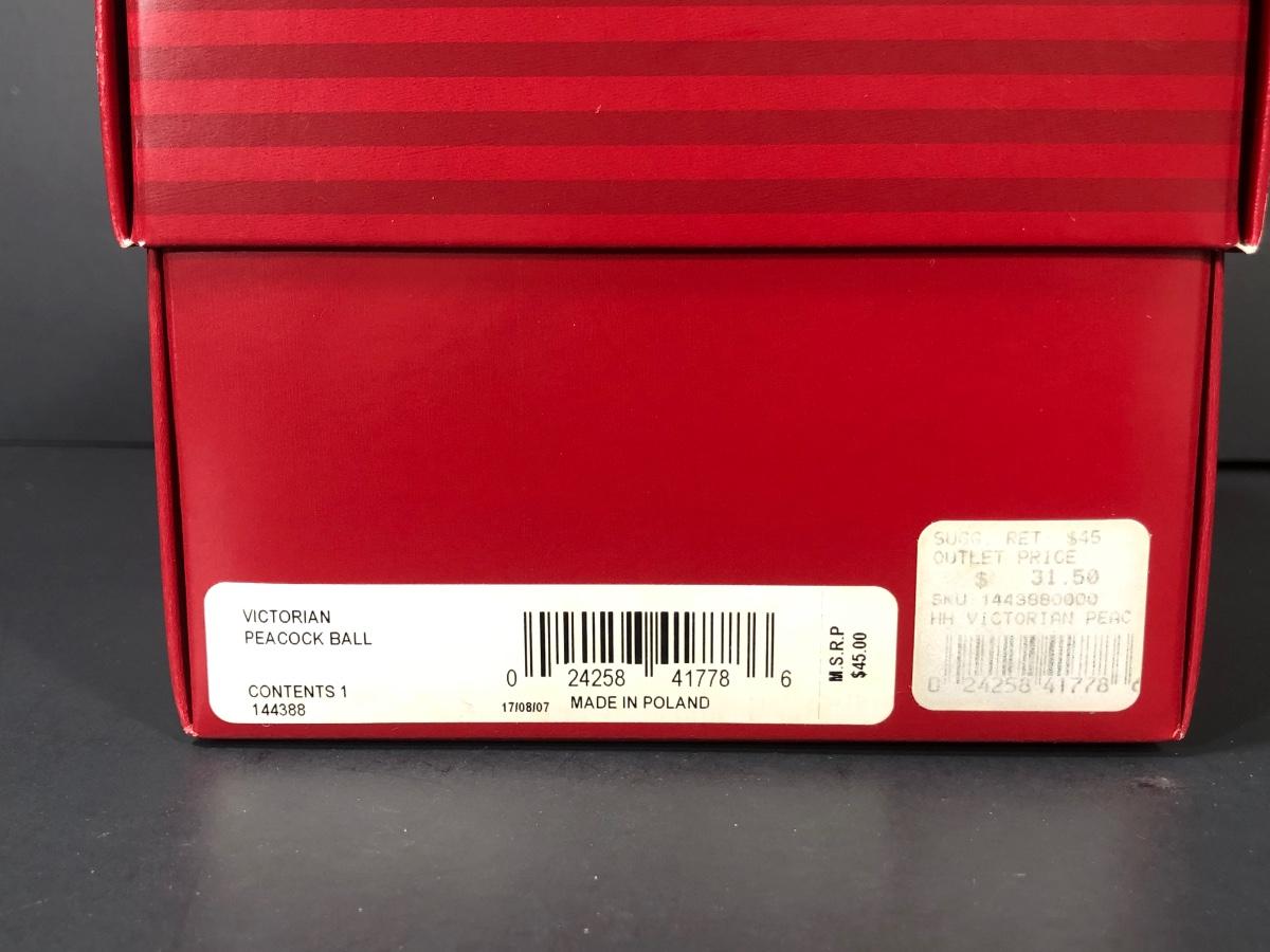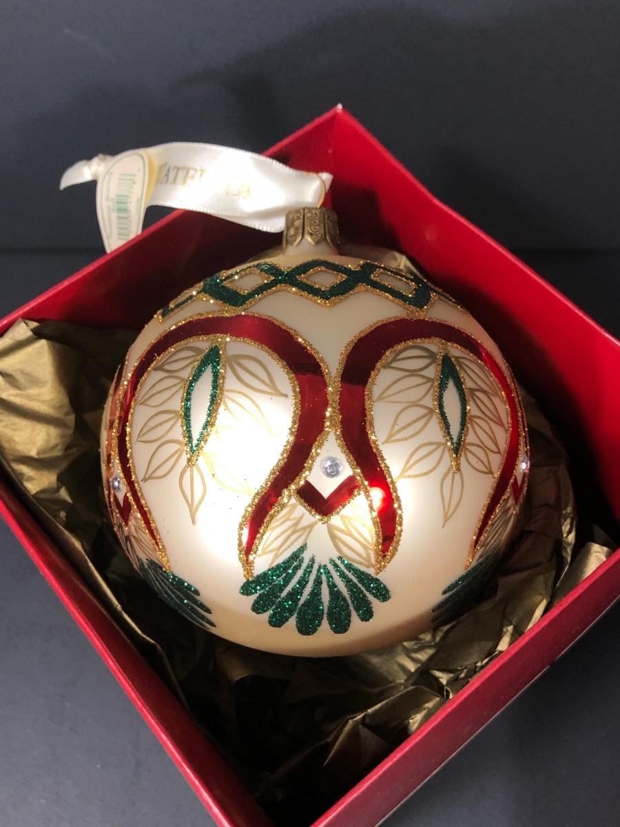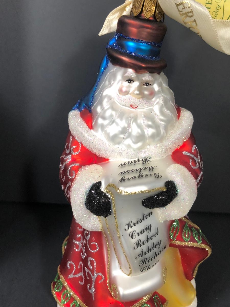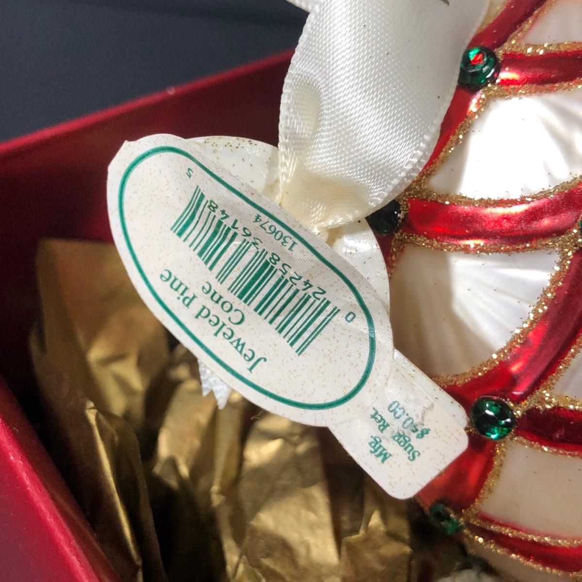 Victorian Peacock Ball, handmade in Poland. Jeweled Pine Cone. Checking It Twice Santa, handmade in China.