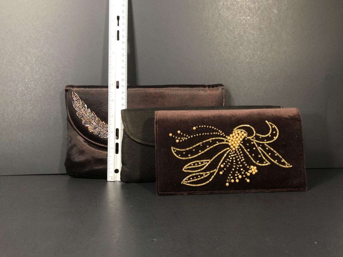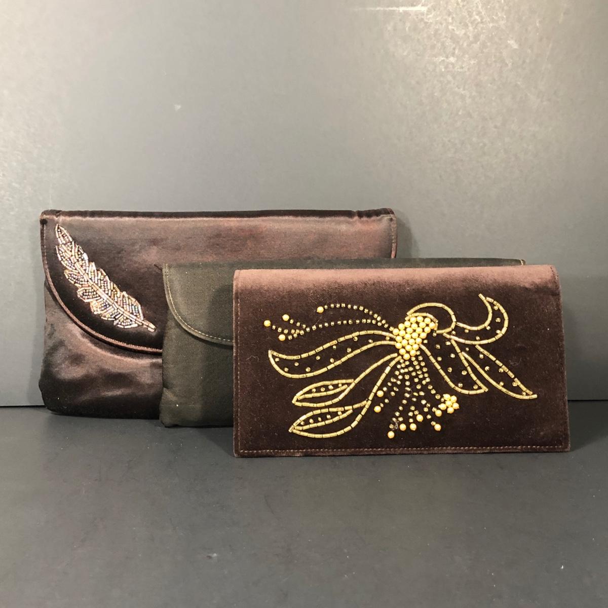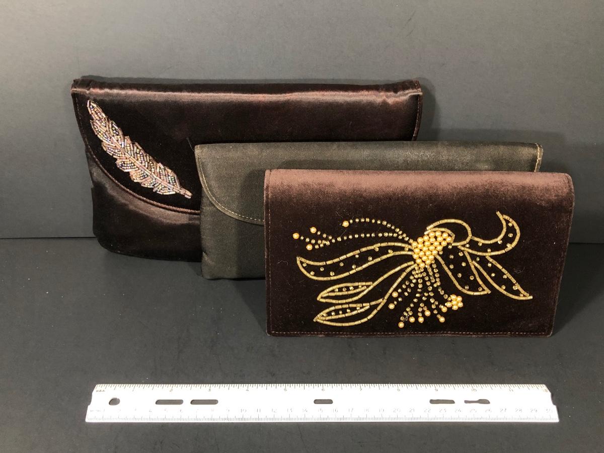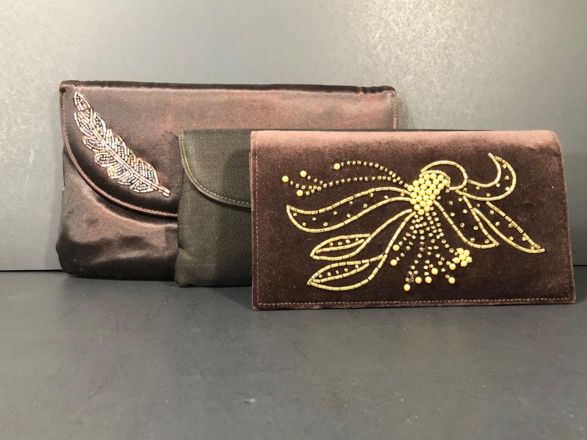 Includes 2 small beaded purses and one cloth clutch. One has a beaded feather and goldtone chain.