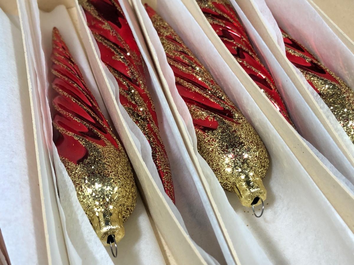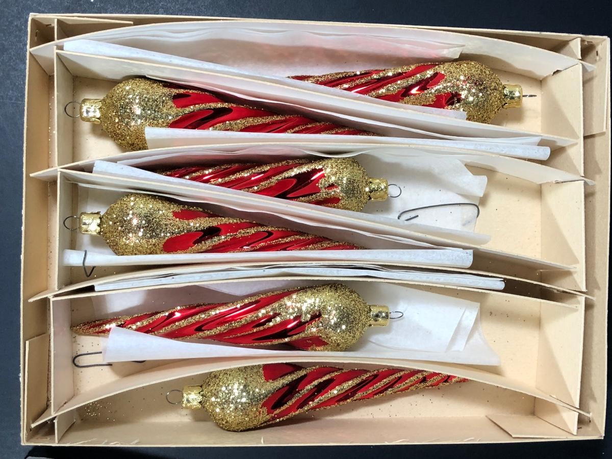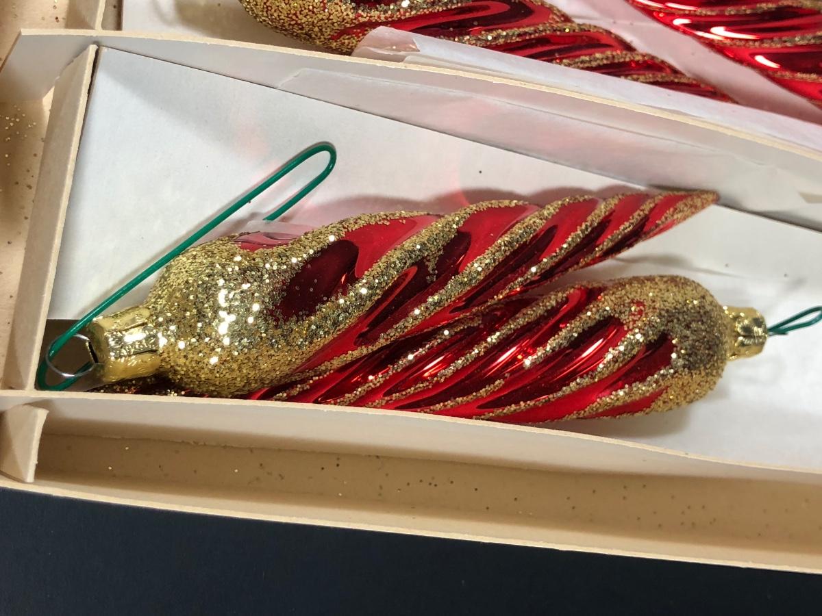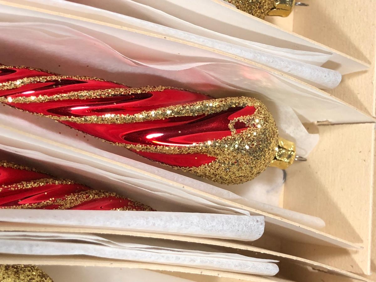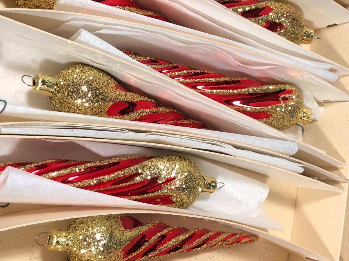 Includes three boxes of swirling hand-blown red glass ornaments with gold colored glitter. 6.5" in length. 15 pieces total. Made in the Czech Republic.