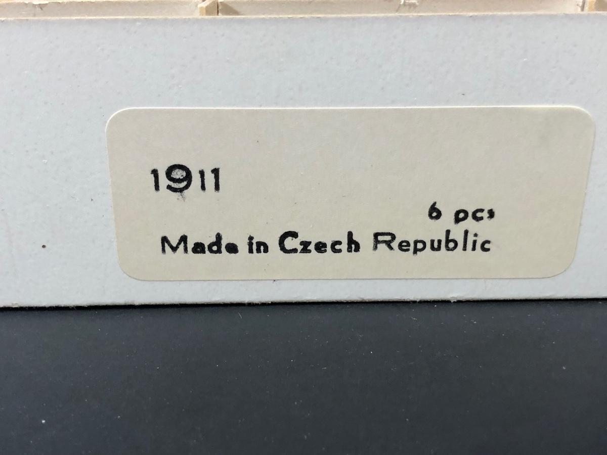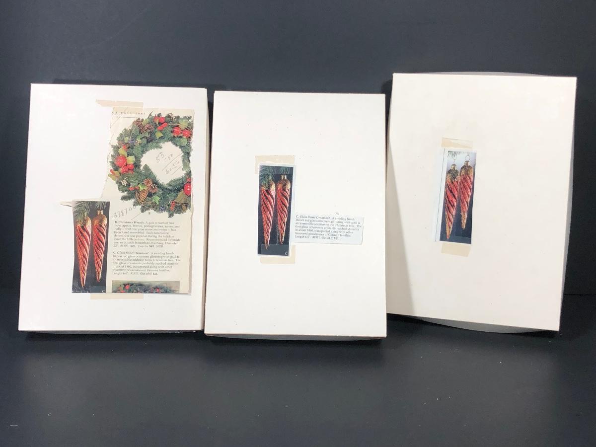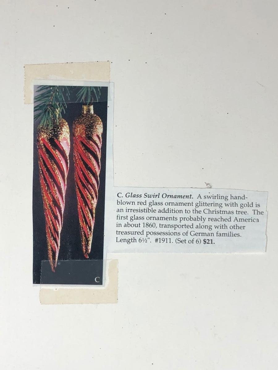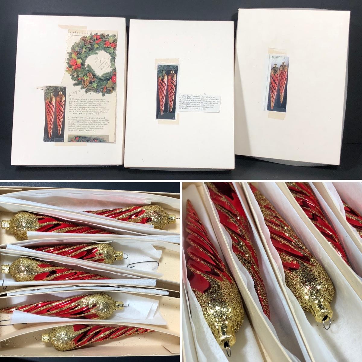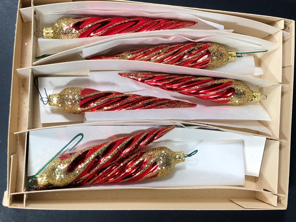 Includes three boxes of swirling hand-blown red glass ornaments with gold colored glitter. 6.5" in length. 15 pieces total. Made in the Czech Republic.