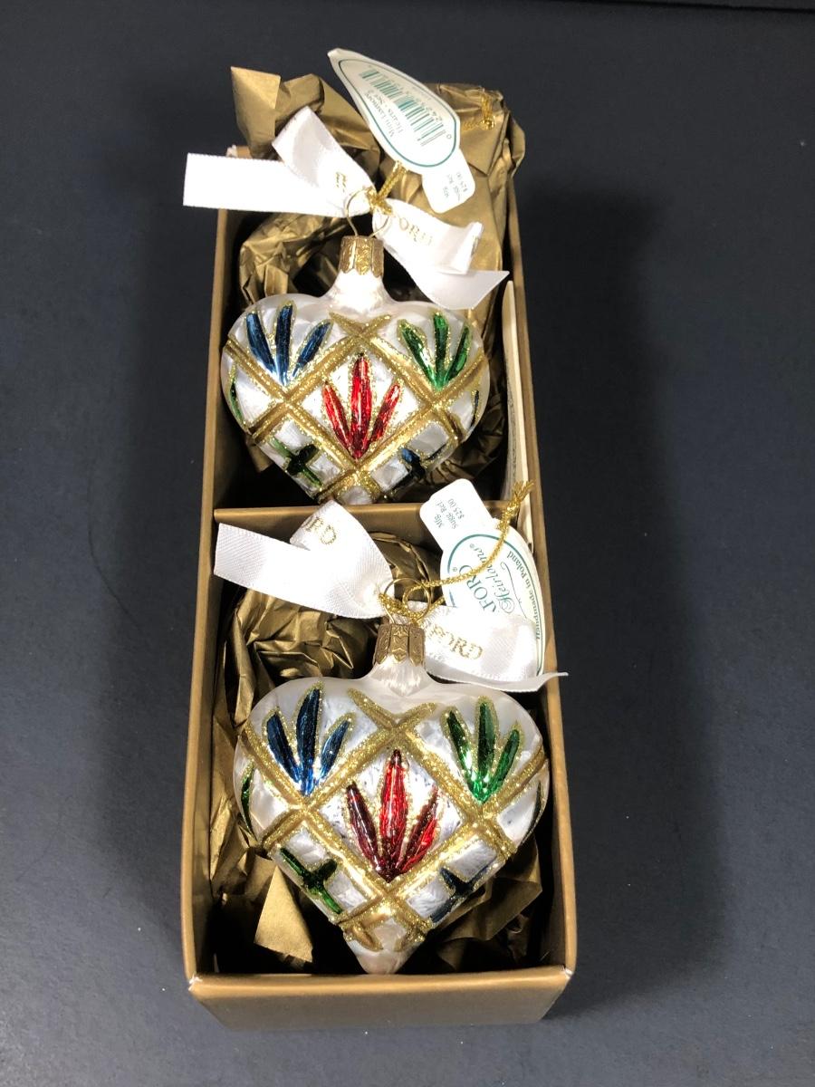 Santa's Sleigh Ride from the Nostalgic Collection, handmade in the Czech Republic and signed on the bottom. Set of 2 Mini Lismore Hearts, handmade in Poland. Times Square Pyramid.