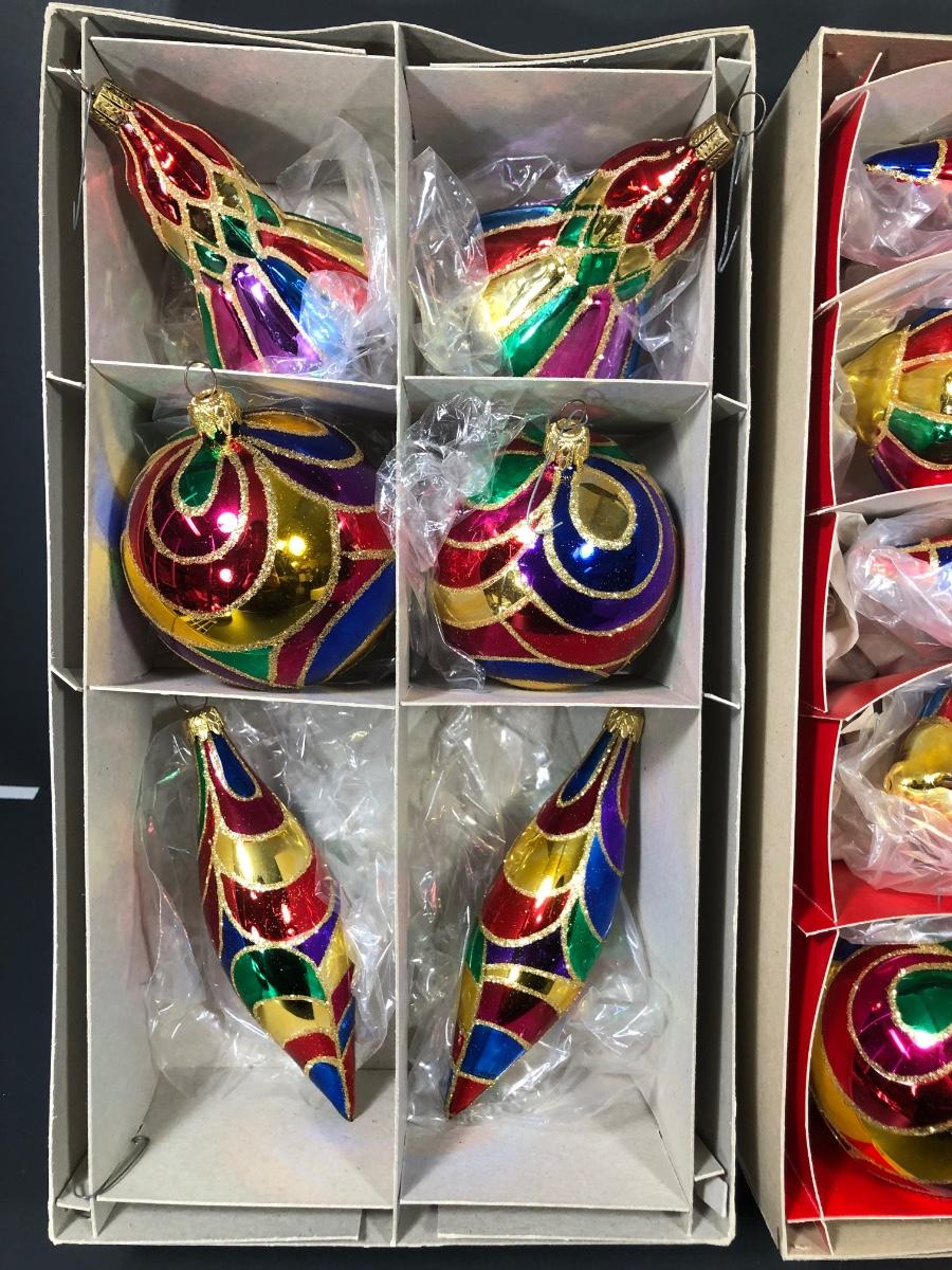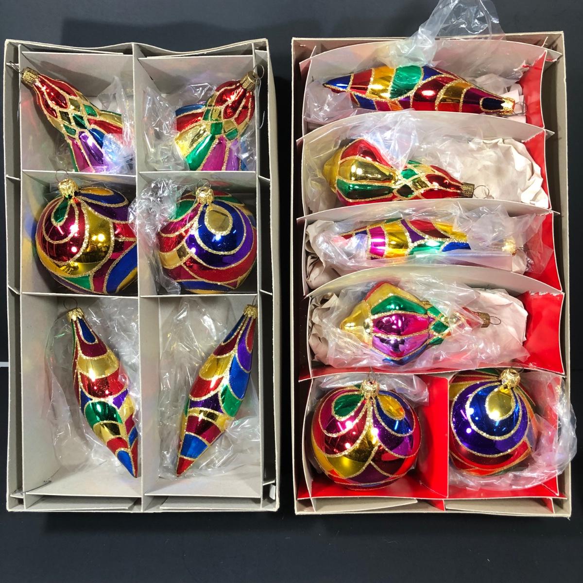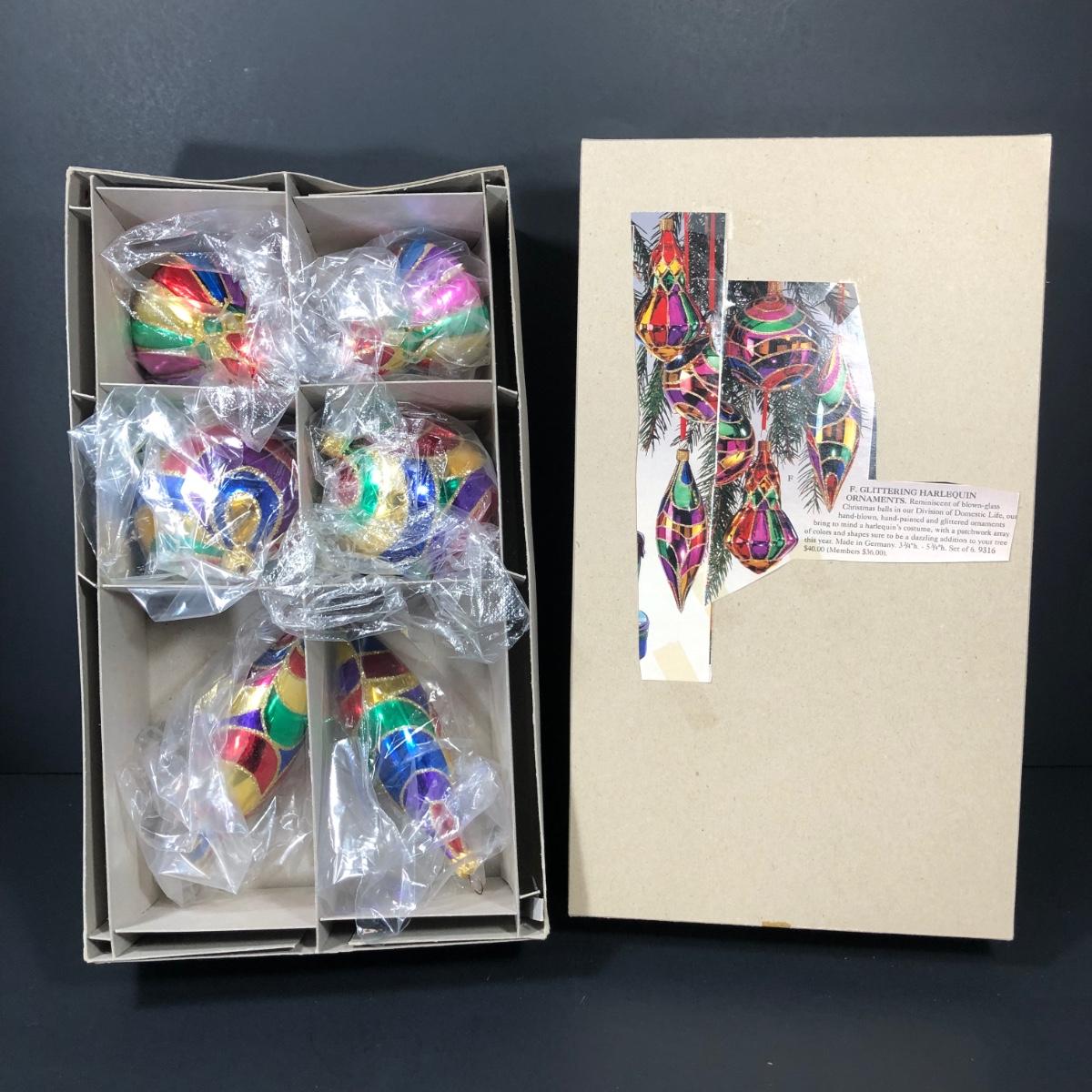 Includes 2 full sets of glittering harlequin ornaments made in Germany.