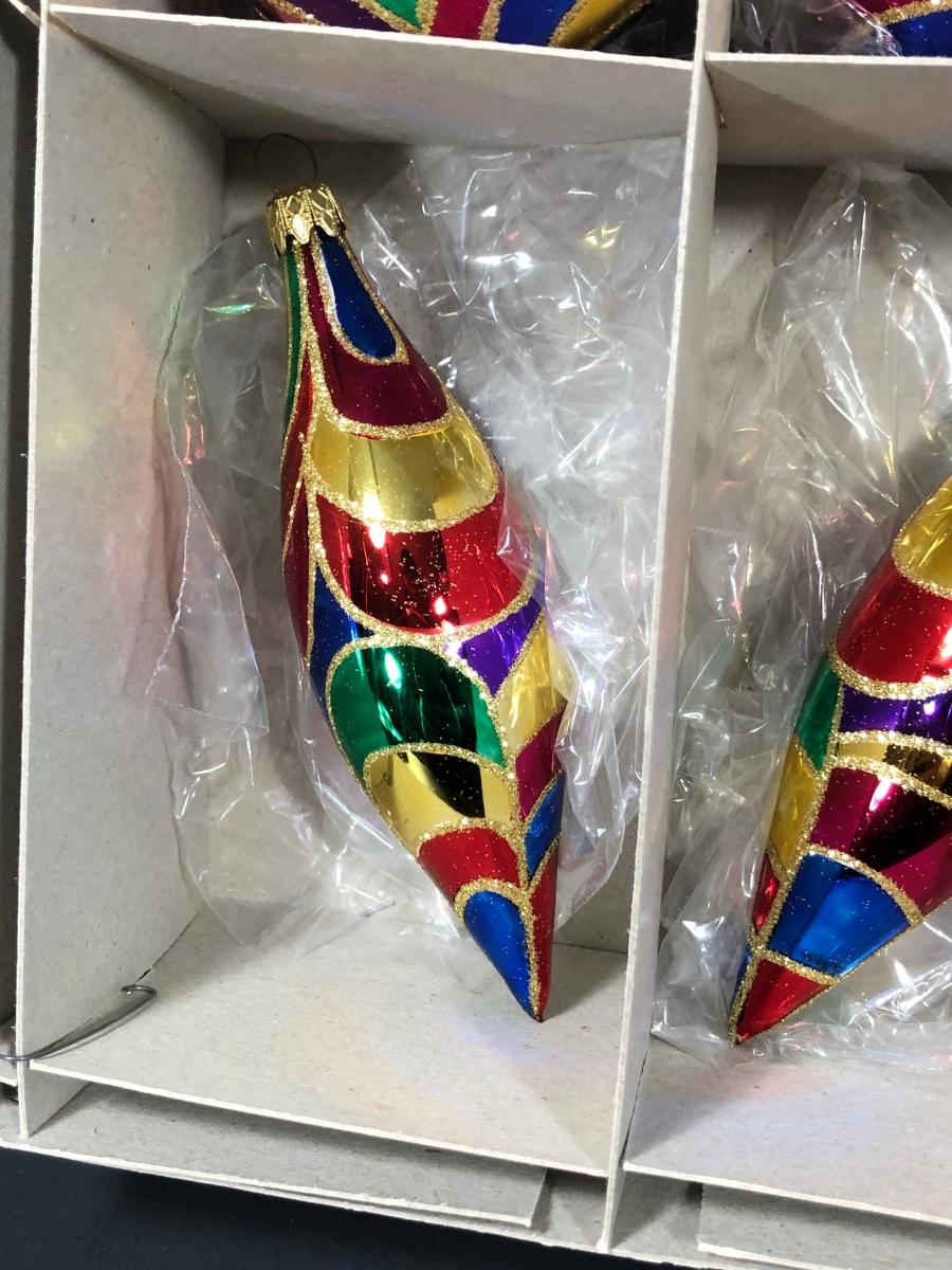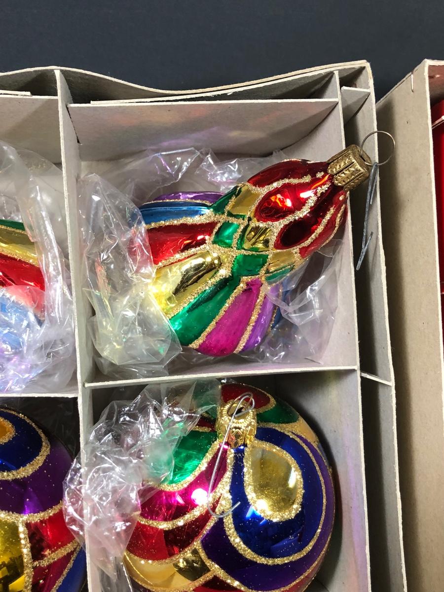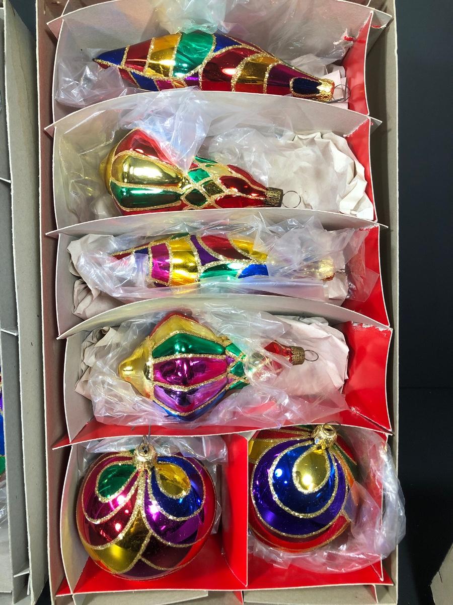 Includes 2 full sets of glittering harlequin ornaments made in Germany.