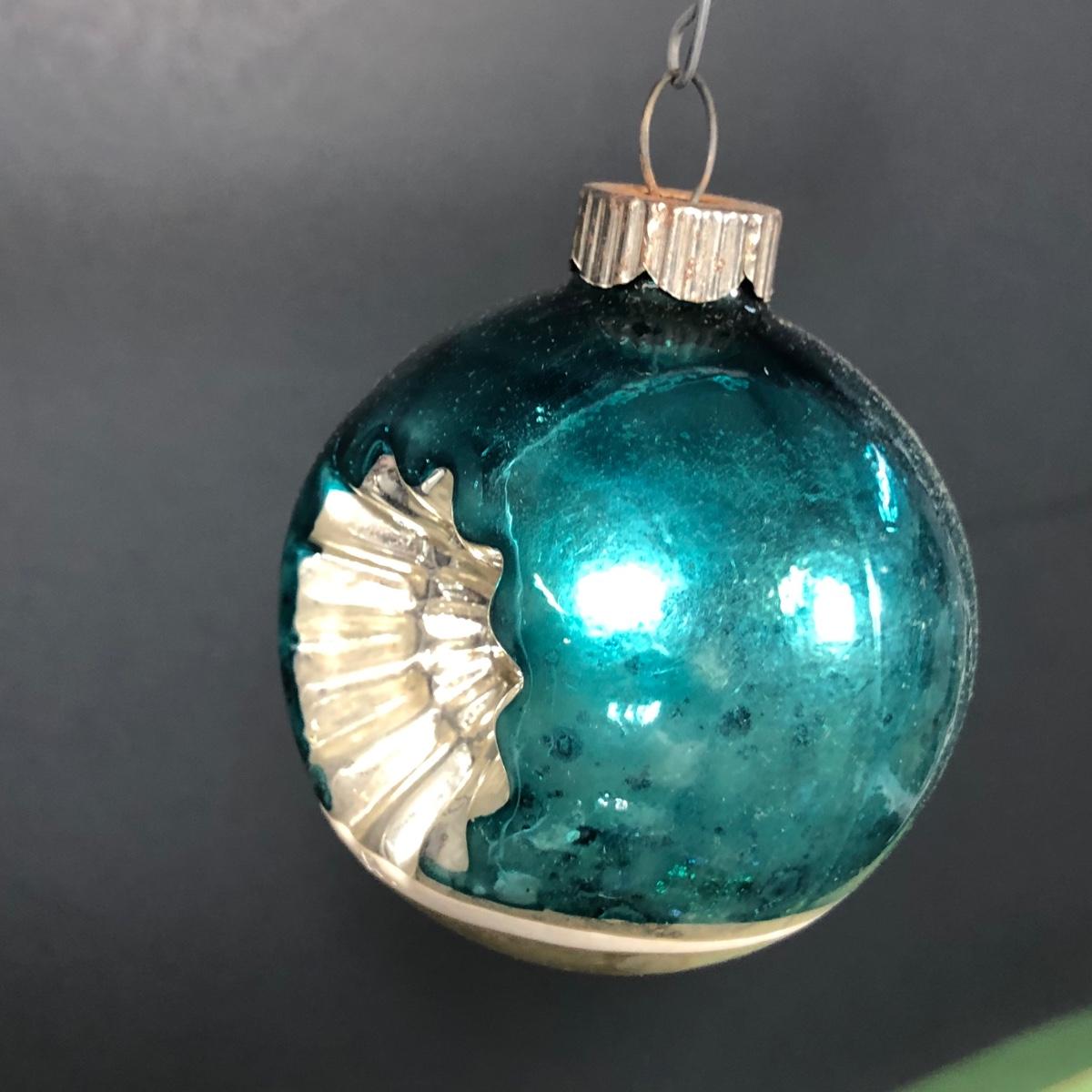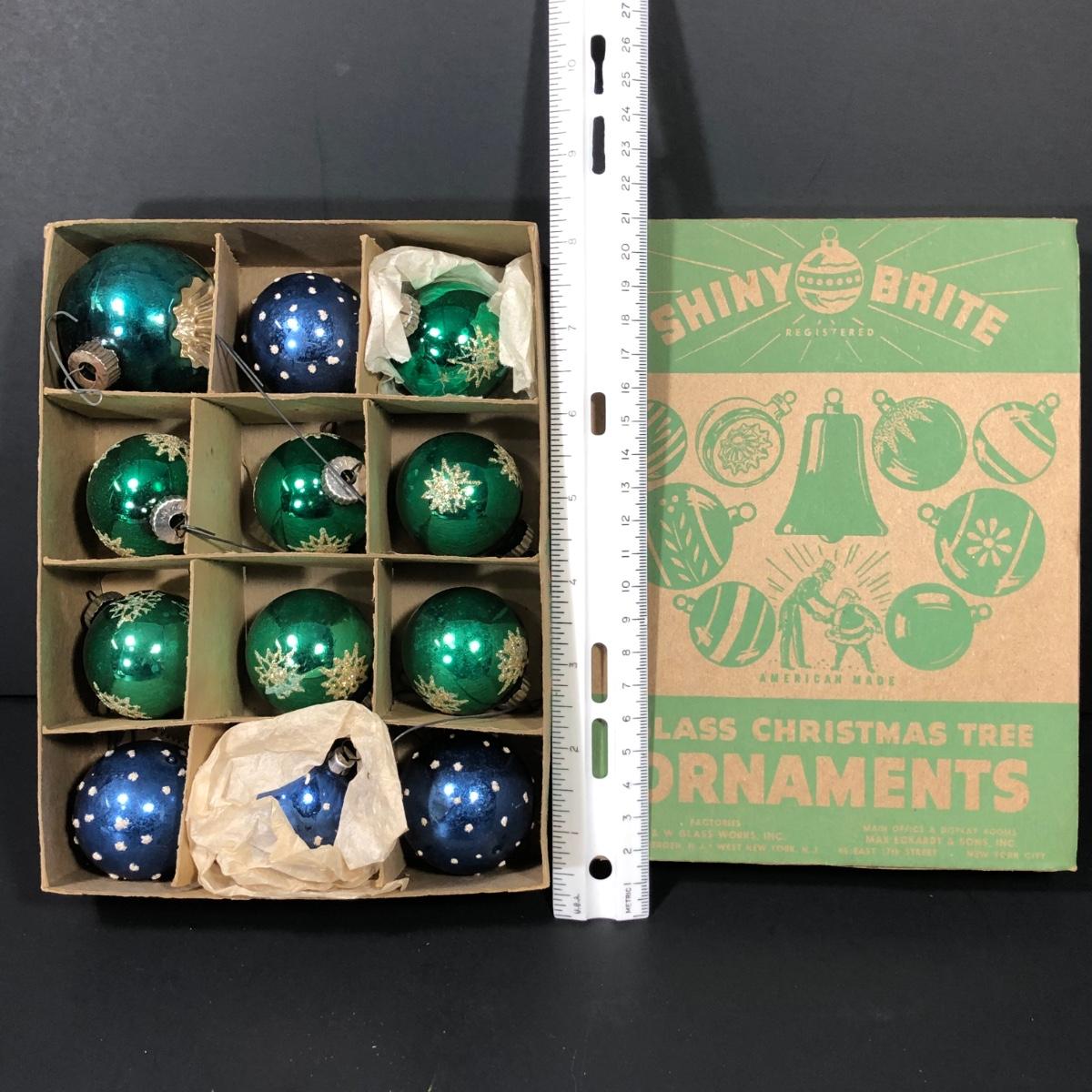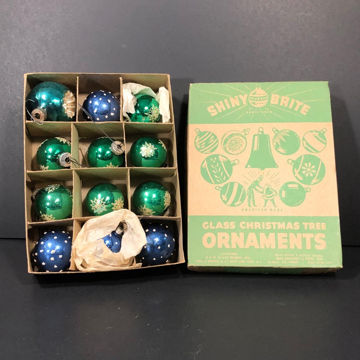 Includes a set of 12 green and blue Shiny Brite ornaments. Made in the United States.