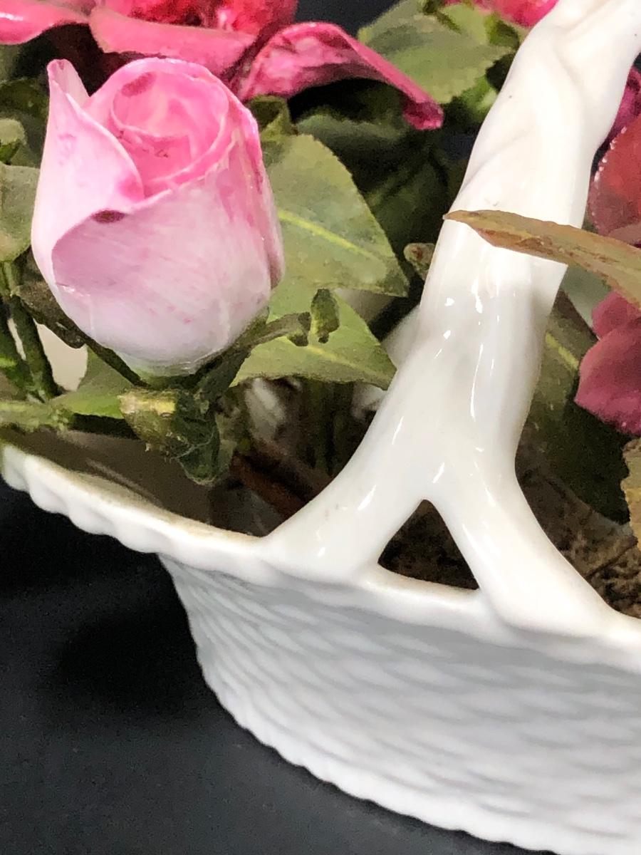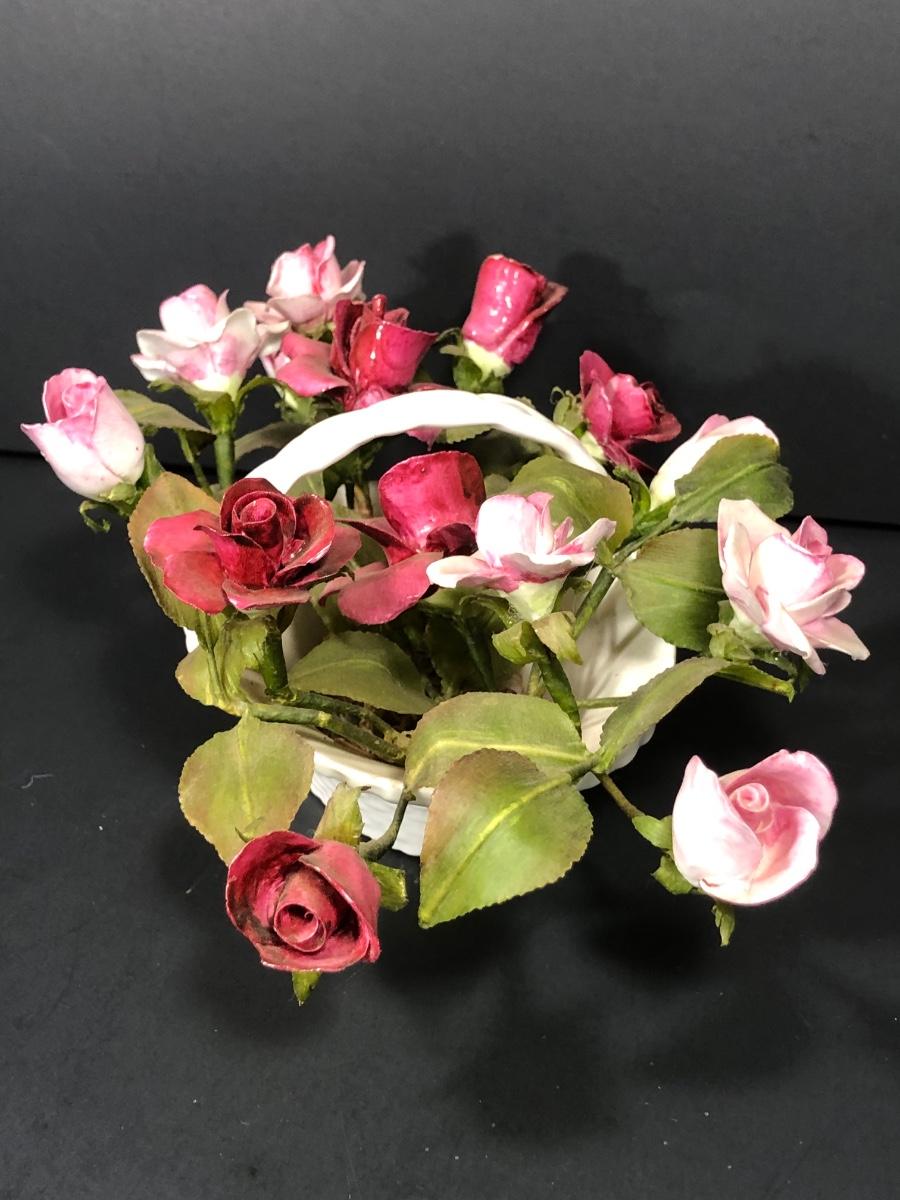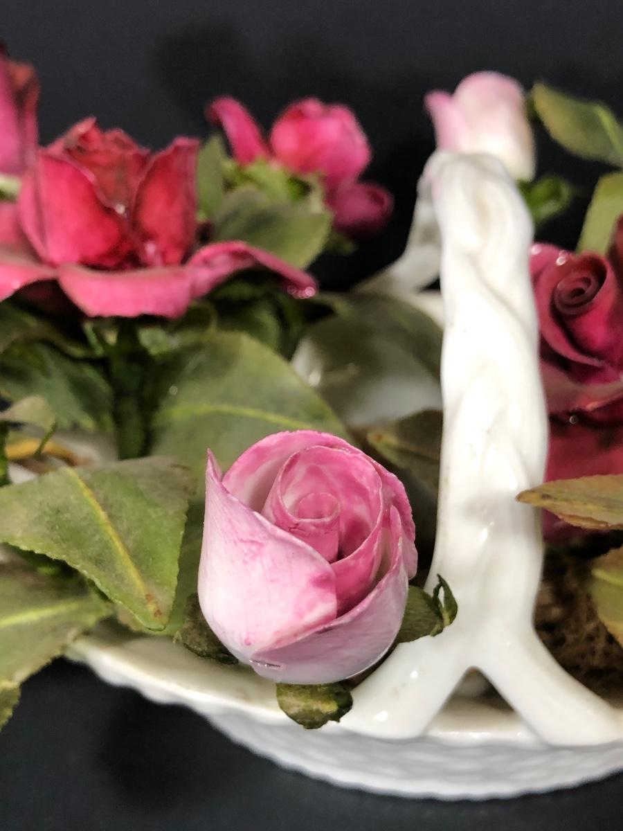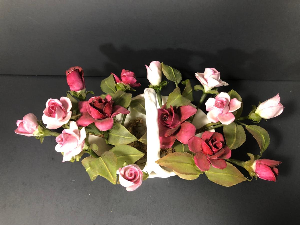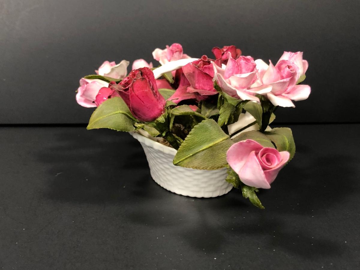 Fine bone china basket of red and pink flowers made in Staffordshire England.