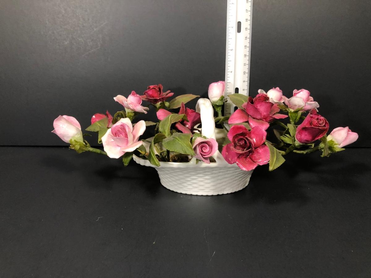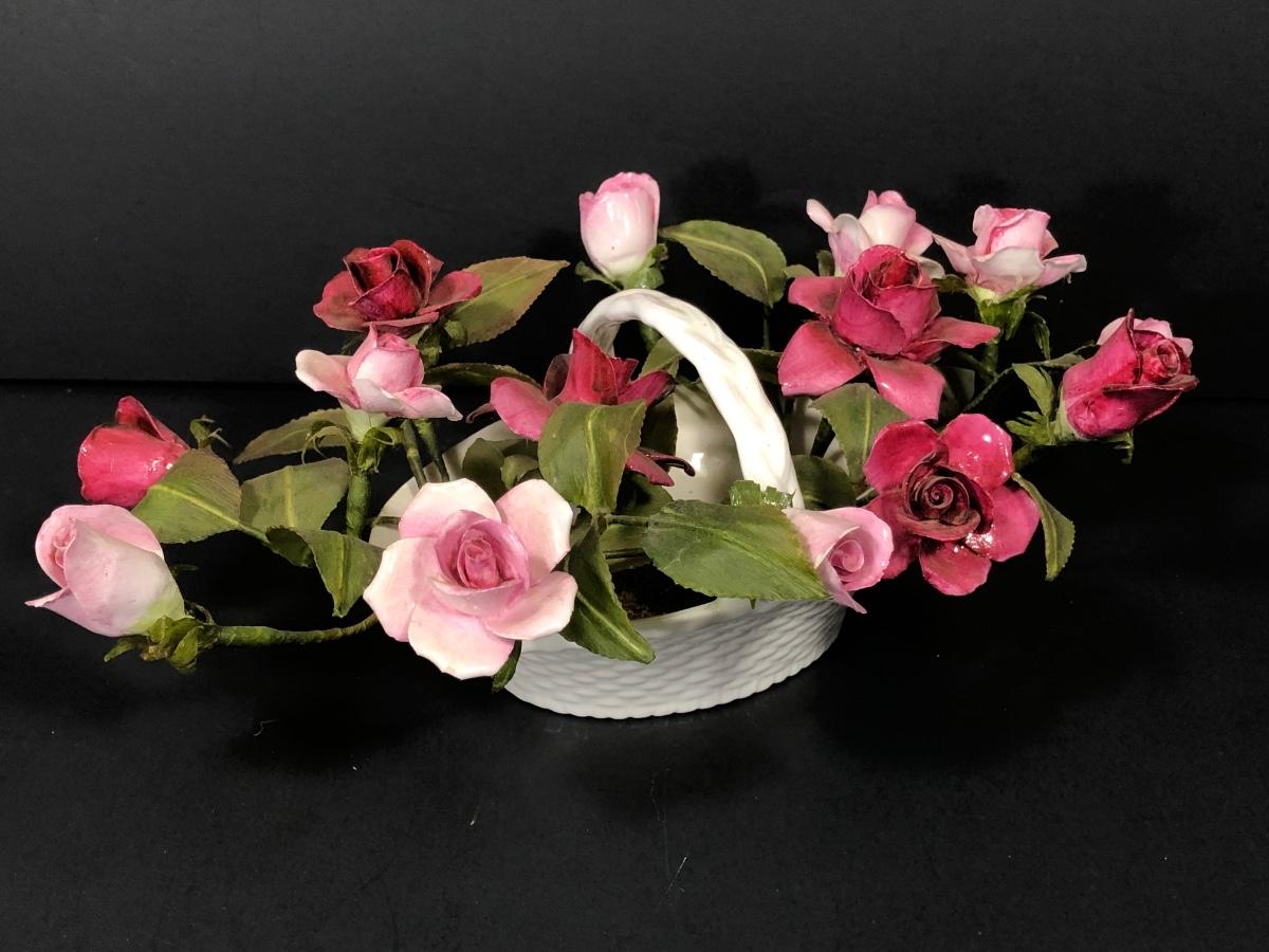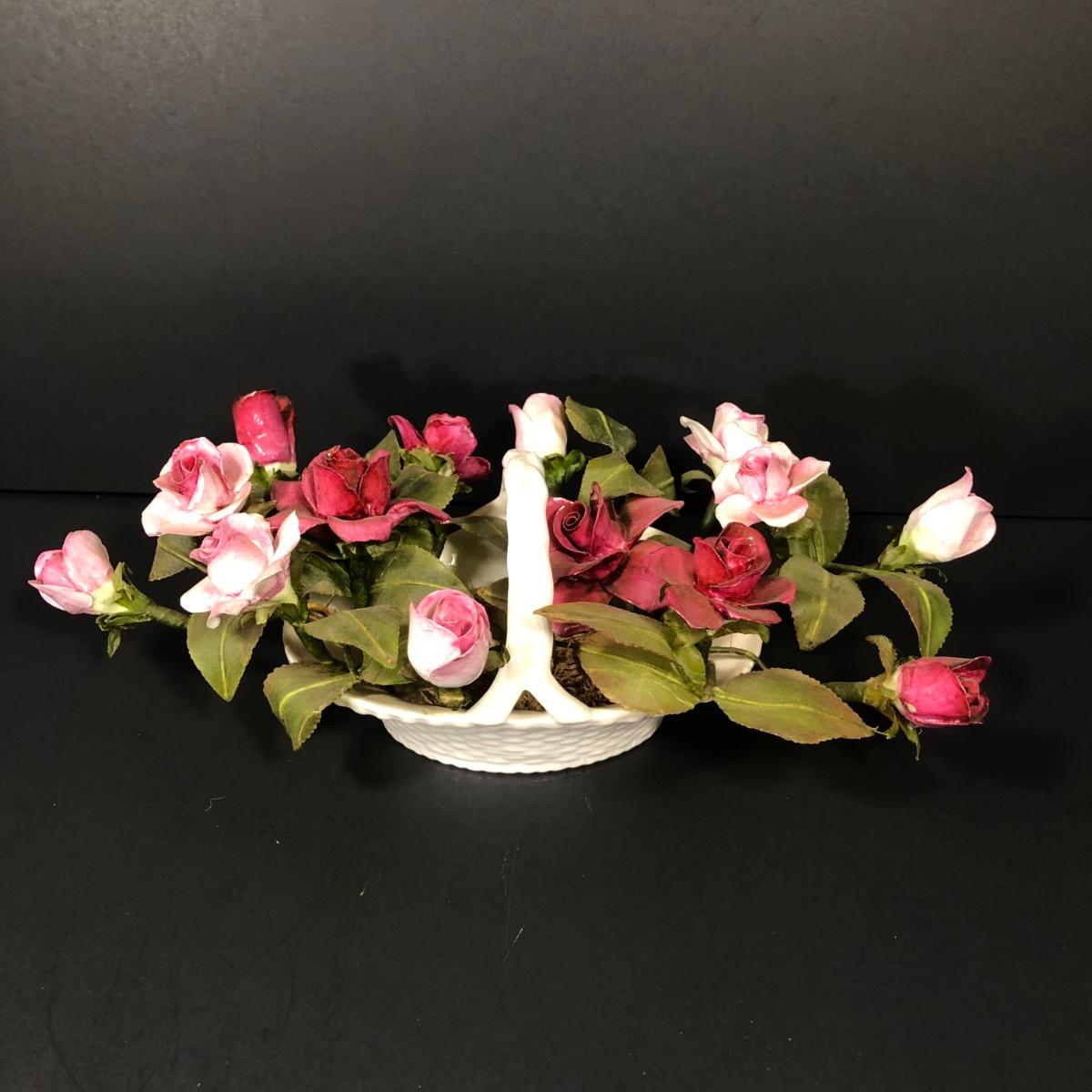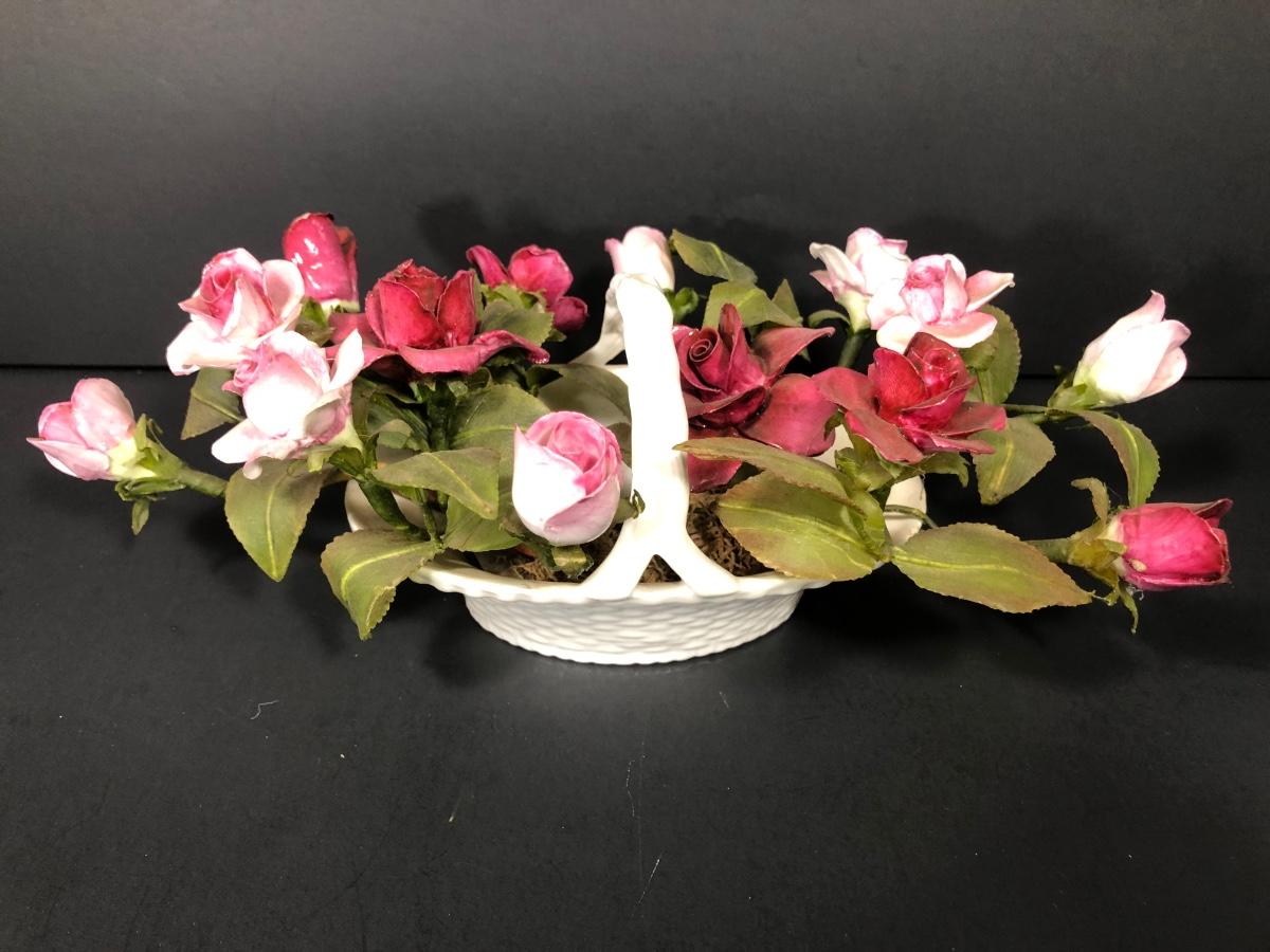 Fine bone china basket of red and pink flowers made in Staffordshire England.
