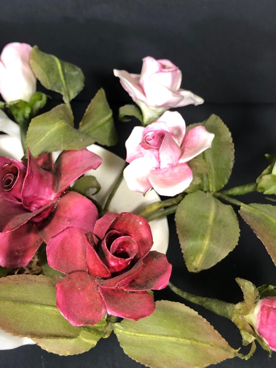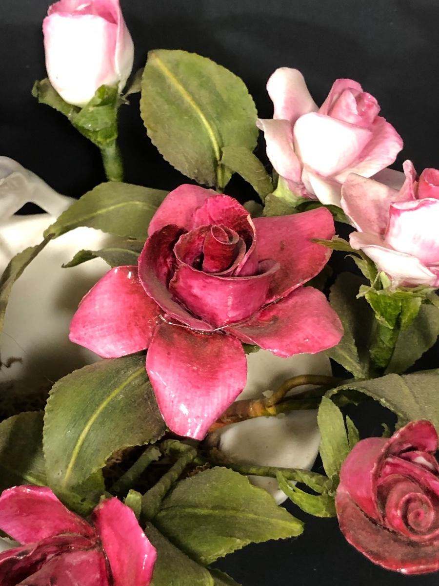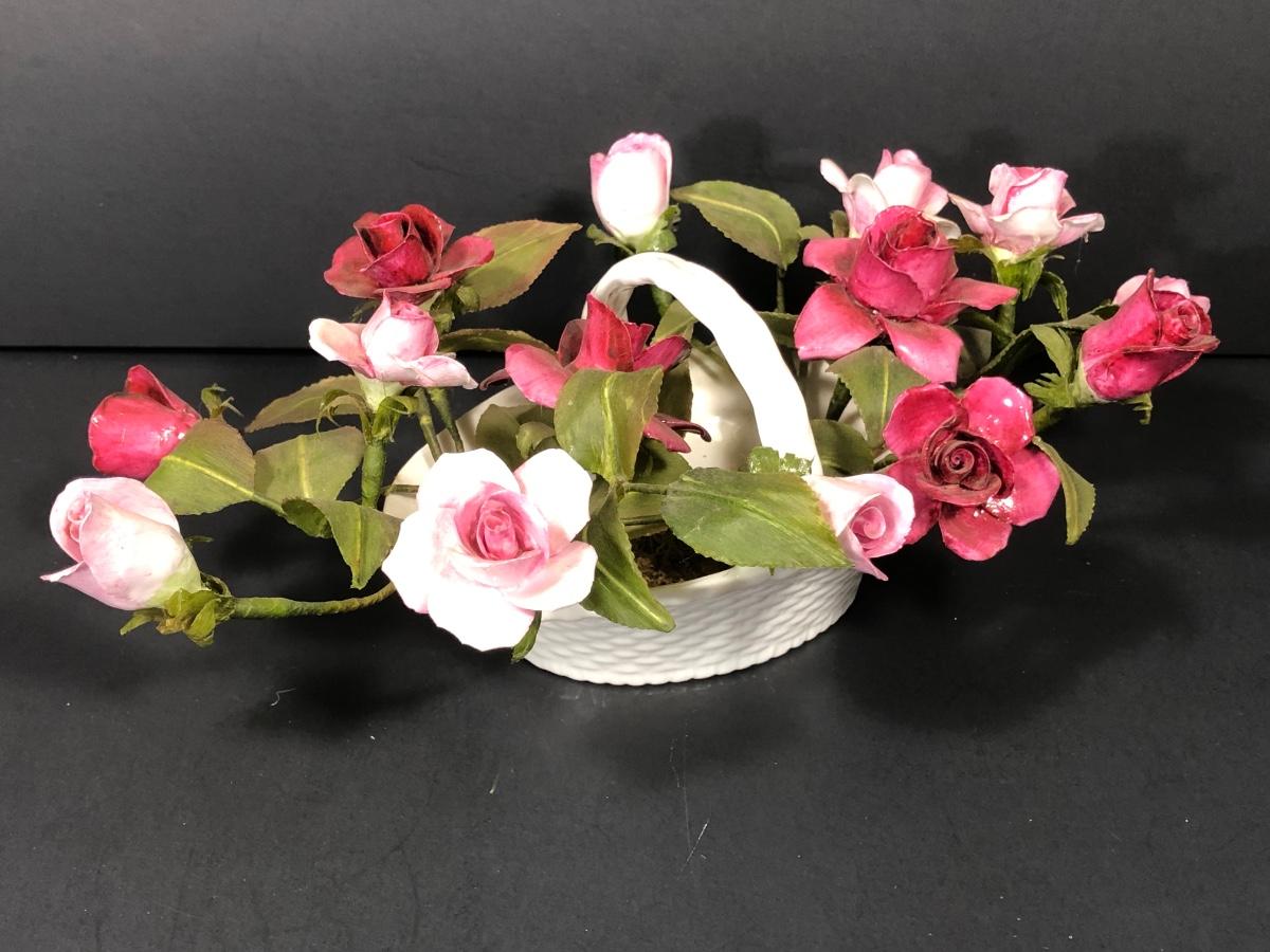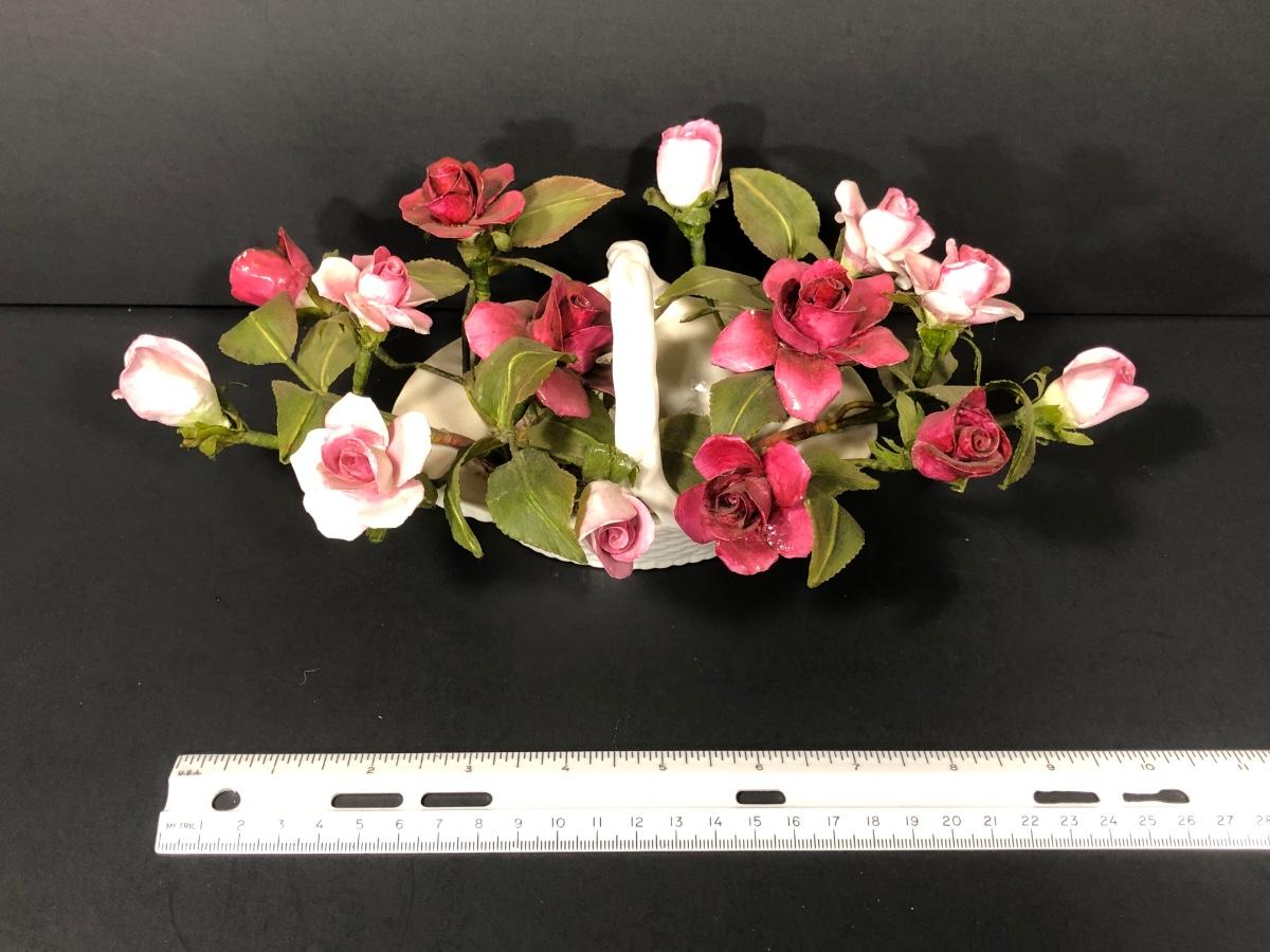 Fine bone china basket of red and pink flowers made in Staffordshire England.
