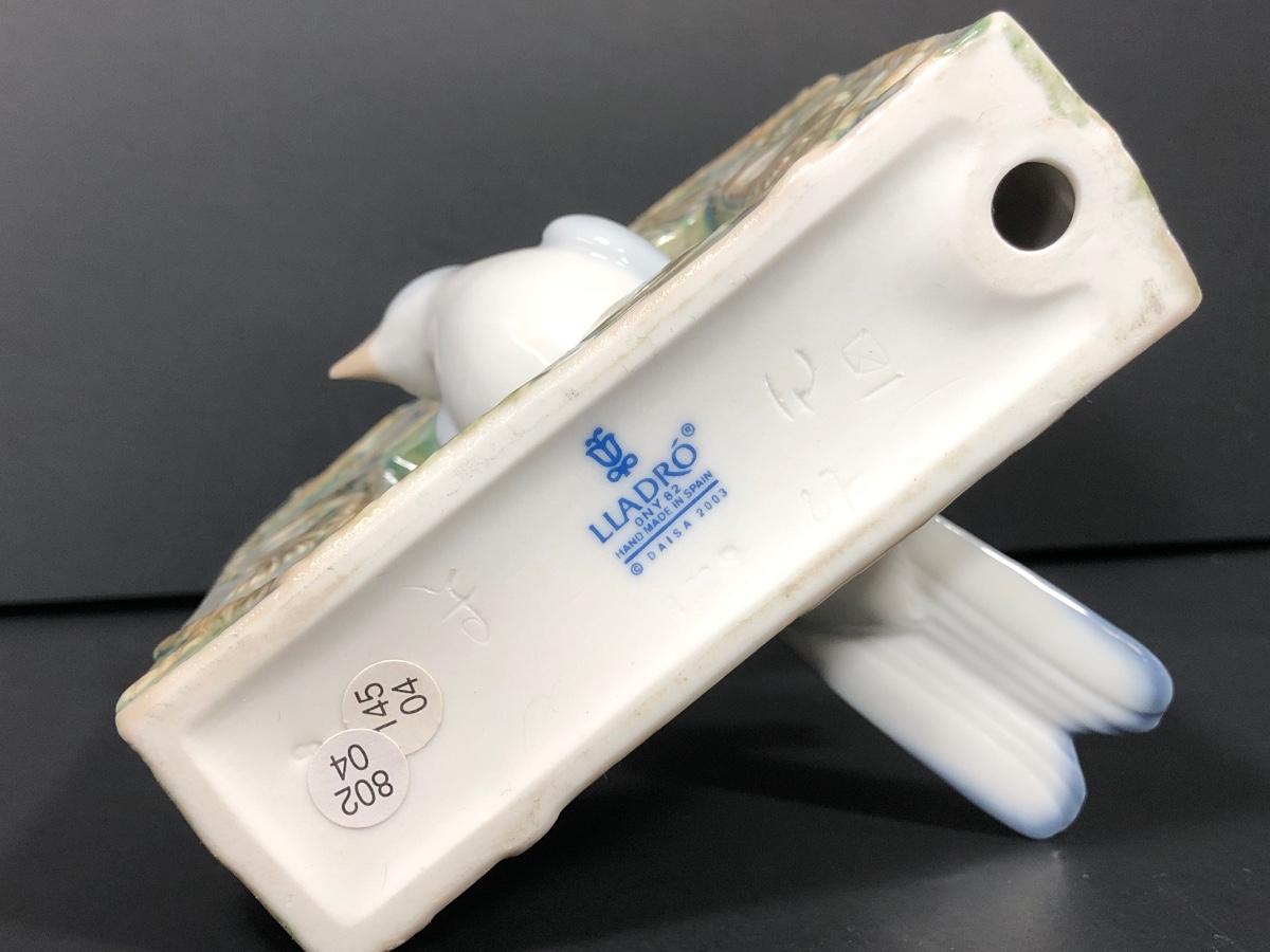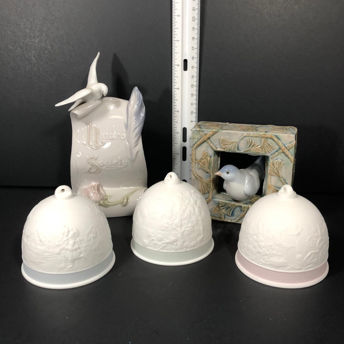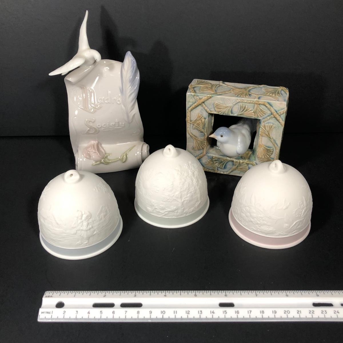 Lladró Society Scroll, 1998. Lladró framed bird, 2003. Lladró Collector Society bells from 1991, 1992, and 1994. All handmade in Spain.