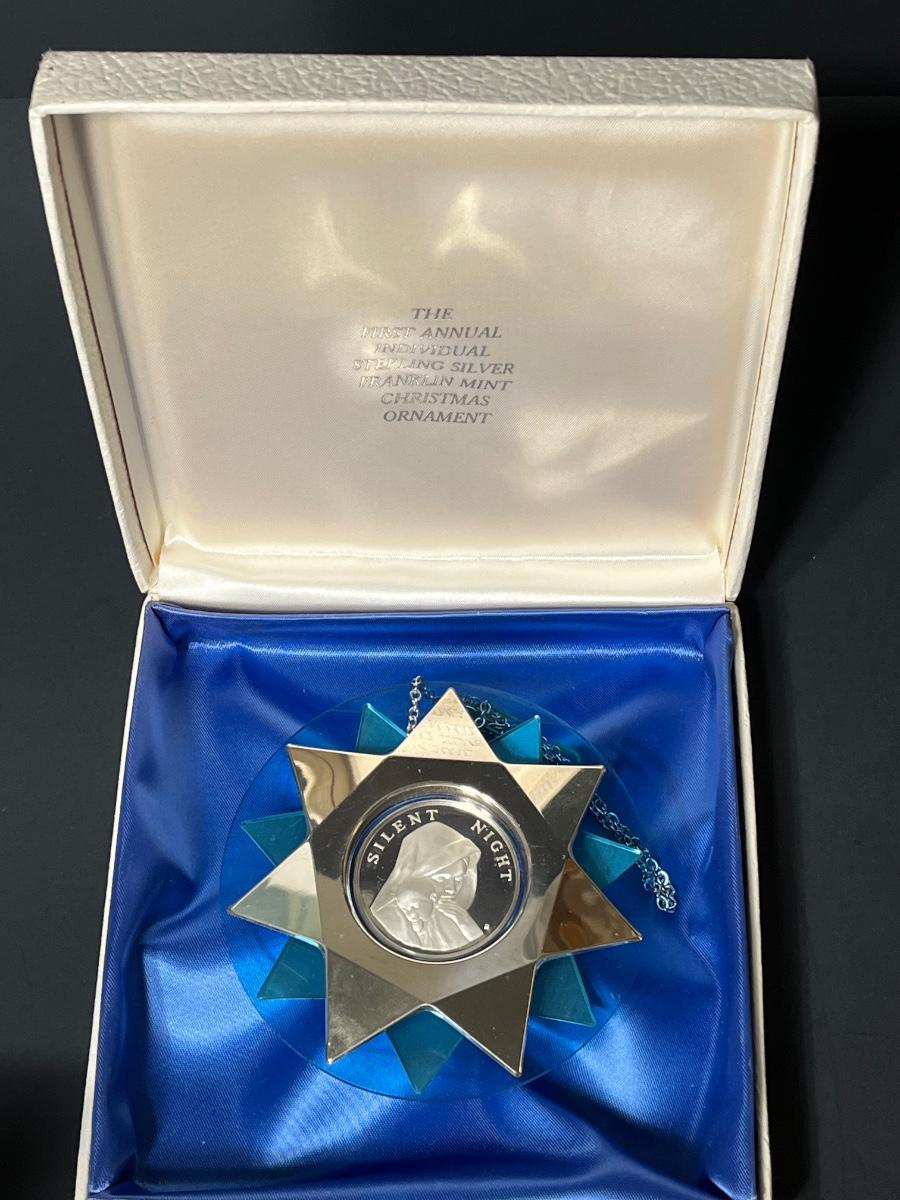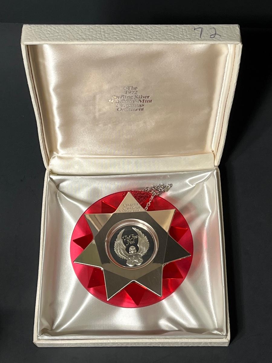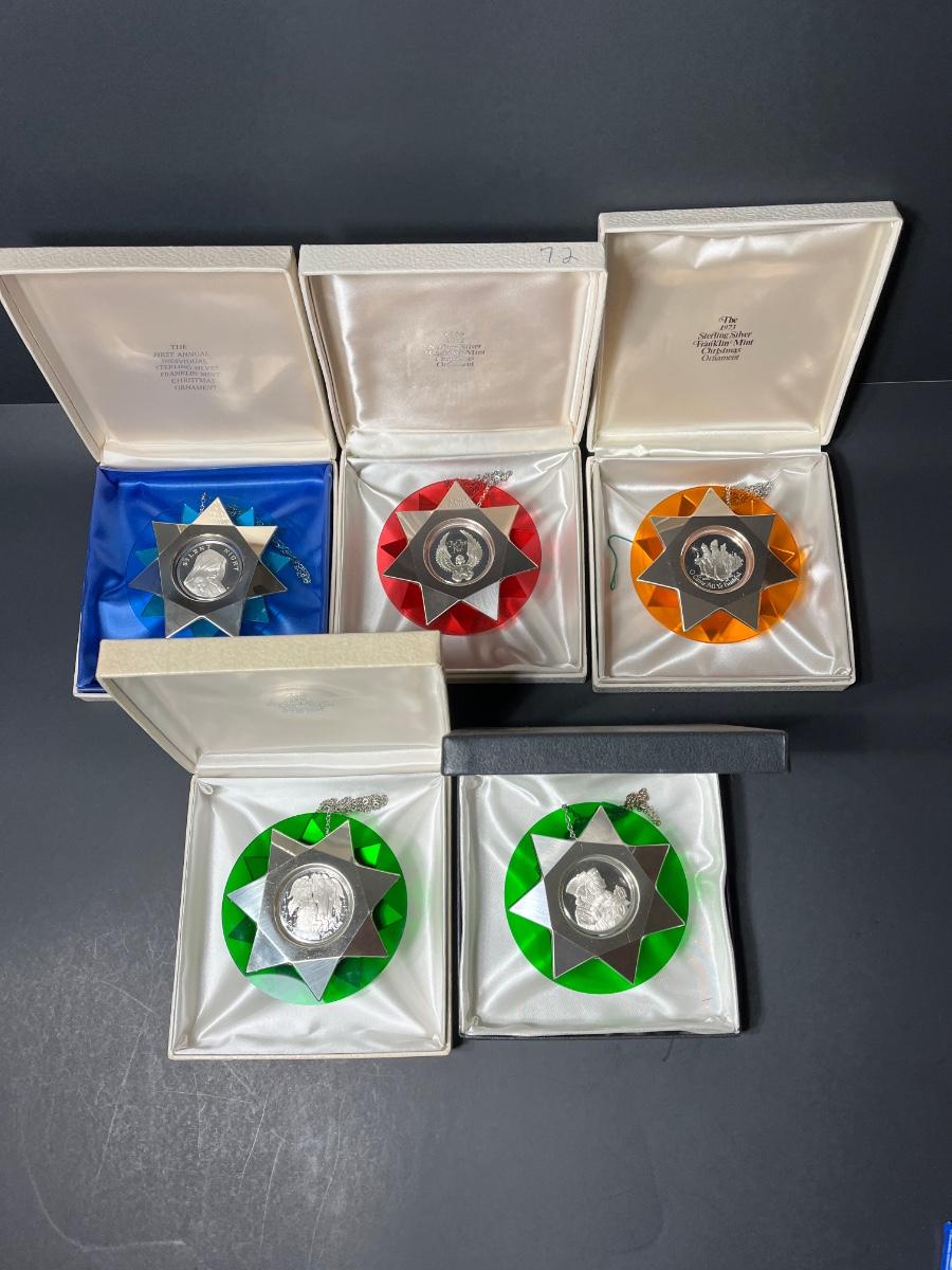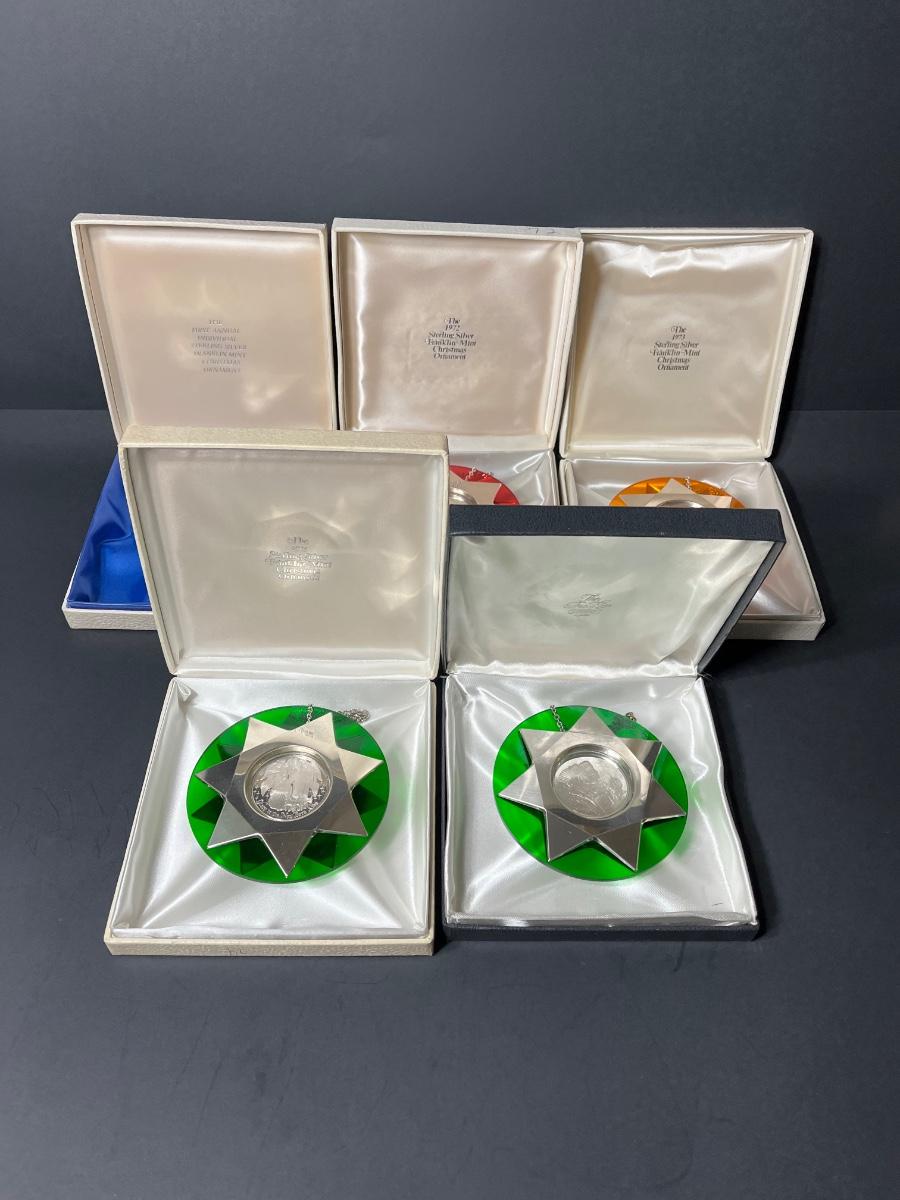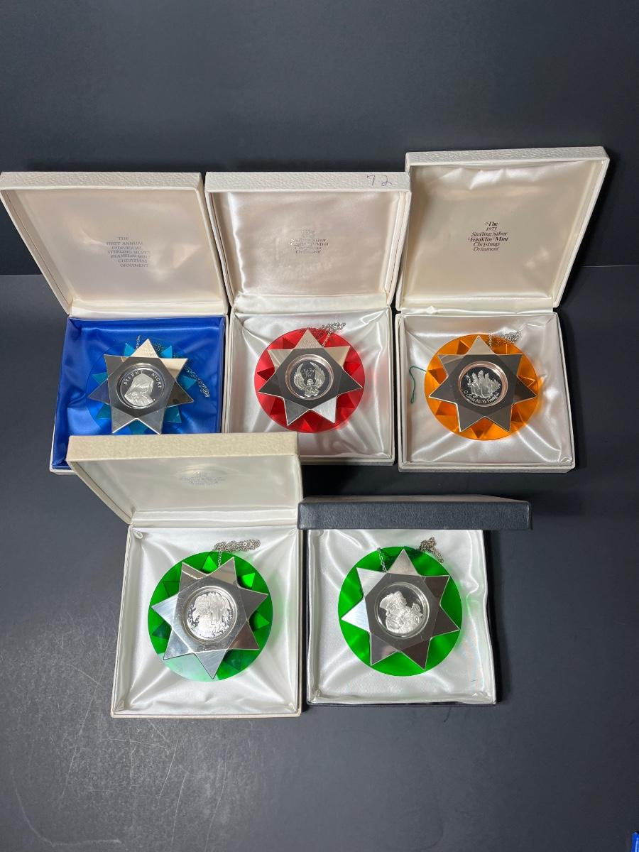 LOT 61: Franklin Mint Sterling Silver Medal Christmas Ornaments - 1971 - 1974, 1987