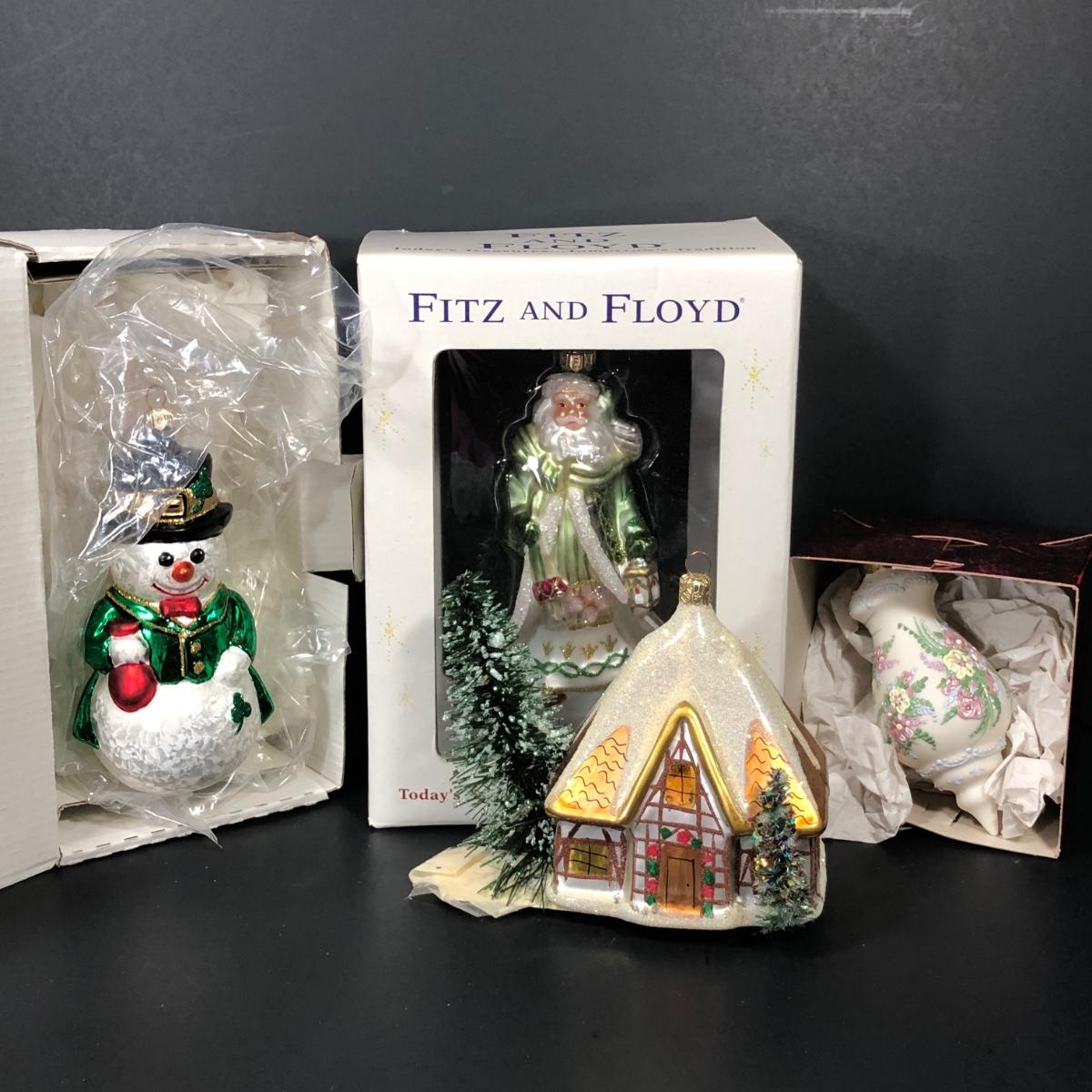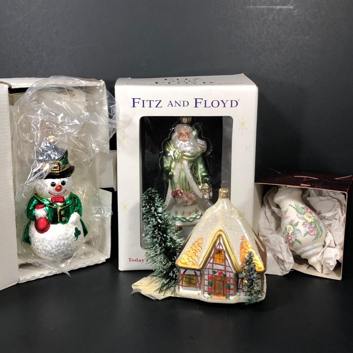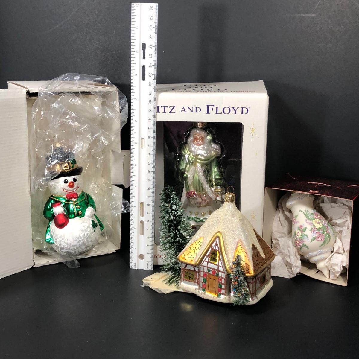 Includes packaged Fitz & Floyd Santa ornament, a Christopher Radko house ornament named "Snowed Inn," 1995 Rhys-Rivit ornament and a Snowman ornament made in Poland.