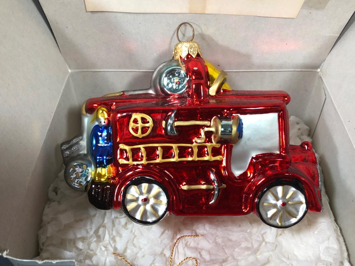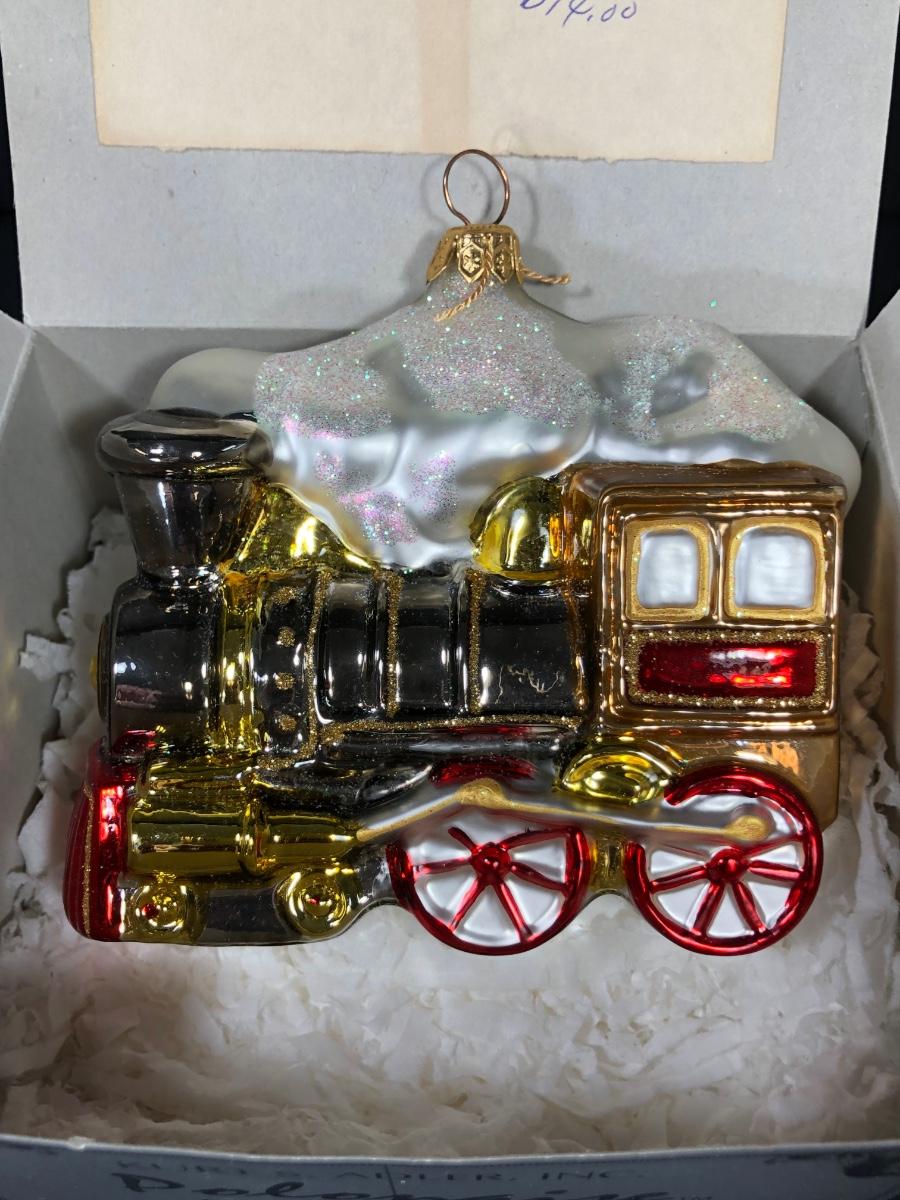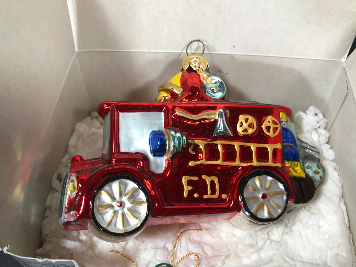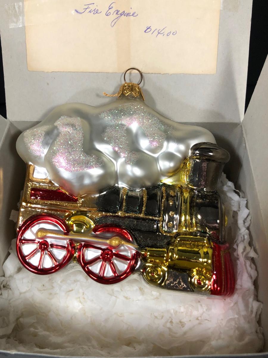 Includes 2 ornaments in boxes: fire engine & large locomotive.
