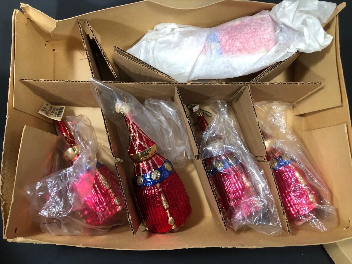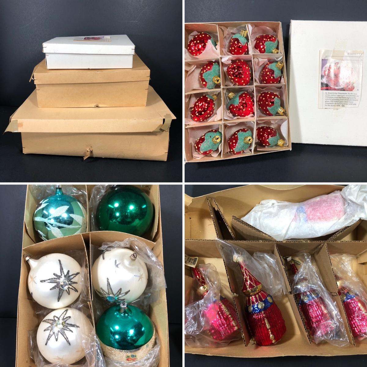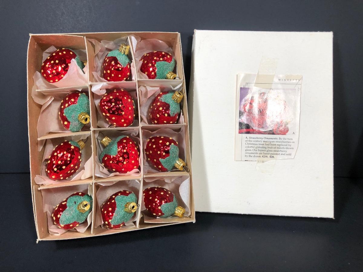 Includes a set of 12 strawberry ornaments from Winterthur Museum. A set of five old world tassel ornaments made in Poland. Six bulbs marked West Germany, Austria, and USA.