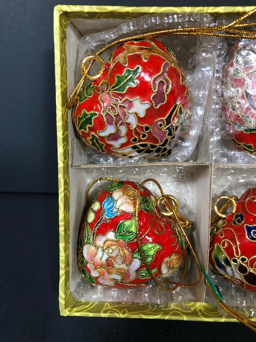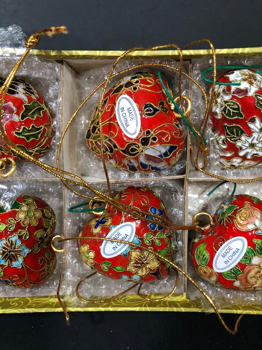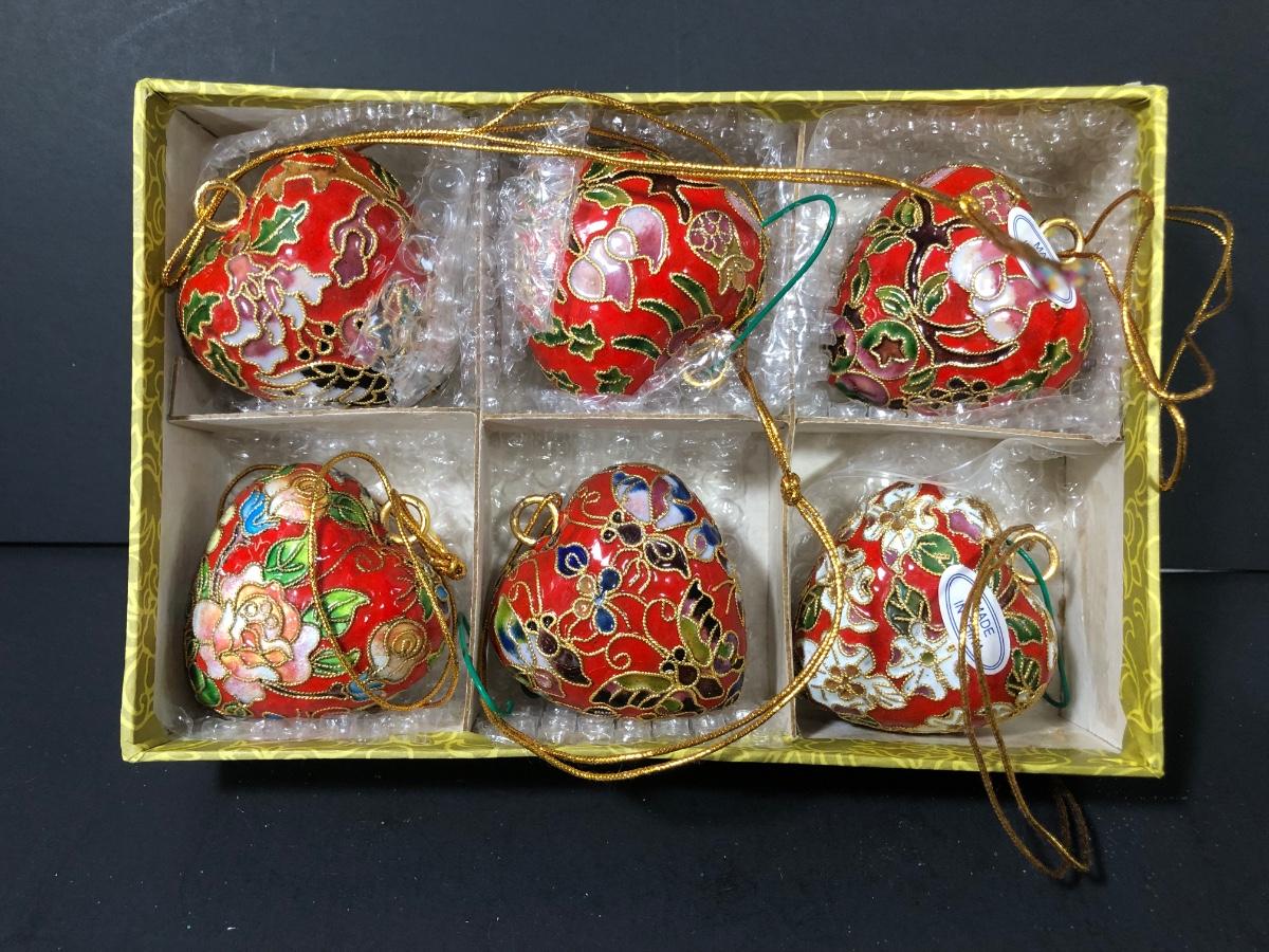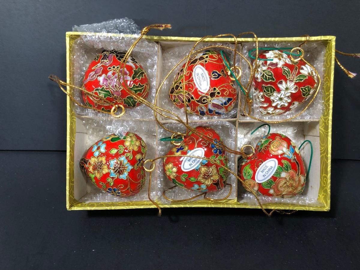 Includes two sets of 6 floral patterned red heart ornaments decorated with gold filigree in an Asian style.