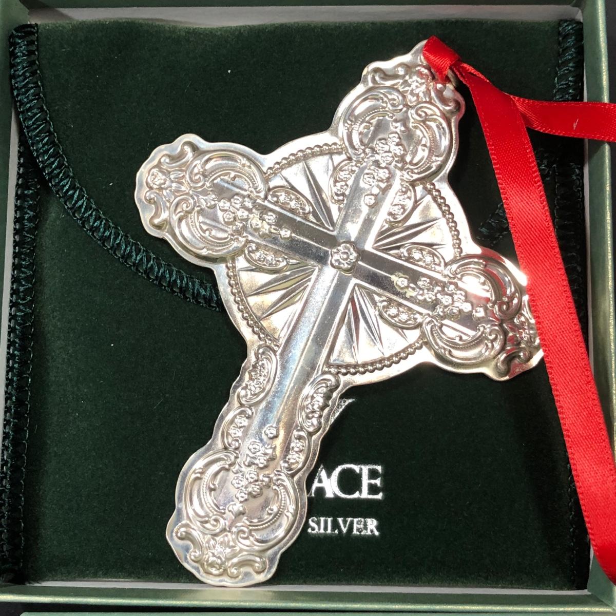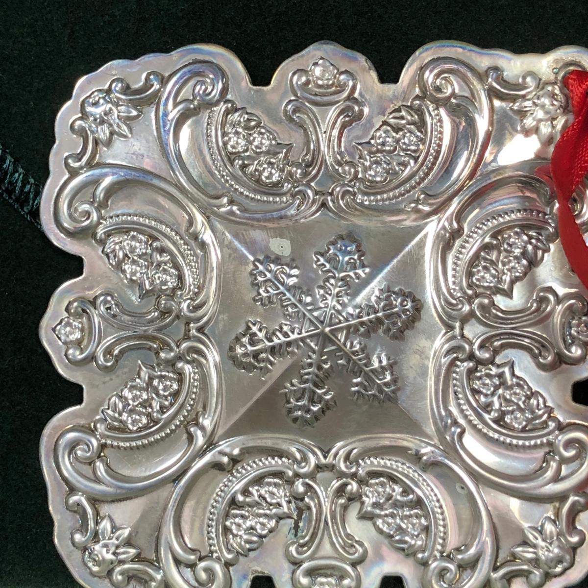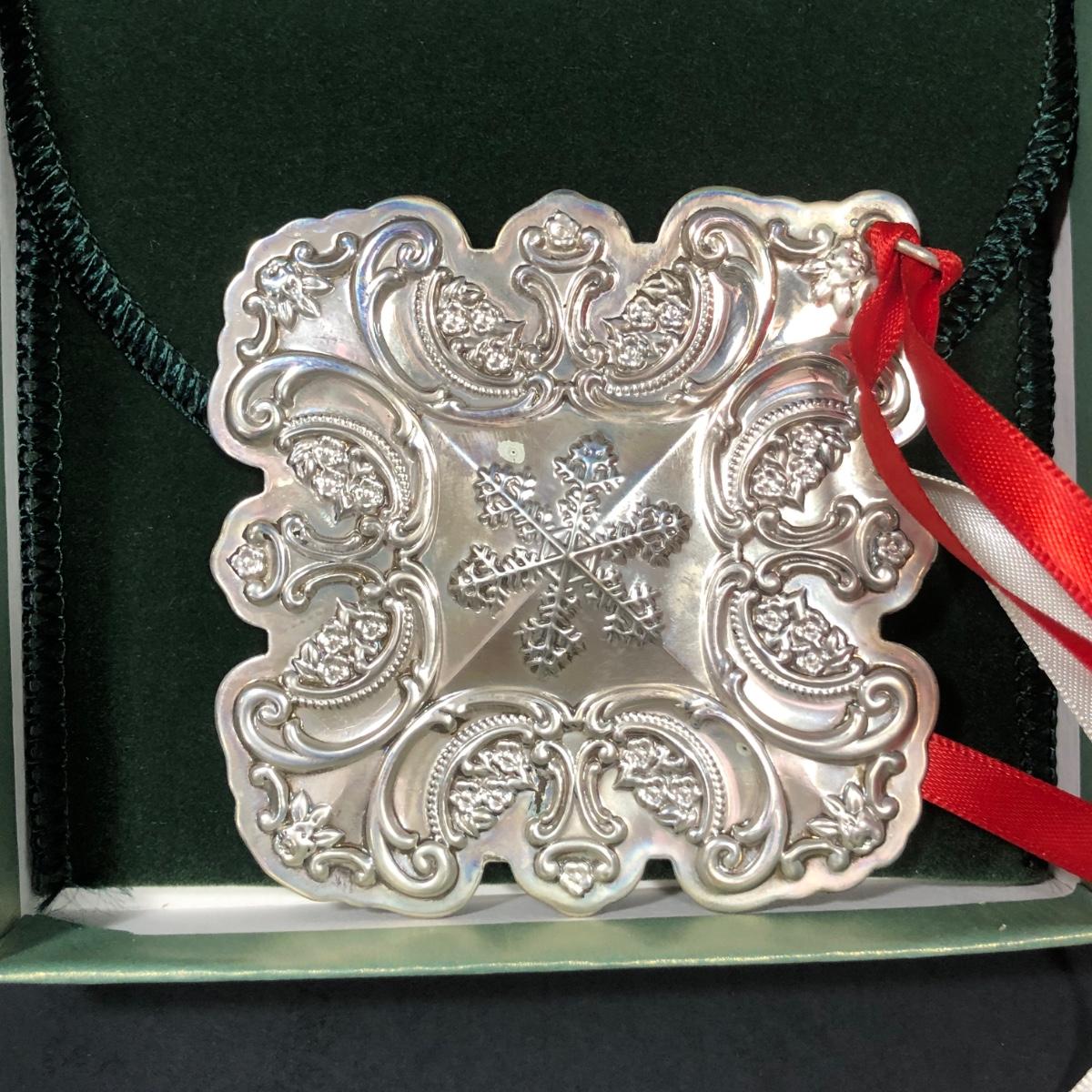 12th Edition Annual Grande Baroque Sterling Silver Snowflake Ornament. 10th Anniversary Edition Annual Sterling Silver Songs of Christmas Ornament, representing "The First Noel". 14th Edition Annual Grande Baroque Sterling Silver Cross Ornament. All include their original cloth bags and boxes.