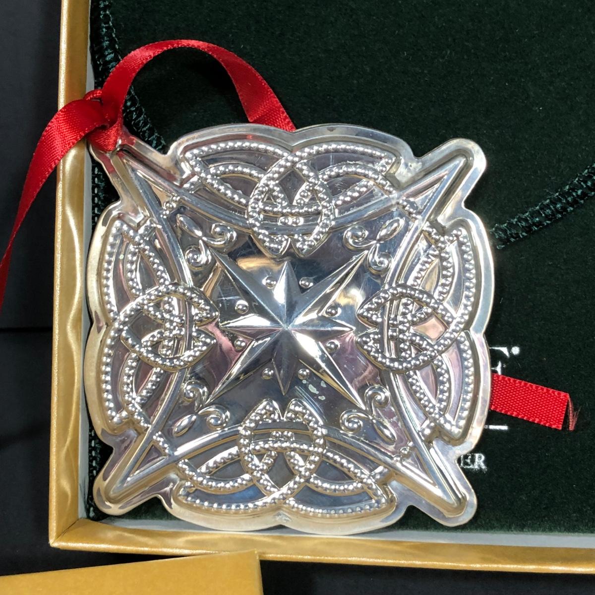 20th Anniversary Edition Annual Old Masters Sterling Silver Snowflake Ornament. 10th Anniversary Edition Annual Sterling Silver Celtic Ornament.